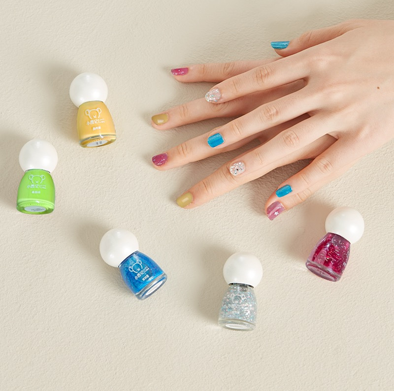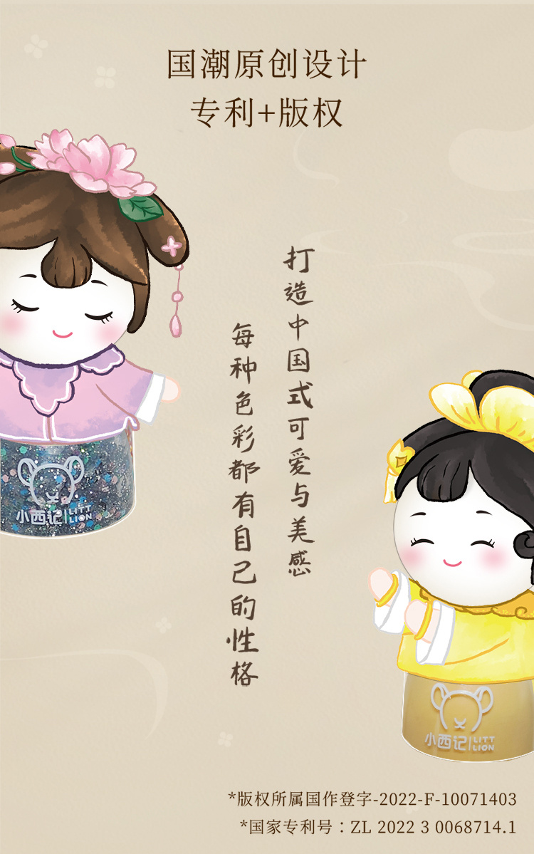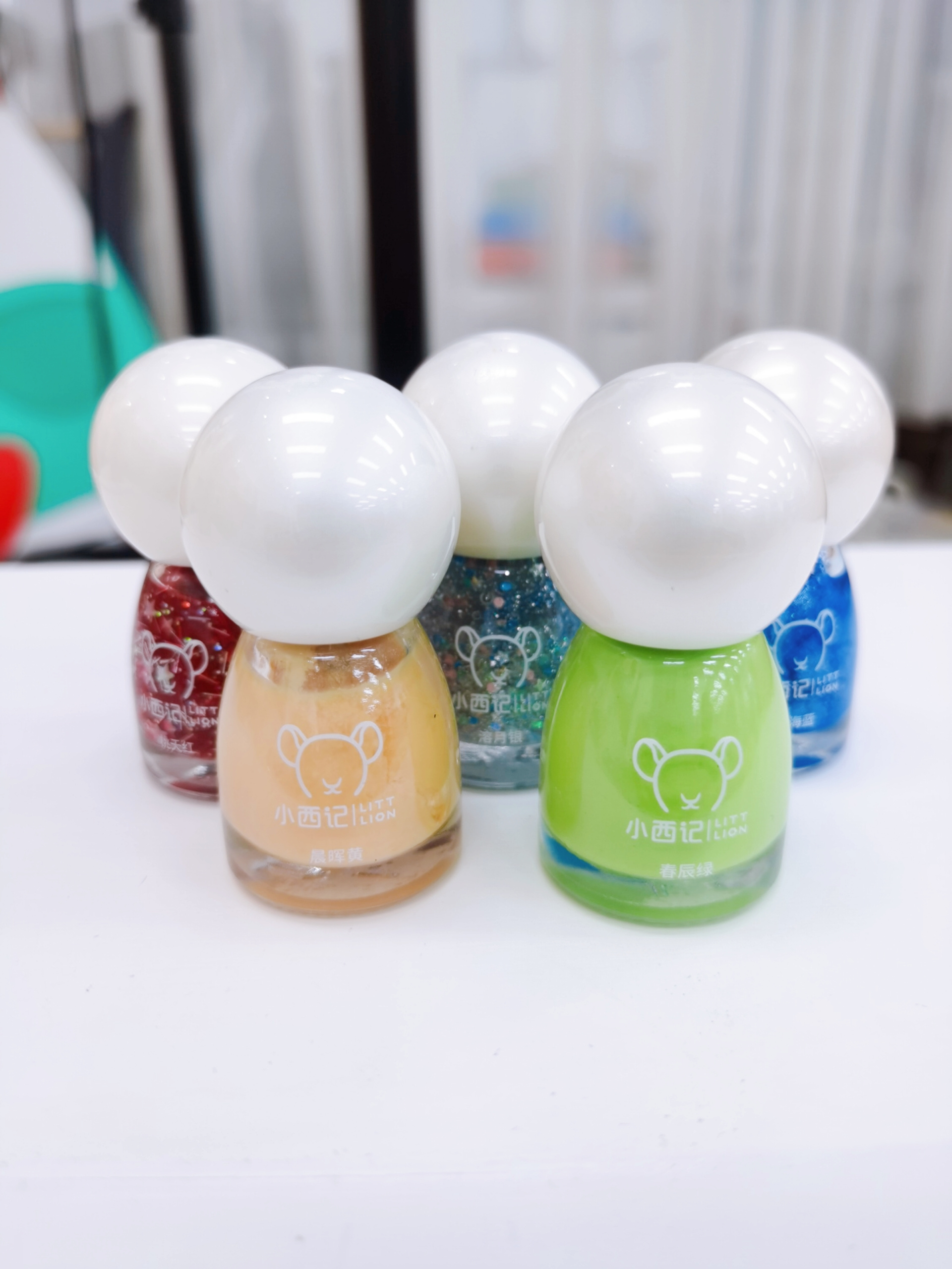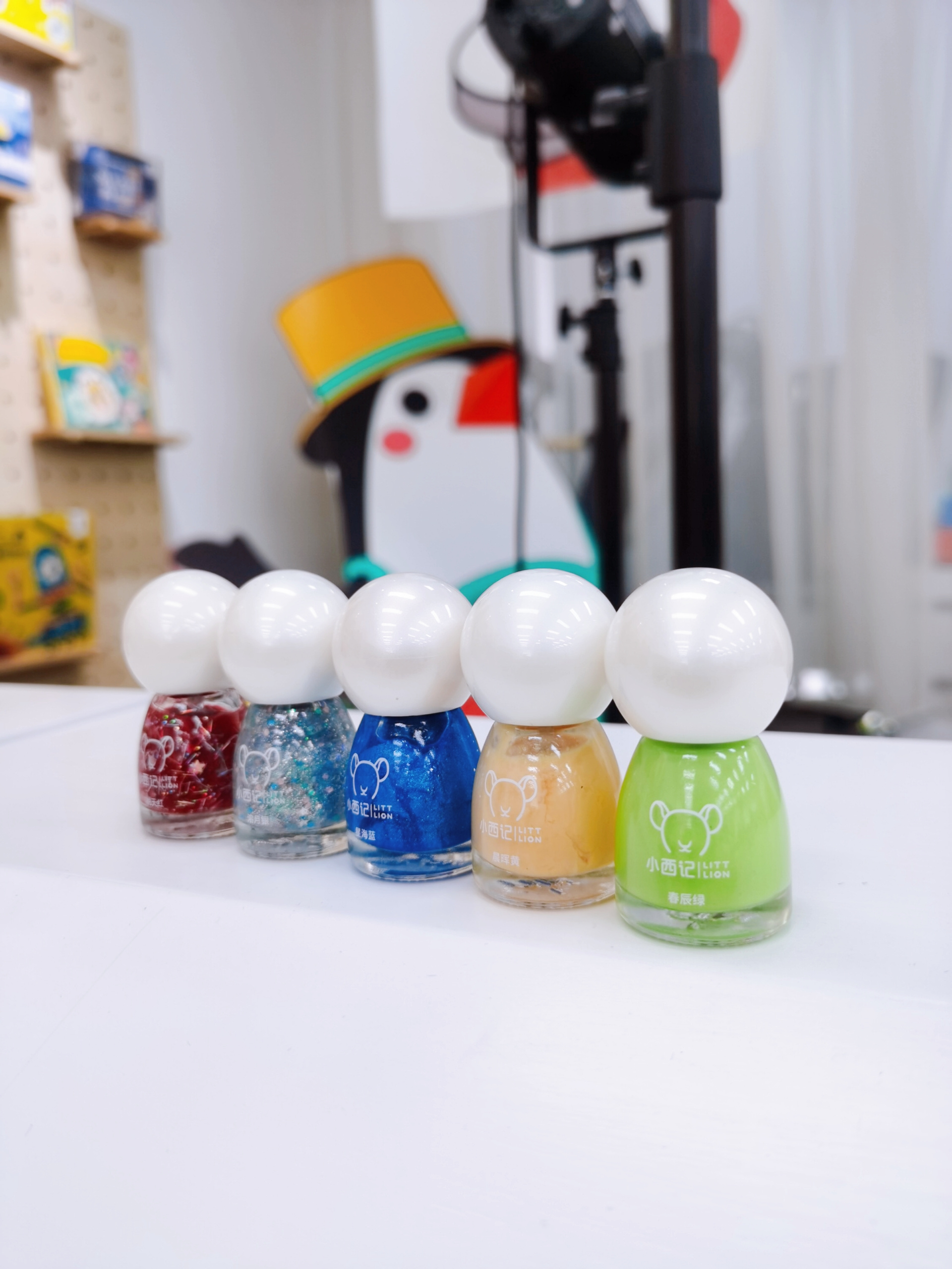 五款萌嘟嘟专利原创国潮角色 打造中国式可爱与美感🥰 桃夭红/晨晖黄/溶月银/春辰绿/星海蓝 颜色饱满馥郁,符合中国儿童化妆品认证🏆 质检报告也都齐全,可以放心用! 轻松易上手,宝贝爱不停 让宝宝在无忧无虑的年纪 刷涂流光溢彩的色 于指尖迸发灵感~发现天性~