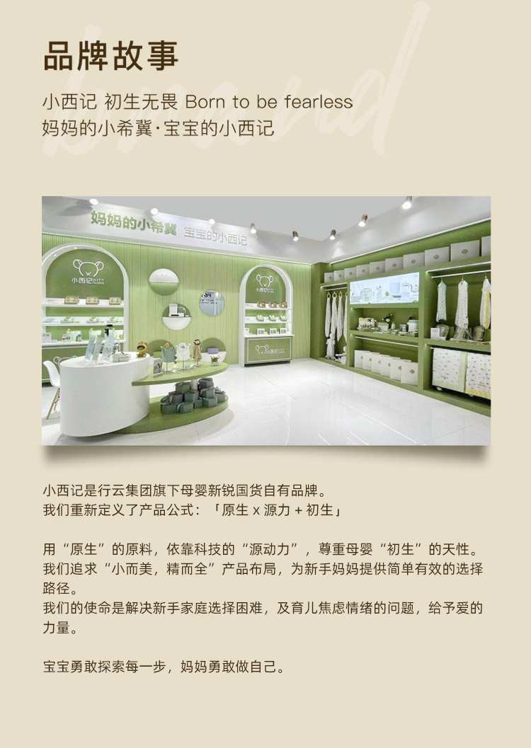 “妈妈的小希冀,宝宝的小西记!” 小西记是一个精致母婴新锐国货品牌 是行云集团旗下的母婴品牌 秉持“小而美,精而全”的布局 从解决现代育儿焦虑问题出发 在产品上为家长提供更有效的服务与方案 于品牌层面擅长对话年轻母婴群体 形成能互动共鸣的粉丝效应 以创造品牌长期价值