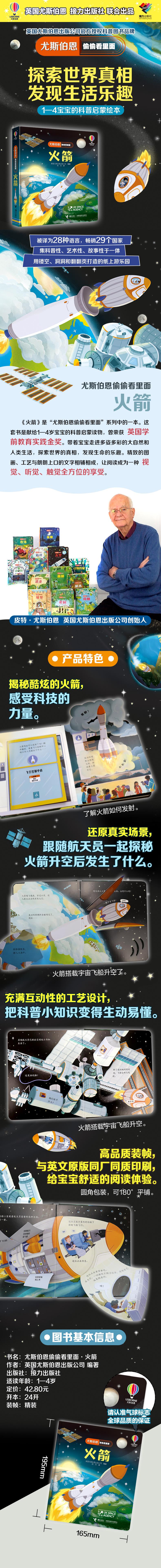 本书是尤斯伯恩偷偷看里面系列新书,以孩子喜爱的火箭为主题,轻松易懂的科普内容,带着孩子去揭秘火箭,了解火箭的内部结构,理解一些装置的工作原理,体验火箭如何升入太空、如何返回地球,边阅读边感受科技的力量。