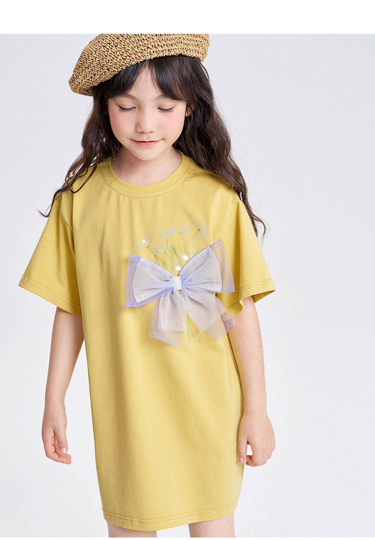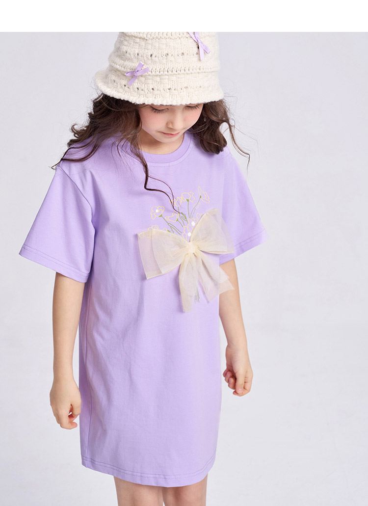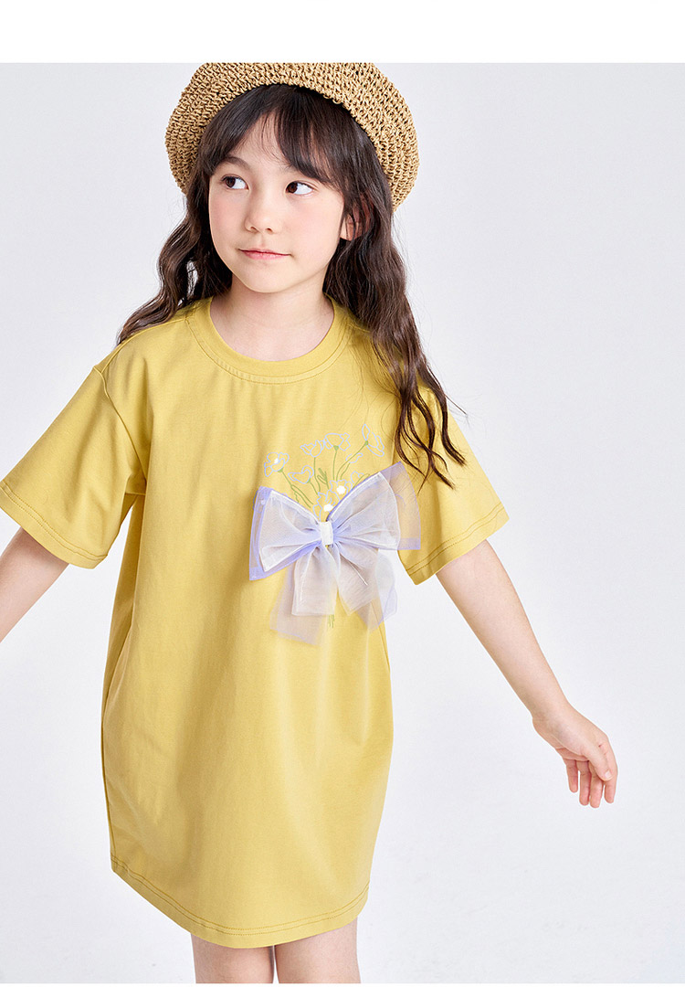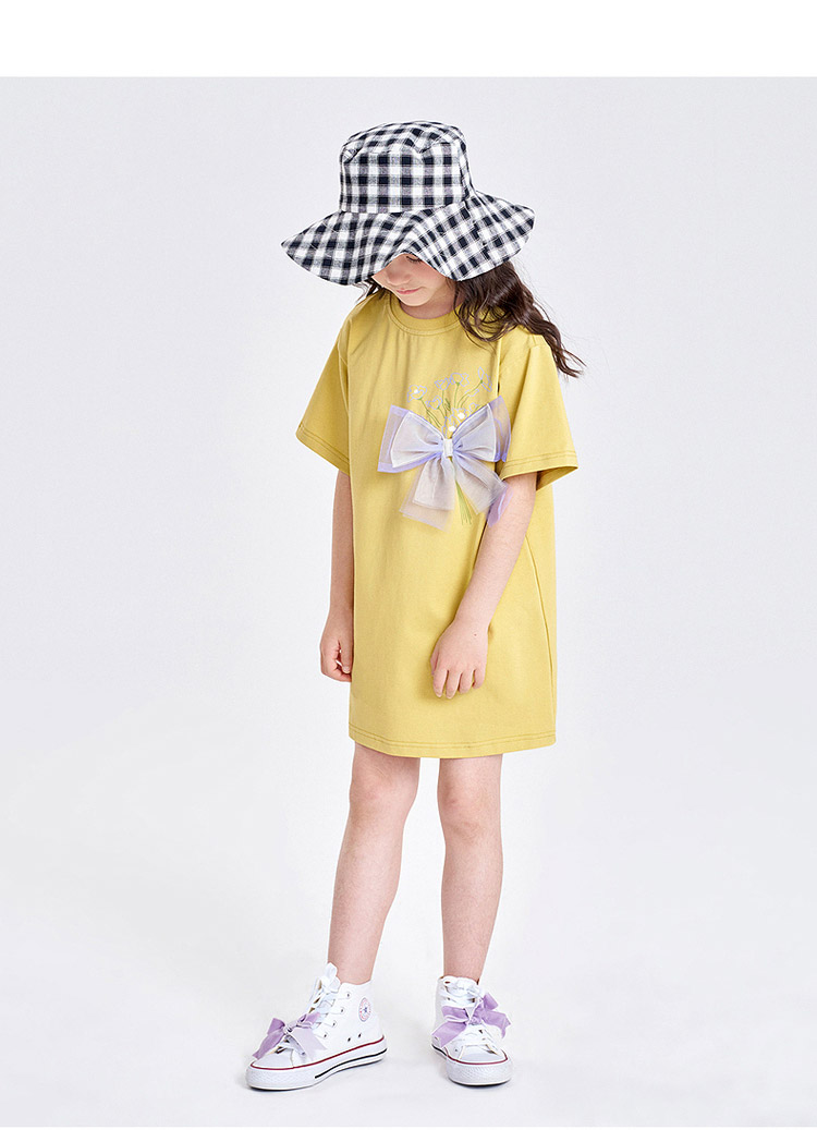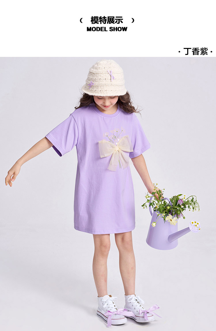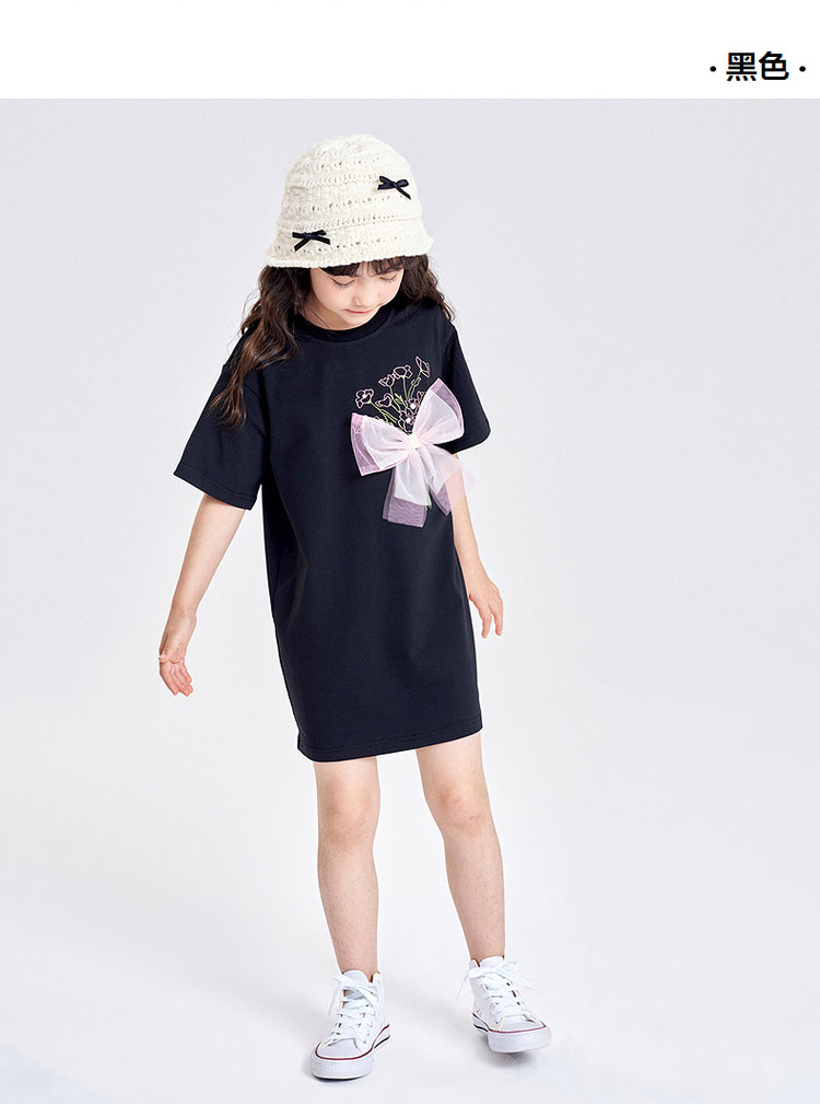 笛莎千与2025夏季新款女童时尚休闲蝴蝶结短袖针织连衣裙