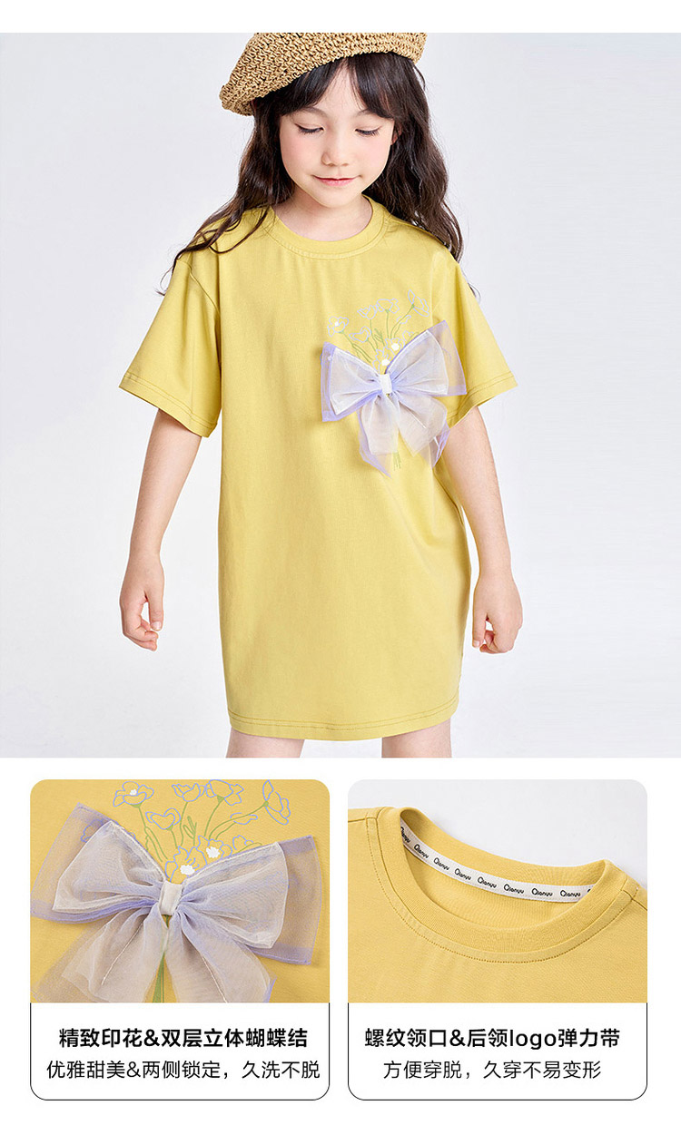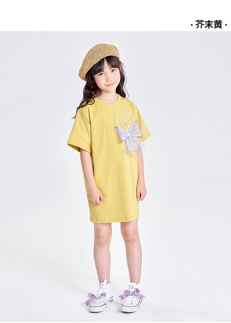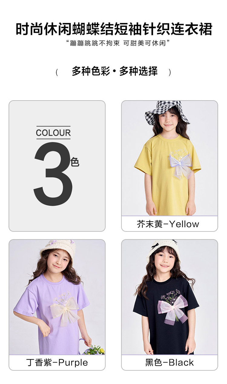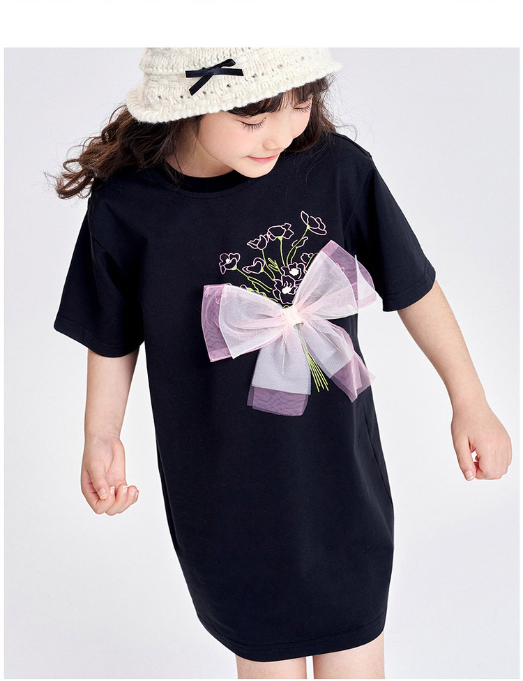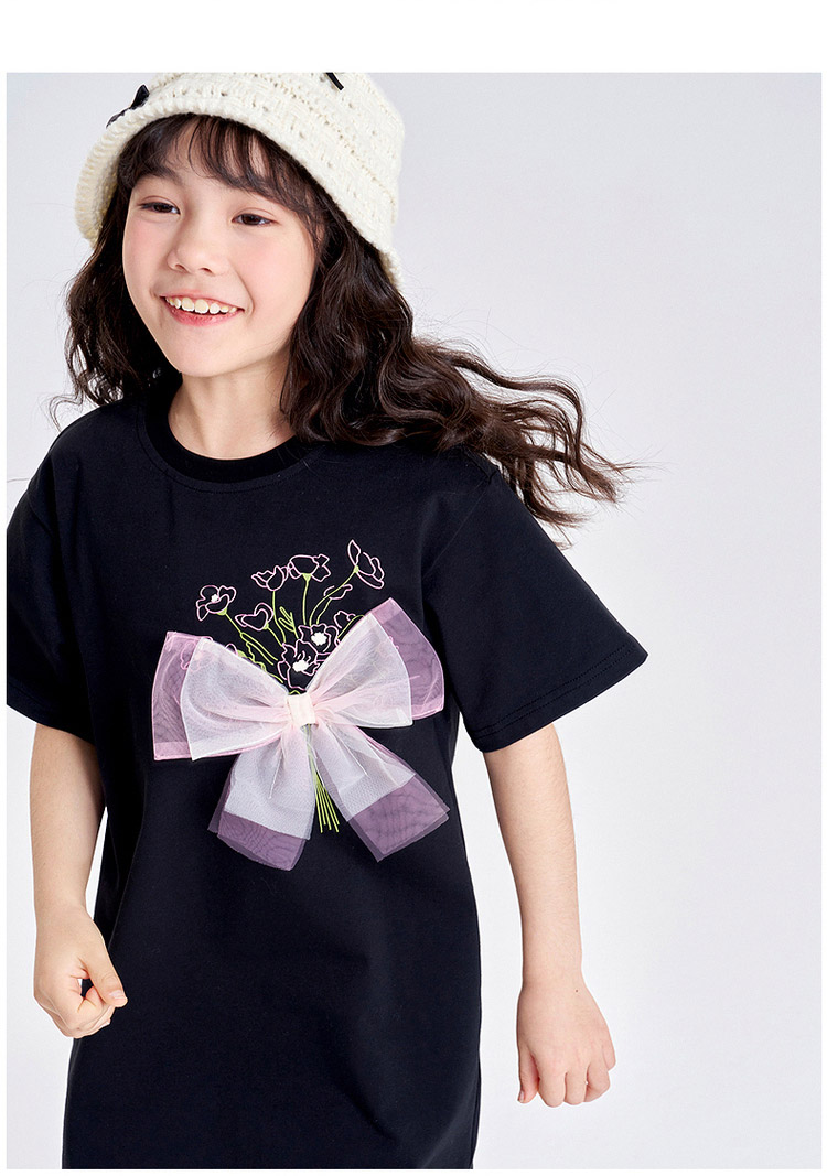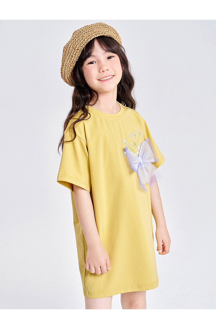 笛莎千与2025夏季新款女童时尚休闲蝴蝶结短袖针织连衣裙