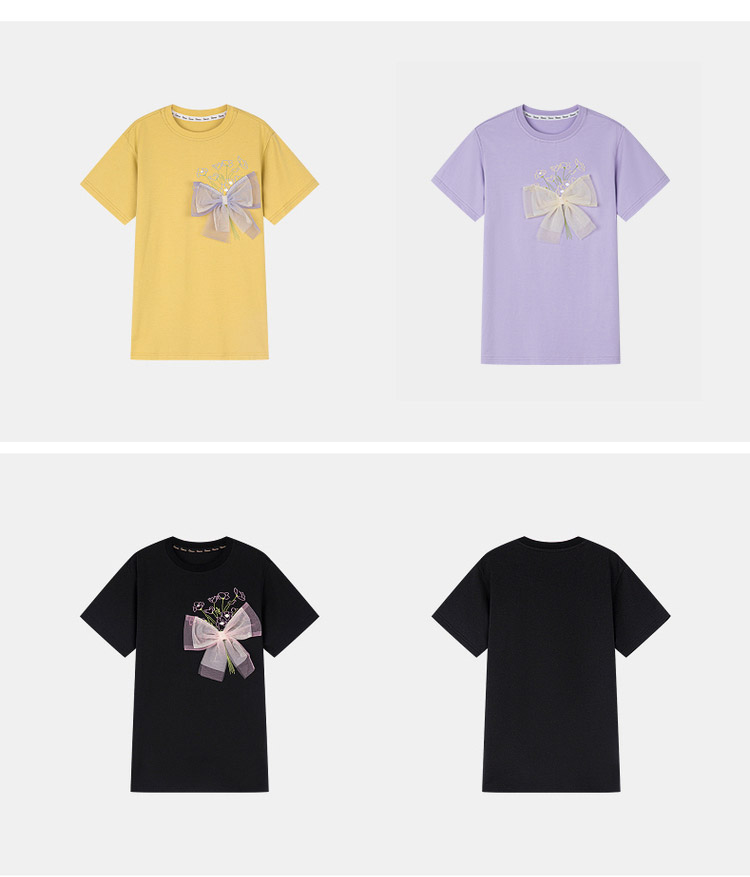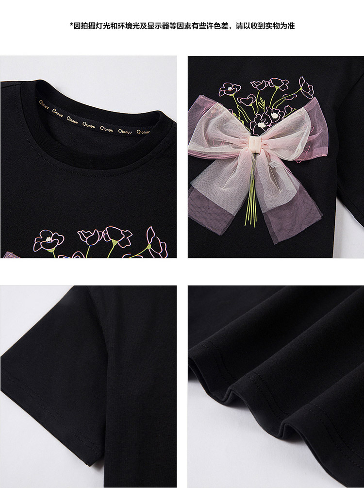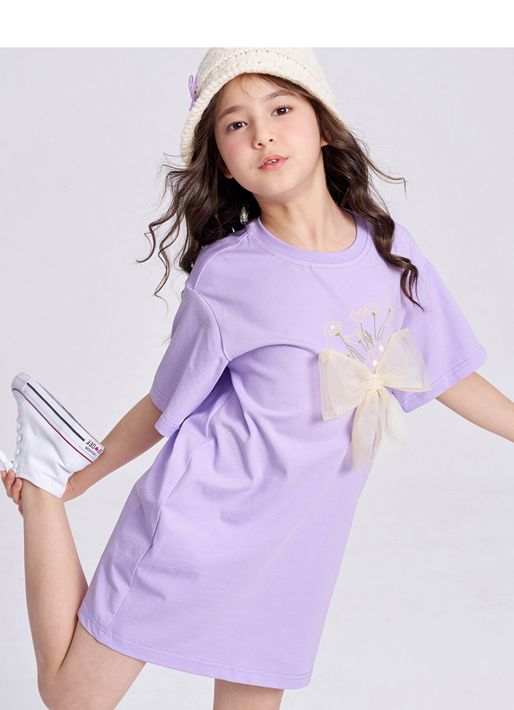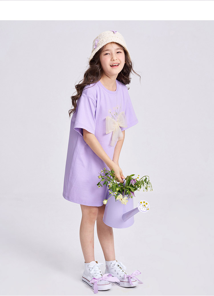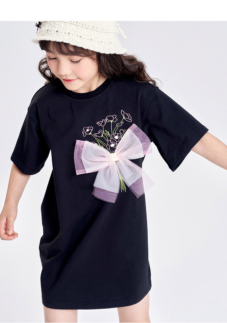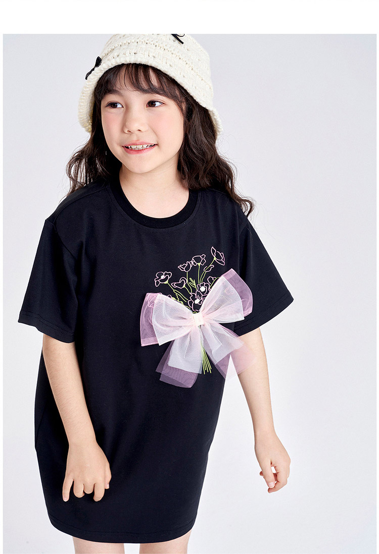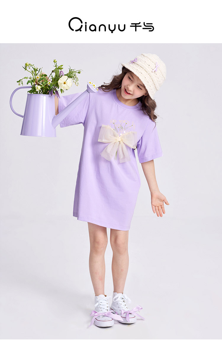 笛莎千与2025夏季新款女童时尚休闲蝴蝶结短袖针织连衣裙