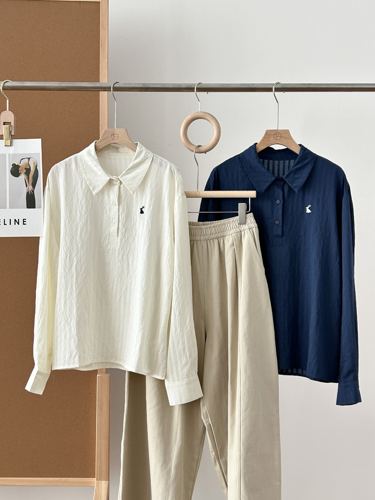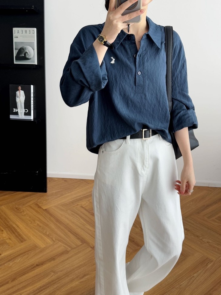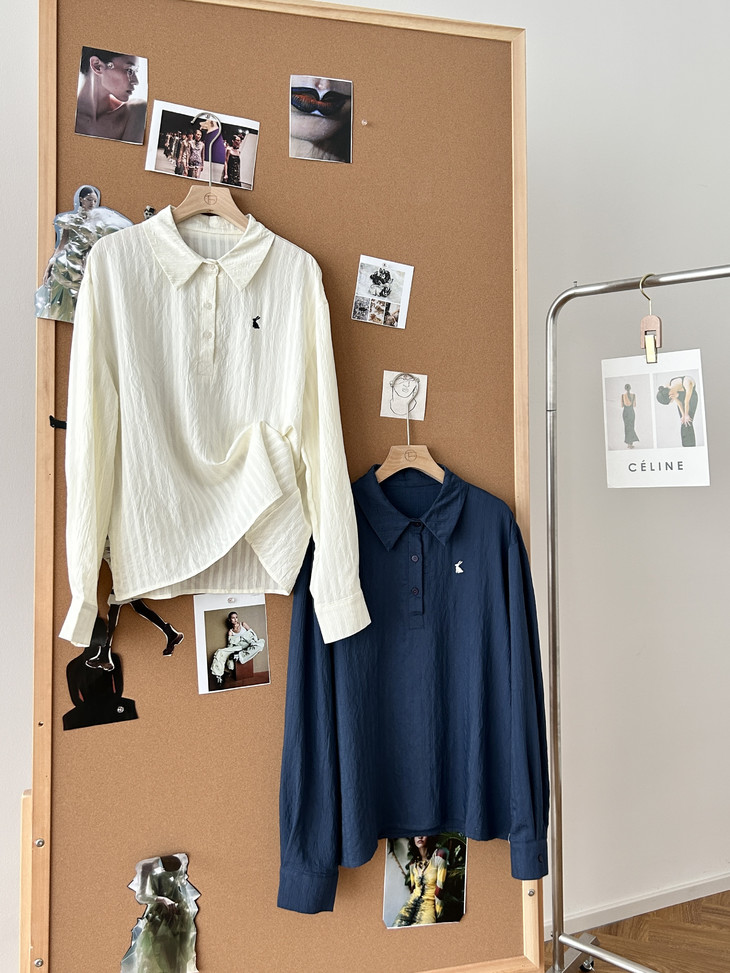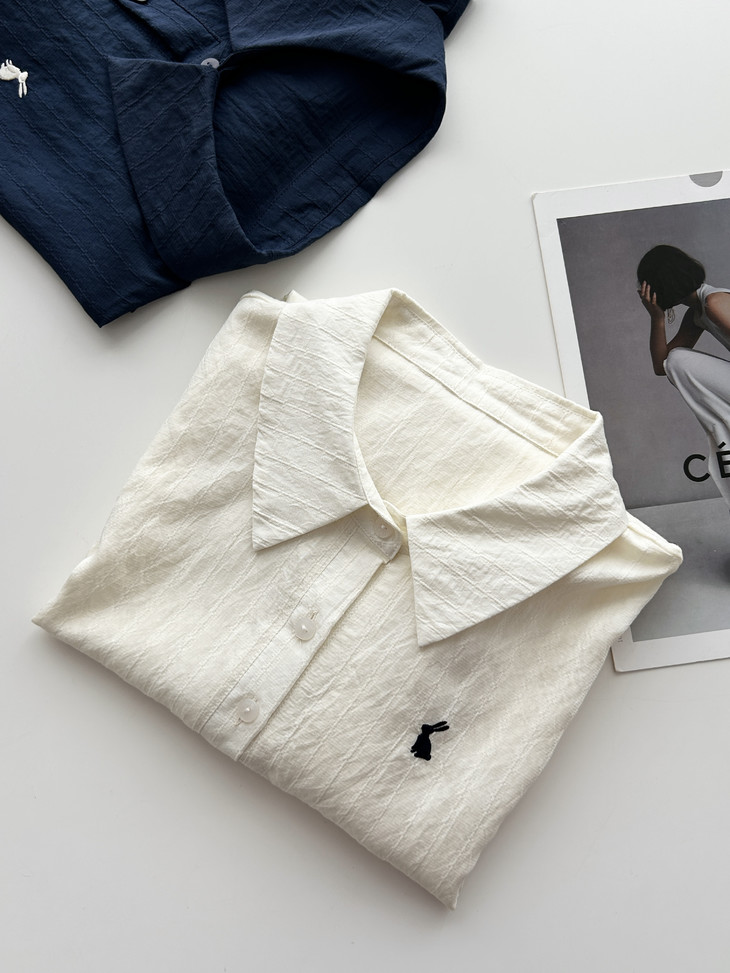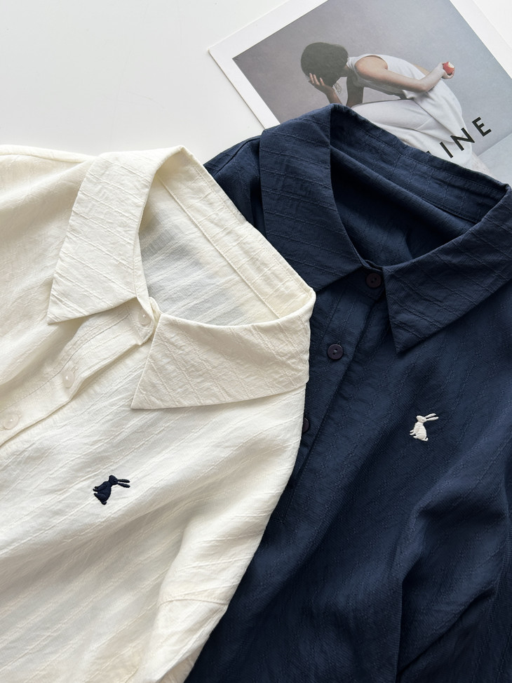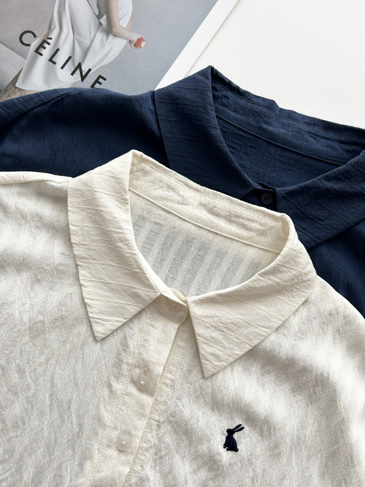 -团长碎碎念- 挖到宝了!这件早秋衬衫穿上身直接瘦一圈! 小兔刺绣长袖POLO衬衫真的绝了! 水洗工艺处理过的面料软糯得像棉花糖 贴身穿清凉透气,舒服到不想脱! 最戳我的是那个半开襟POLO领 巧妙遮住锁骨肉肉,搭配精致小兔刺绣 气质瞬间拉满,上班约会都能轻松hold住!. 除了原有的百搭清爽米白色! 特别增加了显瘦的藏青色,两个颜色都很绝! 我个人直接all in! 小众不撞款,通勤约会都百搭!答应我都去穿!