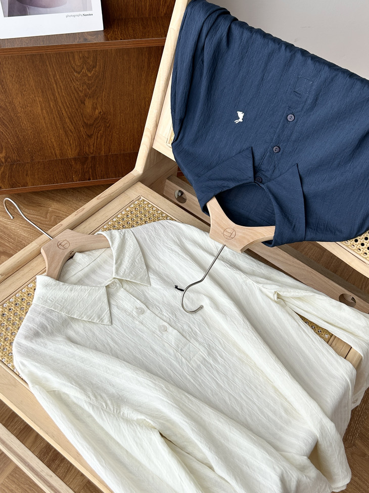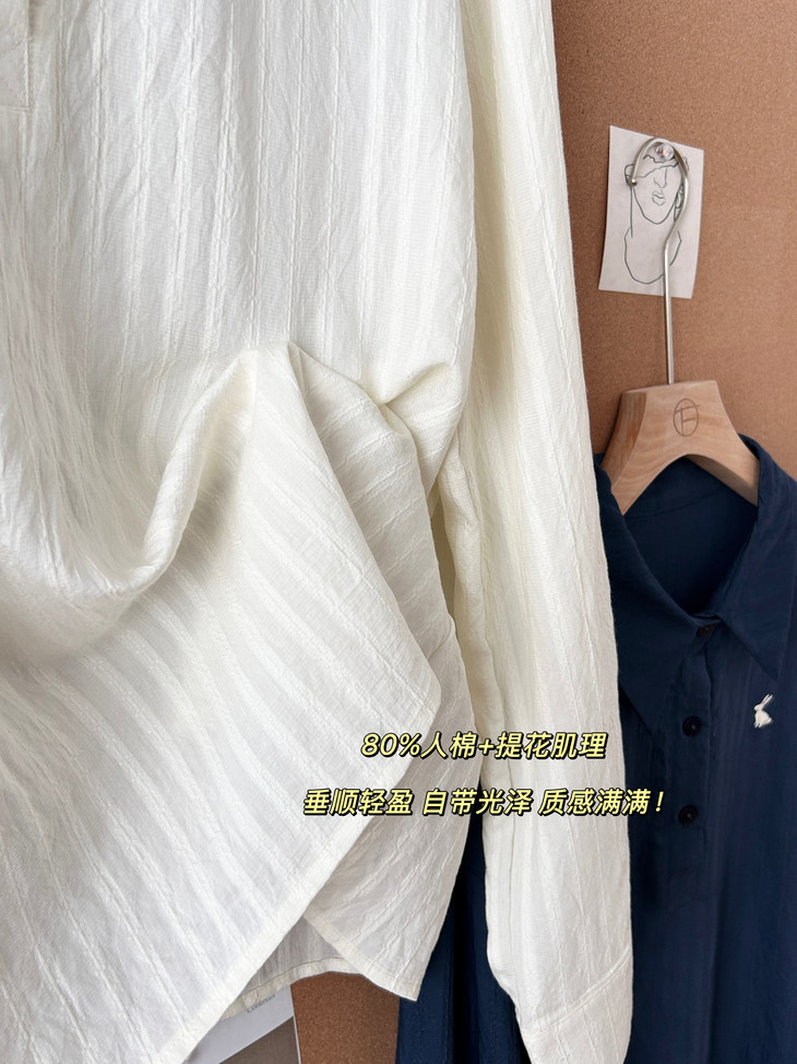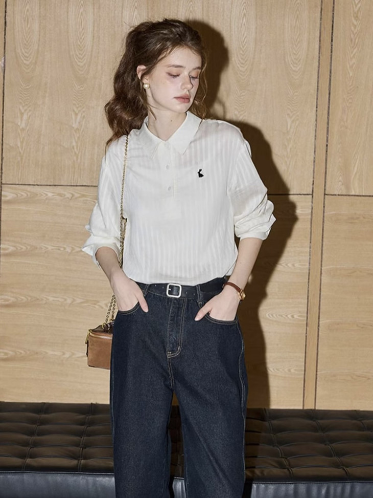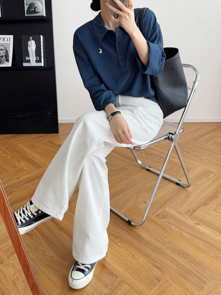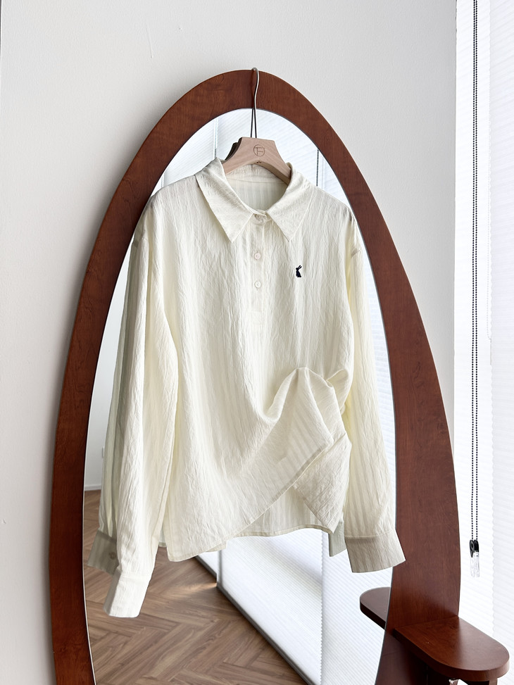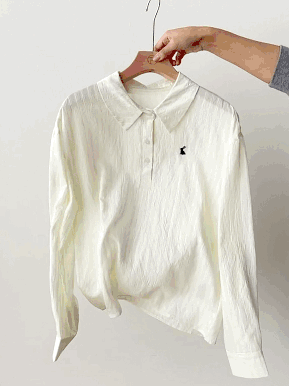 -团长碎碎念- 挖到宝了!这件早秋衬衫穿上身直接瘦一圈! 小兔刺绣长袖POLO衬衫真的绝了! 水洗工艺处理过的面料软糯得像棉花糖 贴身穿清凉透气,舒服到不想脱! 最戳我的是那个半开襟POLO领 巧妙遮住锁骨肉肉,搭配精致小兔刺绣 气质瞬间拉满,上班约会都能轻松hold住!. 除了原有的百搭清爽米白色! 特别增加了显瘦的藏青色,两个颜色都很绝! 我个人直接all in! 小众不撞款,通勤约会都百搭!答应我都去穿!