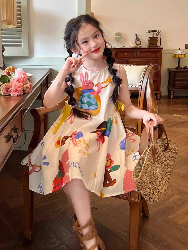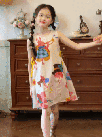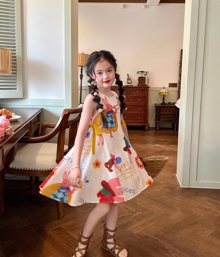️ 救命🆘这裙子也太漂亮了吧,谁能不爱?女儿们看到都为之疯狂每个女孩都想要,真的会欲罢不能! ✅这条连衣裙上的细节图案丰富多样。 主体图案是色彩鲜艳的小兔子, 穿着绿蓝配色的裙子,正吹着金色的小号 ,活力满满; 还有戴着彩色高帽的兔子形象,颇具俏皮感。 此外,裙子上散落着小熊、彩色圆点等装饰元素, 还印着“princess”等英文字样 , 整体营造出梦幻甜美的童话氛围。