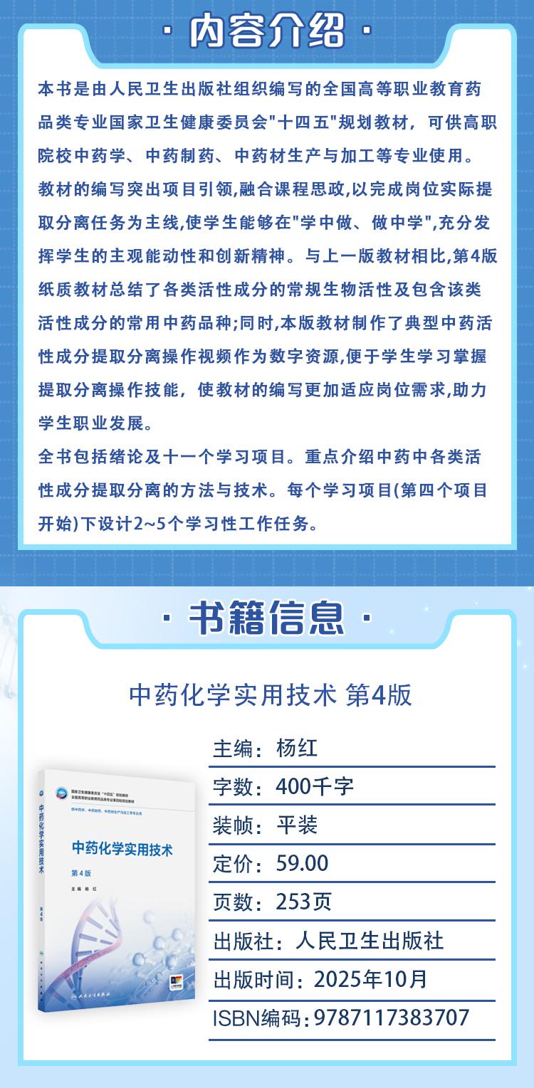 中药化学实用技术 第4四版 十四五规划教材 全国高等职业教育药品类专业第四轮规划教材 杨红 主编 9787117383707人民卫生出版社
