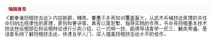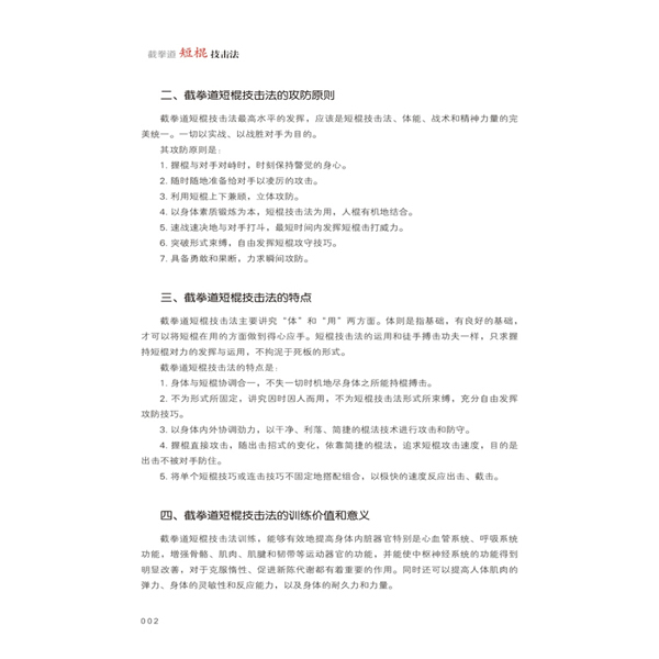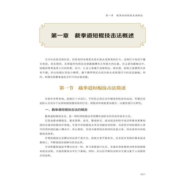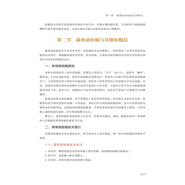 目 录 章 截拳道短棍技击法概述…001 节 截拳道短棍技击法简述…001 一、截拳道短棍技击法的概念…001 二、截拳道短棍技击法的攻防原则…002 三、截拳道短棍技击法的特点…002 四、截拳道短棍技击法的训练价值和意义…002 第二节 截拳道短棍与其他短棍法…003 一、菲律宾短棍源流…003 二、菲律宾短棍技术简介…003 三、菲律宾短棍和截拳道短棍…006 第三节 截拳道短棍技击法训练原则…006 第四节 截拳道短棍技击法训练方法…007 一、短棍技击训练总纲…007 二、短棍技击法具体训练顺序…007 三、每次训练顺序…008 第二章 截拳道短棍技击法基础训练…009 节 准备与整理活动…009 一、准备活动…009 二、整理活动…016 第二节 柔韧素质训练…017 一、柔韧素质训练要求…018 二、柔韧素质训练方法…019 第三节 力量素质训练…026 一、力量素质训练要求…027 二、力量素质训练方法…027 第四节 速度素质训练…035 一、速度素质训练要求…035 二、速度素质训练方法…036 第五节 耐力素质训练…038 一、耐力素质训练要求…039 二、耐力素质训练方法…040 第六节 平衡素质训练…041 一、平衡素质训练要求…041 二、平衡素质训练方法…042 第七节 灵敏素质训练…042 一、灵敏素质训练要求…043 二、灵敏素质训练方法…044 第八节 强壮身心训练…044 一、站式功法…045 二、坐式功法…046 三、卧式功法…047 四、行式功法…048 第九节 心理素质训练…048 一、心理素质训练的作用…049 二、心理素质训练的方法…049 第三章 截拳道短棍基本技法…052 节 短棍握法…052 一、单手握棍法…053 二、双手握棍法…054 三、短棍握法的要求…056 第二节 警戒桩式…057 一、警戒桩式动作…057 二、警戒桩式作用…057 三、警戒桩式要求…058 四、警戒桩式在搏击中的运用…058 第三节 警戒桩式持棍式…059 一、警戒桩式持单棍式…059 二、警戒桩式持双棍式…064 第四节 短棍技击步法…068 一、短棍技击步法的作用…068 二、短棍技击步法的运用要求…069 三、短棍技击步法训练方法…070 四、短棍技击步法技术…071 第四章 截拳道短棍技击基本训练…079 节 短棍技击训练简述…079 一、短棍动作训练步骤…079 二、短棍动作训练要点…079 三、短棍动作训练方法…080 第二节 短棍攻击准确性训练…081 一、视觉练习…081 二、短棍攻击准确性训练…082 三、短棍攻击的时机、距离感练习…084 第三节 短棍攻击速度训练…085 一、视觉速度…085 二、反应速度…085 三、动作速度…085 四、变化速度…085 第四节 短棍攻击劲力训练…086 一、身体素质是短棍劲力技巧发挥的基础…086 二、强壮身心训练与短棍技术训练相结合…086 三、掌握正确、简捷、高效的短棍技术…086 第五节 短棍动作变化训练…087 一、单、双手短棍技术动作练习…087 二、短棍技术动作速度练习…087 三、短棍技术动作变化练习…087 第六节 短棍假想攻防训练…087 第七节 短棍模拟训练…088 一、模拟对手练习…088 二、模拟环境练习…089 三、模拟条件练习…089 第八节 短棍实战训练…089 一、条件对抗训练…089 二、自由实战训练…090 第五章 截拳道短棍攻击技法…092 节 短棍攻击技法简述…092 第二节 单手握持短棍攻击技法…093 第三节 双手握持短棍攻击技法…103 第四节 双手各握持短棍攻击技法…114 第六章 截拳道短棍攻击技法运用…126 节 短棍攻击技法运用训练简述…126 第二节 人体要害部位…127 一、人体正面要害部位…127 二、人体背面要害部位…129 第三节 短棍攻击人体部位方法…130 一、短棍攻击体前部位的方法…130 二、短棍攻击体后部位的方法…141 第七章 截拳道短棍防守技法…146 节 短棍防守技法训练简述…146 一、短棍防守技法训练步骤…146 二、短棍防守技法运用原则…147 三、短棍防御体系的划分…148 第二节 短棍防守技法…149 一、单手持短棍防守技法…150 二、双手持短棍防守技法…154 第三节 徒手防守技法…155 一、格挡技法…155 二、挂挡技法…158 三、拍击技法…159 四、阻截技法…160 五、搂抓技法…167 六、抄抱技法…168 七、捆手技法…169 八、封缠技法…169 九、黐手…169 十、闪躲防守技法…169 十一、立体防守技法…179 第八章 截拳道短棍技击法…181 节 短棍技击法要诀…181 一、态度…181 二、协调…181 三、严谨…182 四、耐力…182 五、力量…182 六、平衡…182 七、速度…182 八、时机…182 九、姿势…182 十、警觉…182 十一、眼明…183 十二、沉着…183 十三、勇敢…183 十四、智谋…183 十五、距离…183 第二节 简捷攻击法…183 一、简捷攻击的要点…183 二、简捷攻击的运用…184 第三节 抢 攻…185 一、抢攻的要点…185 二、抢攻的运用…185 第四节 突 击…186 一、突击的要点…186 二、突击的运用…186 第五节 诱 击…189 一、假动作…189 二、引诱…192 第六节 配合攻击法…195 一、配合攻击法的要点…195 二、配合攻击法的运用…195 第七节 改变方向攻击法…197 一、改变方向攻击法的要点…198 二、改变方向攻击法的运用…198 第八节 截 击…199 一、截击的要点…200 二、截击的时机…200 三、截击的运用…200 第九节 反 击…202 一、反击的要点…203 二、反击的运用…203 第十节 贴身攻击…207 一、贴身攻击的要点…207 二、贴身攻击的运用…207 第十一节 缴棍法…209 一、缴棍法的要