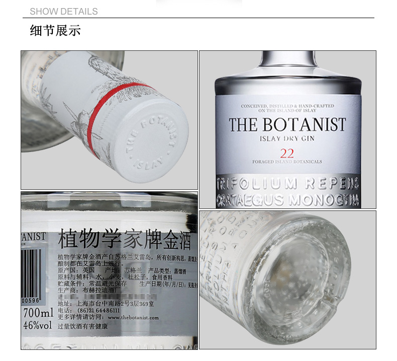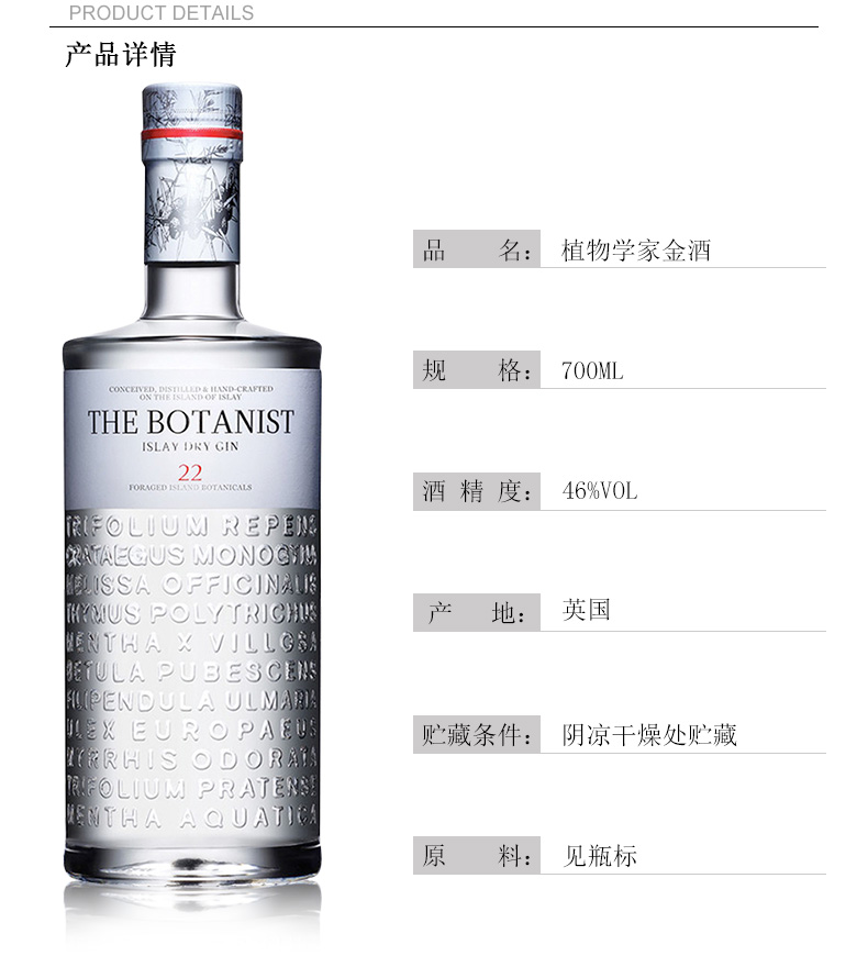 植物学家牌金酒 THE BOTANIST ISLAY DRY GIN 英国洋酒 杜松子酒 700ml