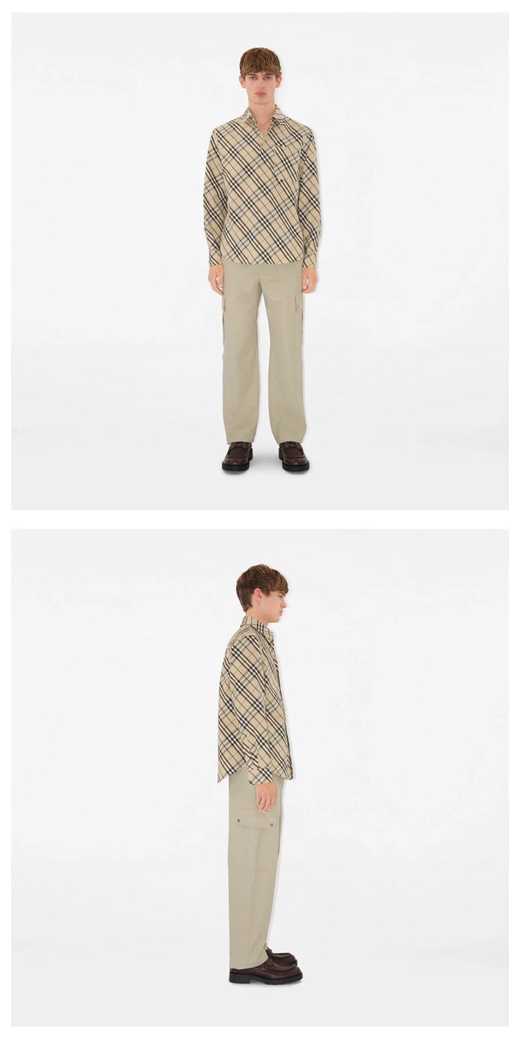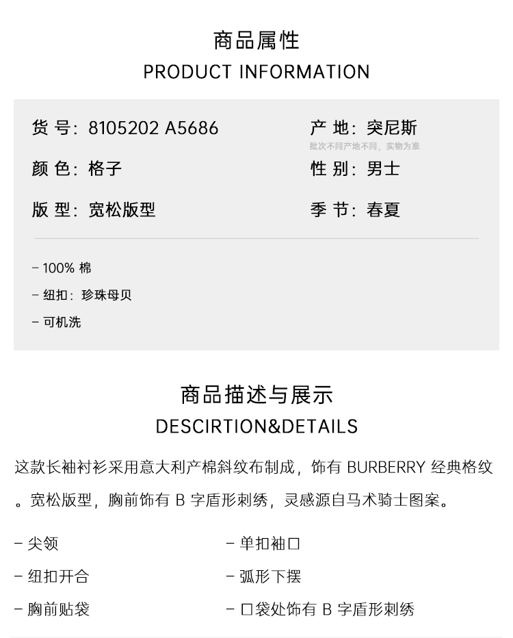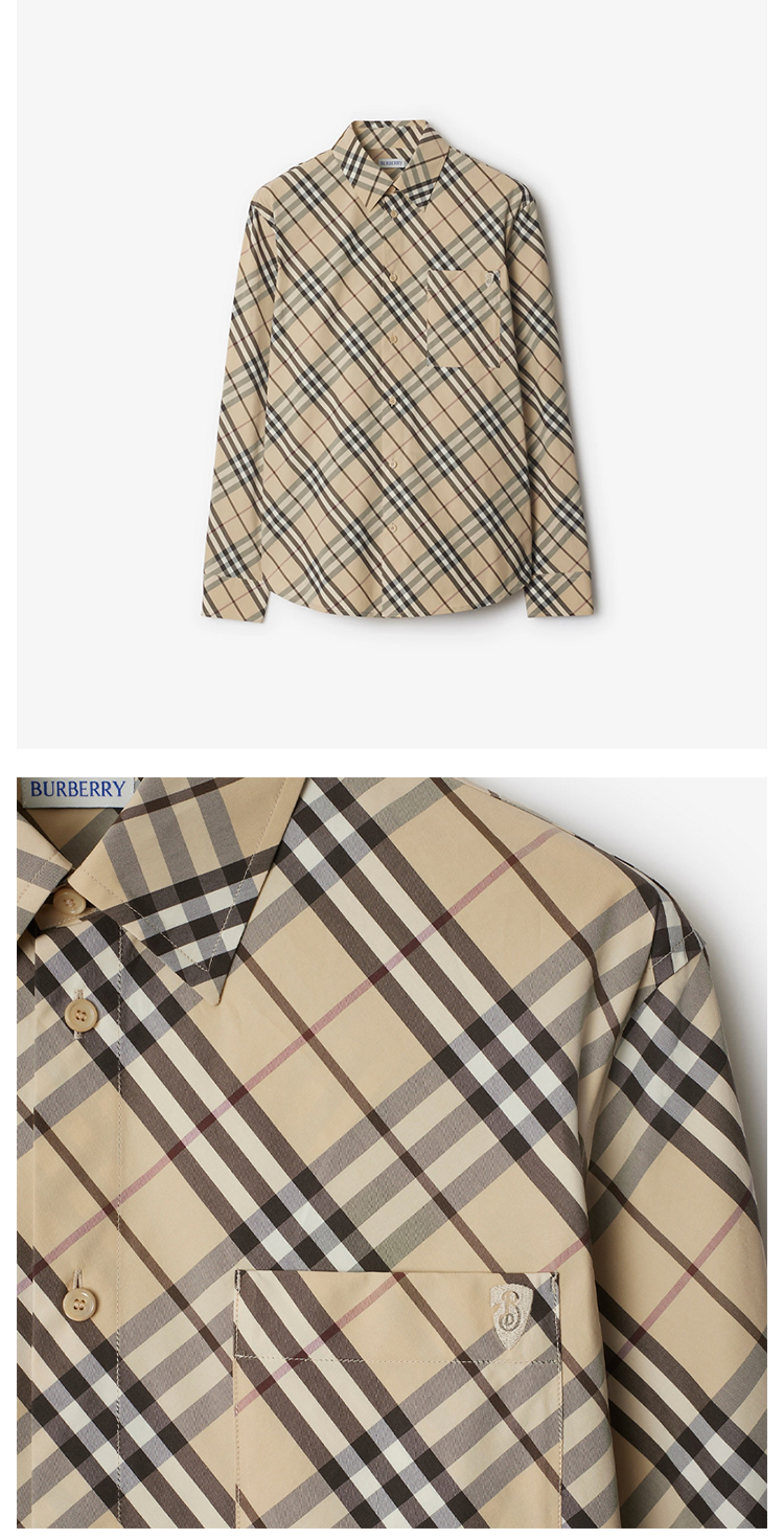 BURBERRY 巴宝莉 男士 B 字盾形刺绣宽松格纹棉质长袖衬衫 格子 8105202 A5686