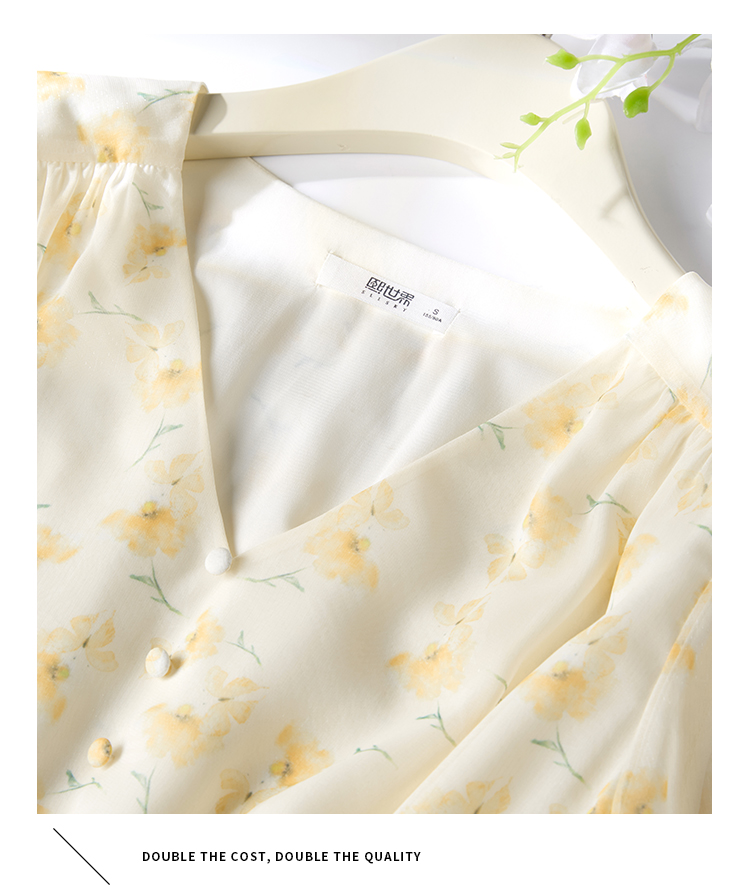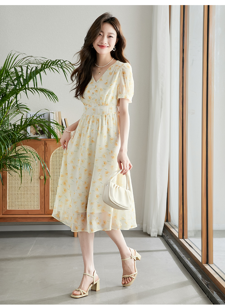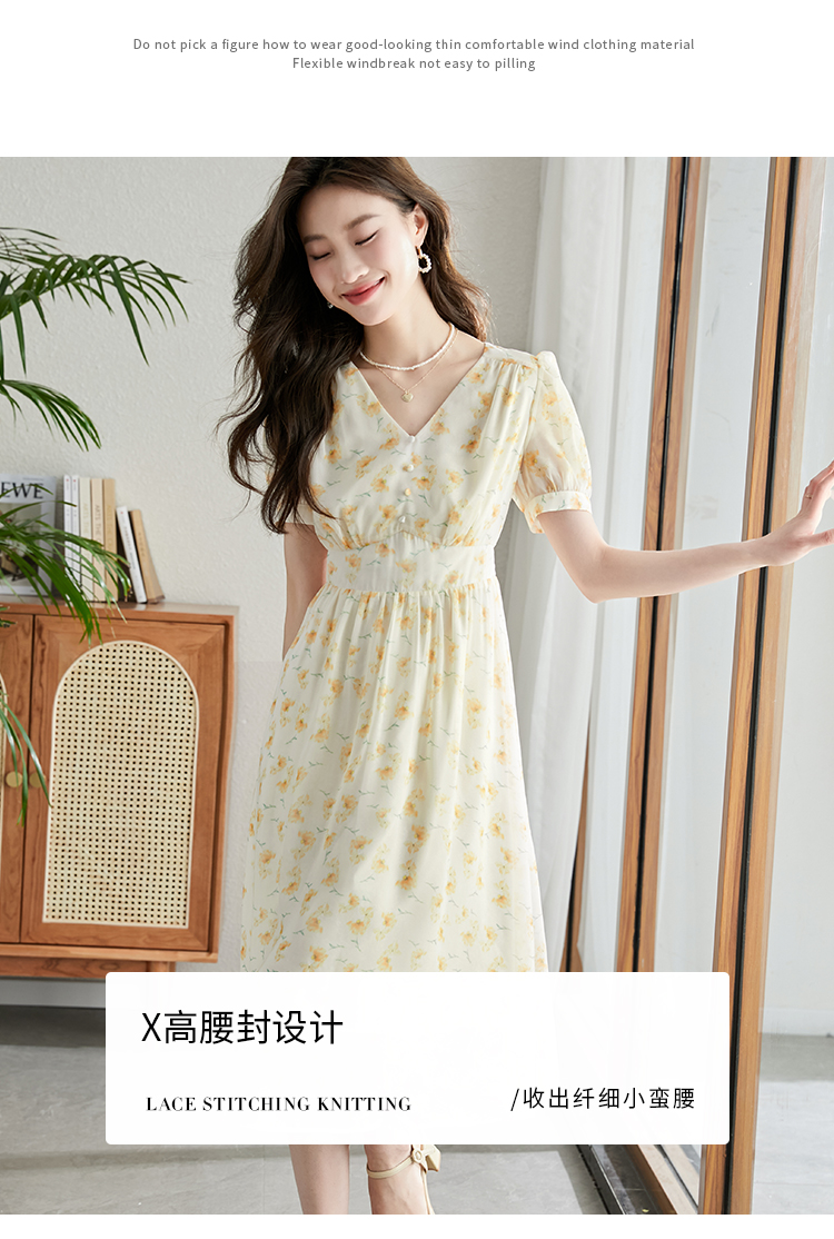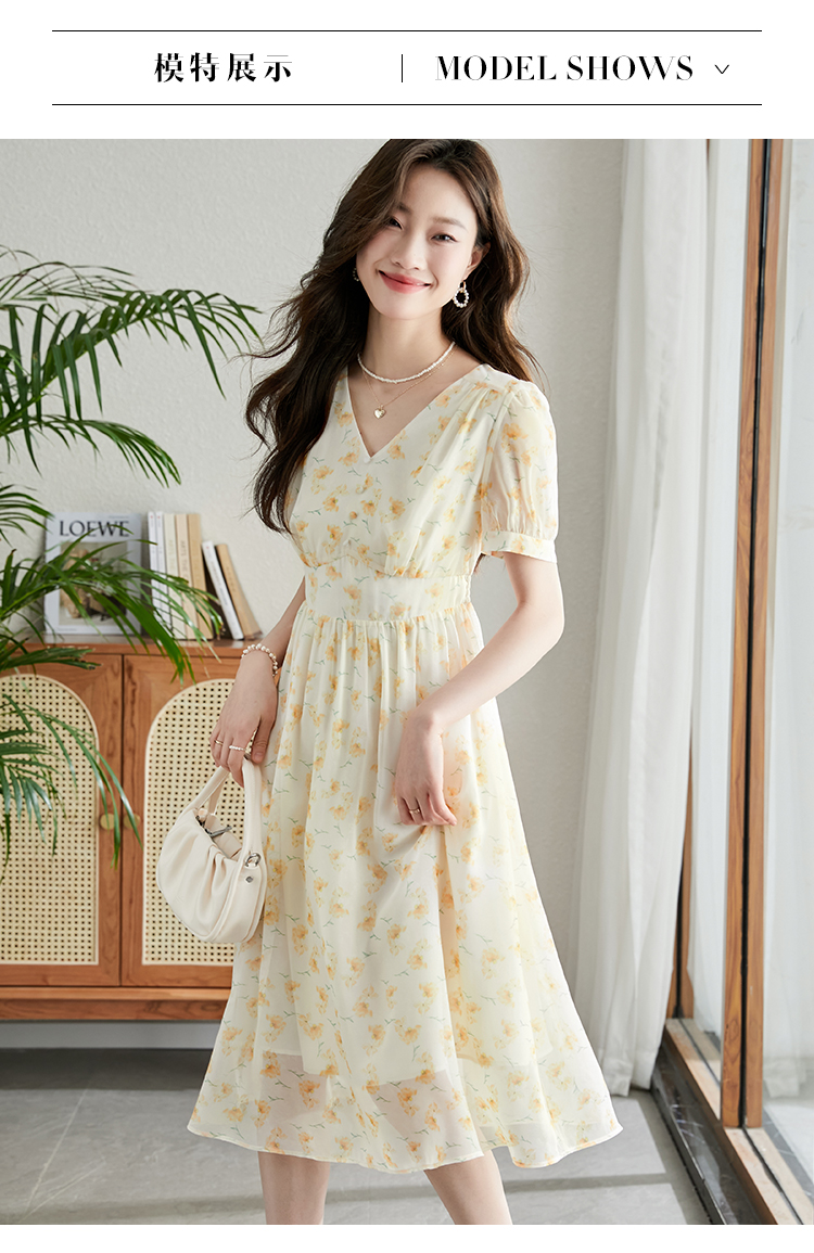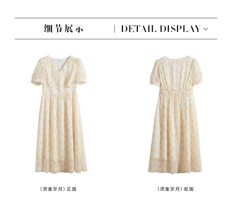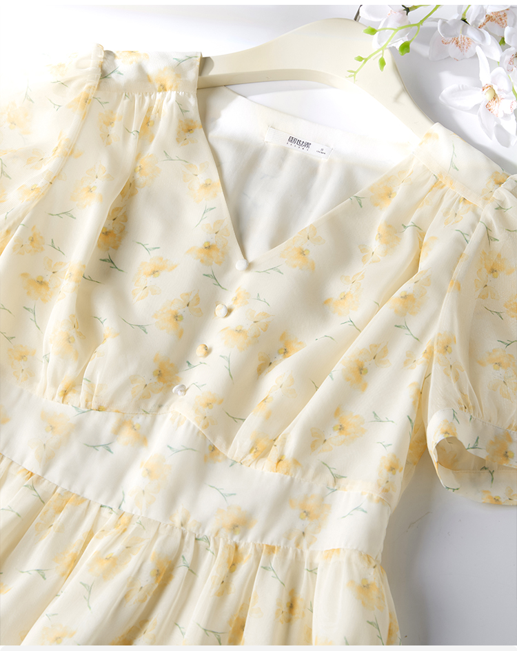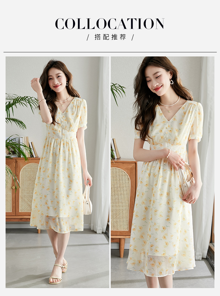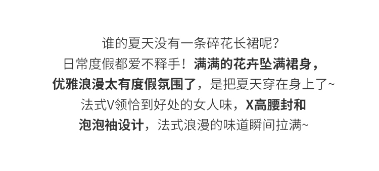 【专属特价】熙世界优雅浪漫度假风碎花连衣裙女夏收腰气质V领泡泡袖雪纺裙子
