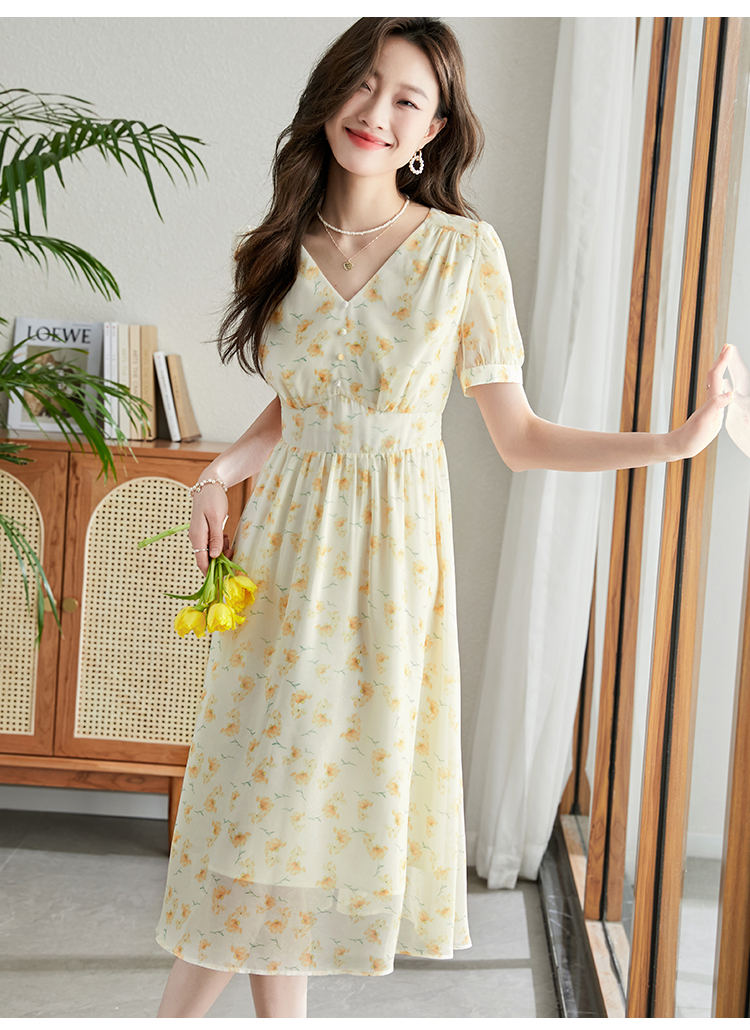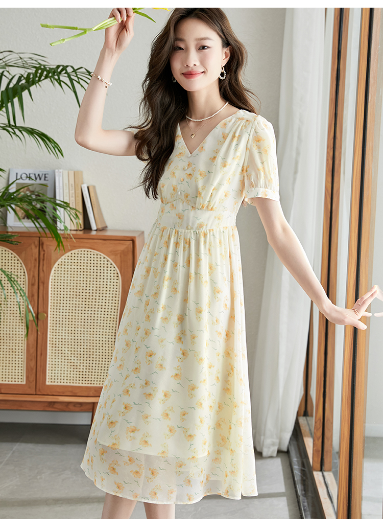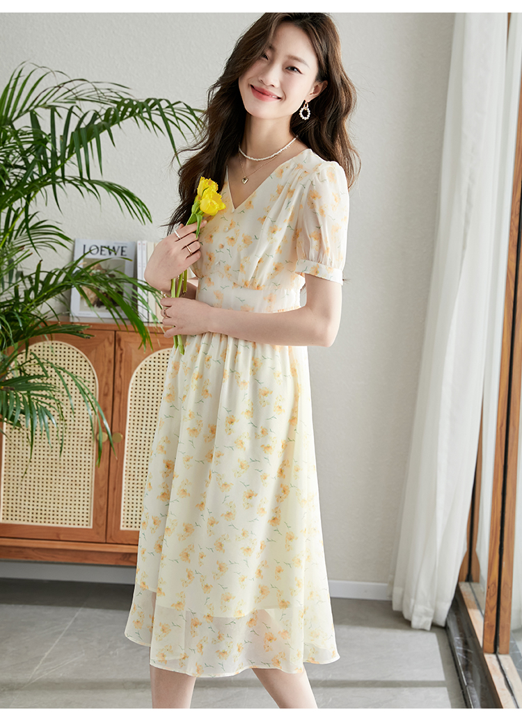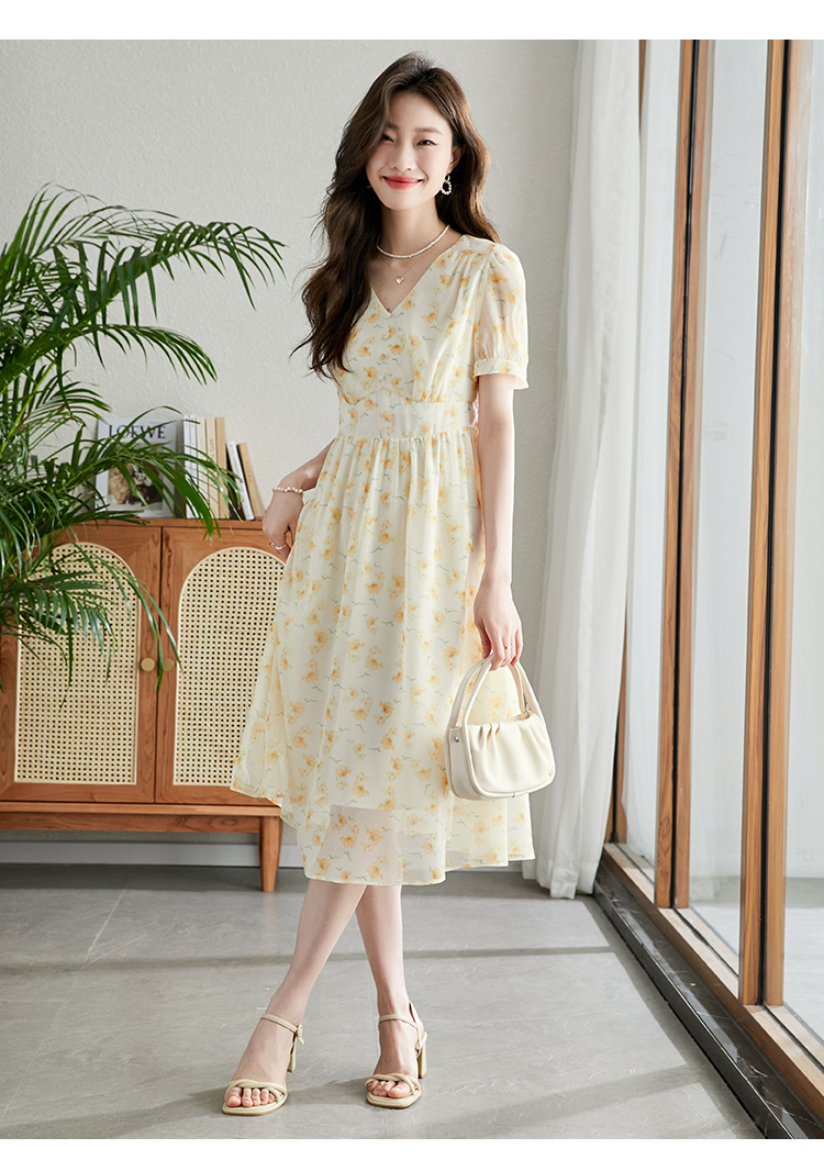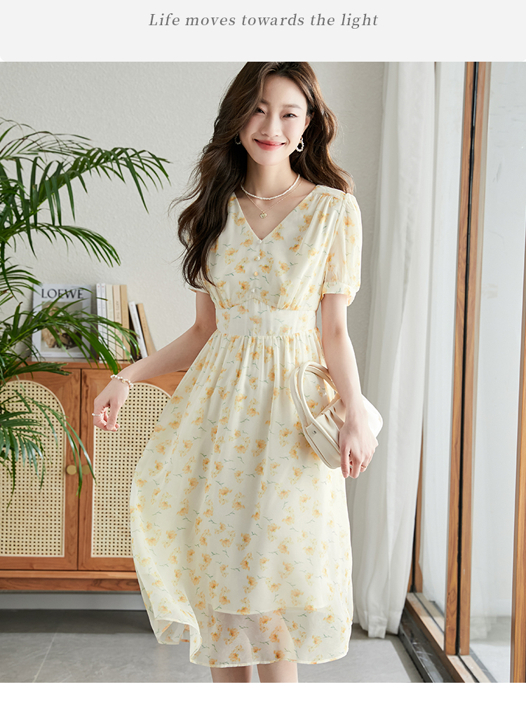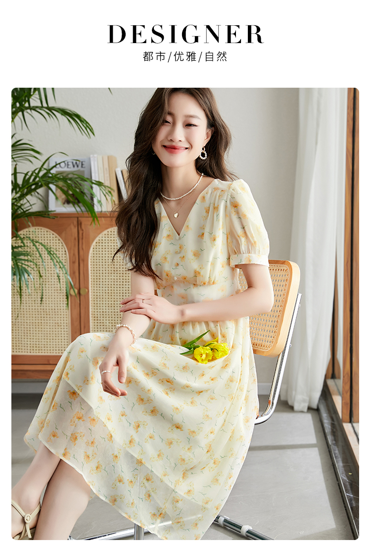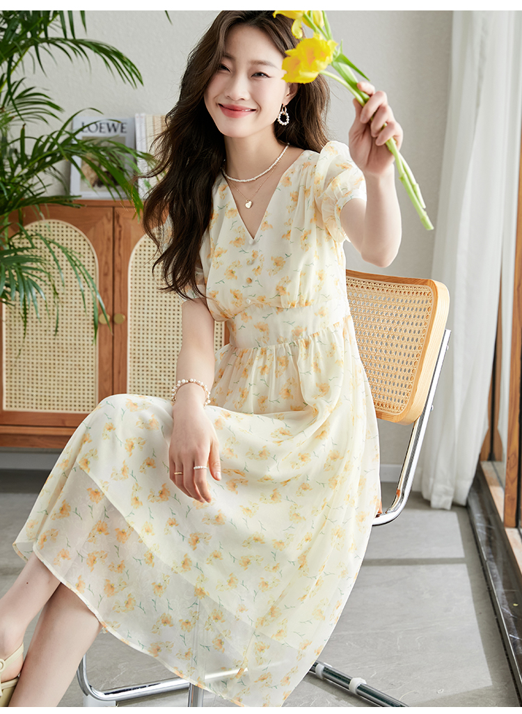 【专属特价】熙世界优雅浪漫度假风碎花连衣裙女夏收腰气质V领泡泡袖雪纺裙子