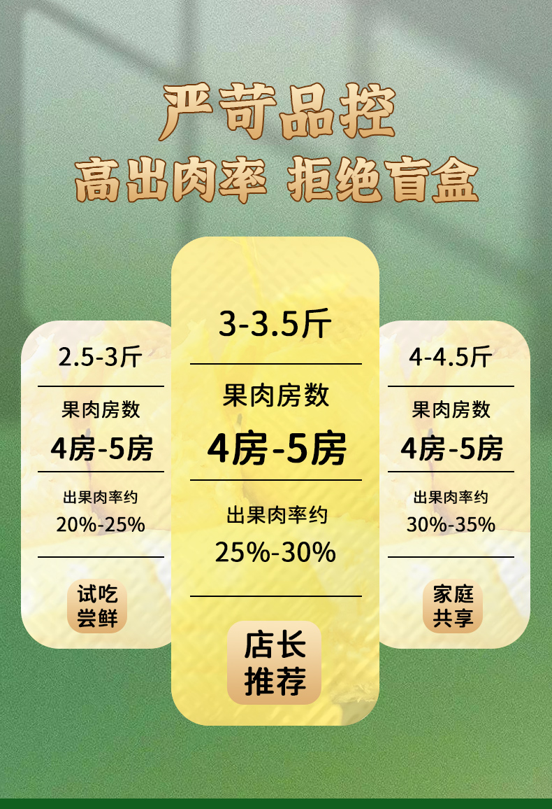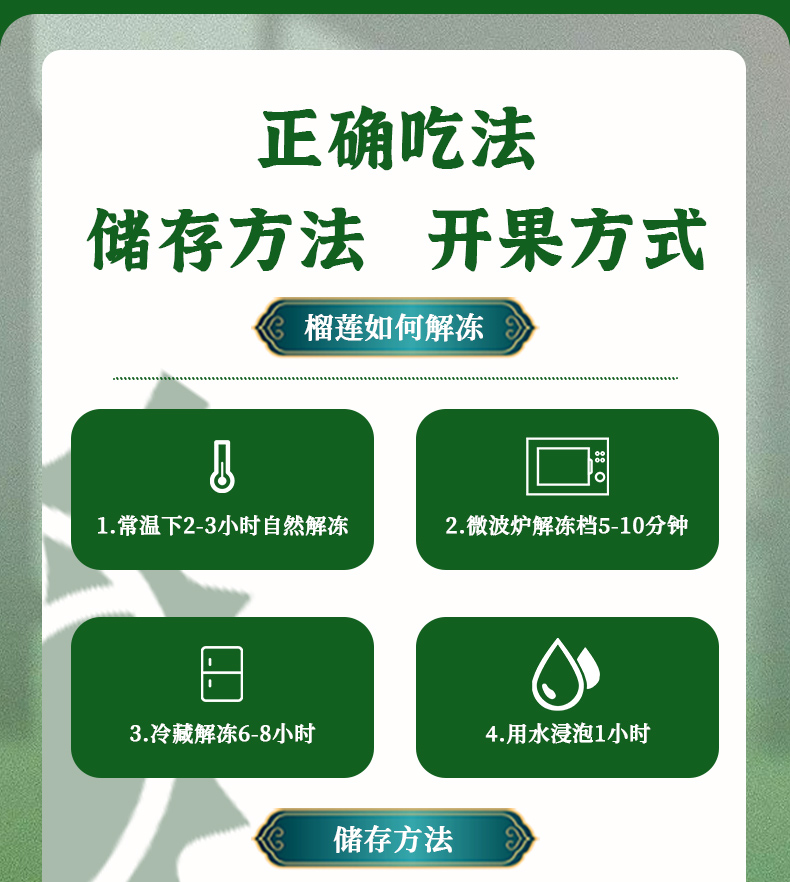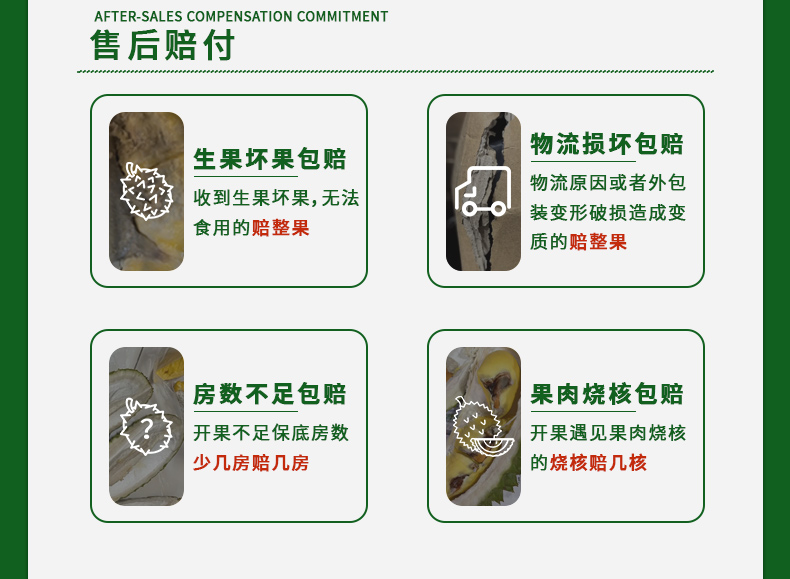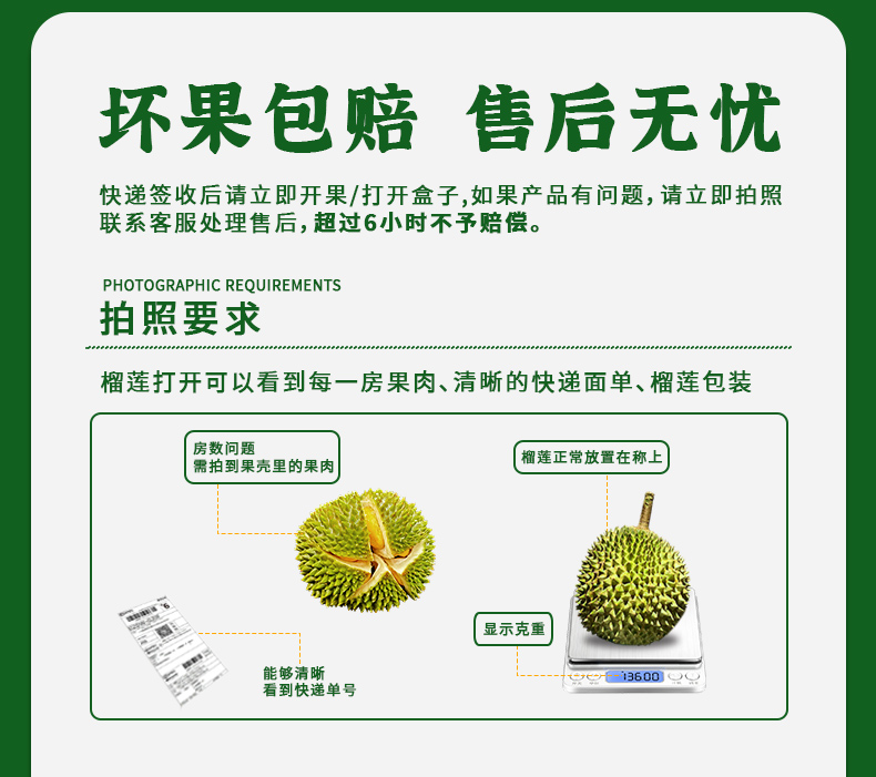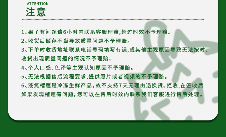 6、液氮榴莲是冷冻生鲜产品,故不支持7天无理由退换货、拒收,在签收后如果发现榴莲有问题,您可以在售后时效内联系我们客服进行售后处理。