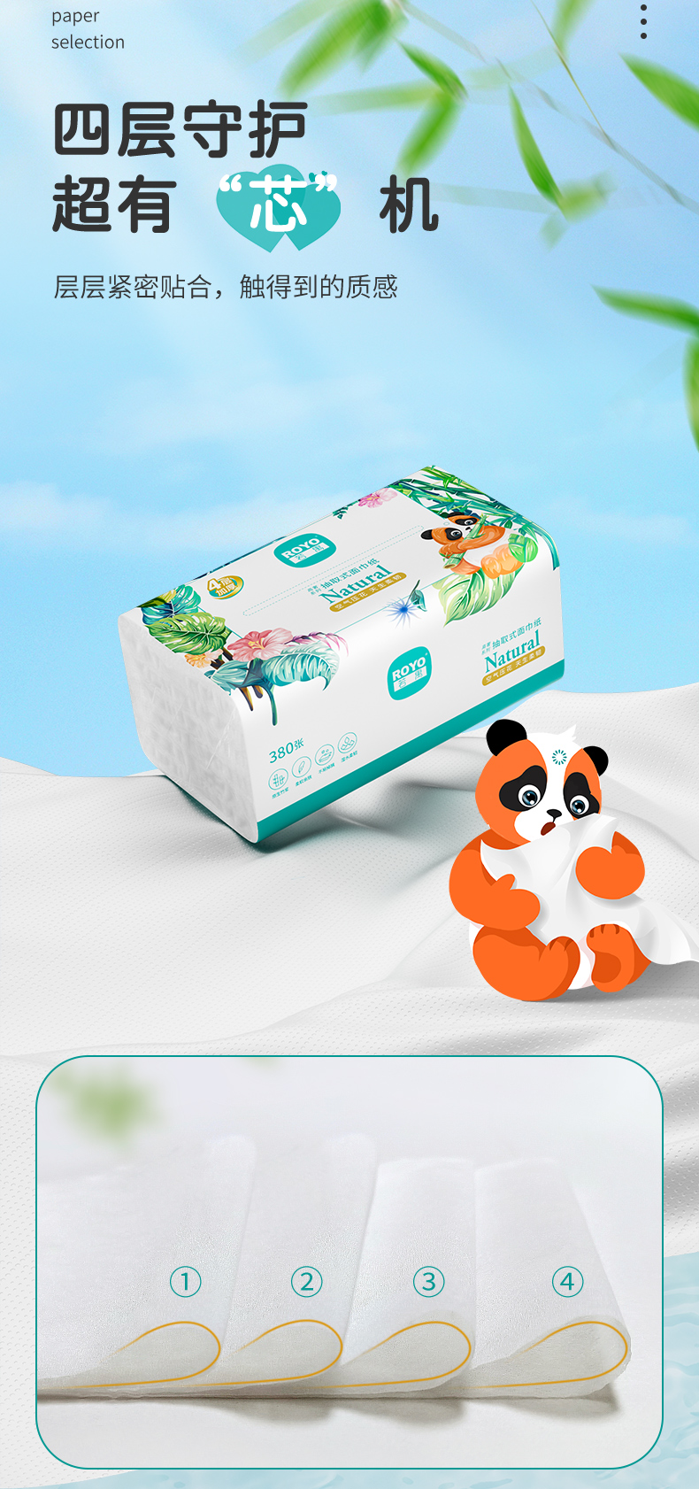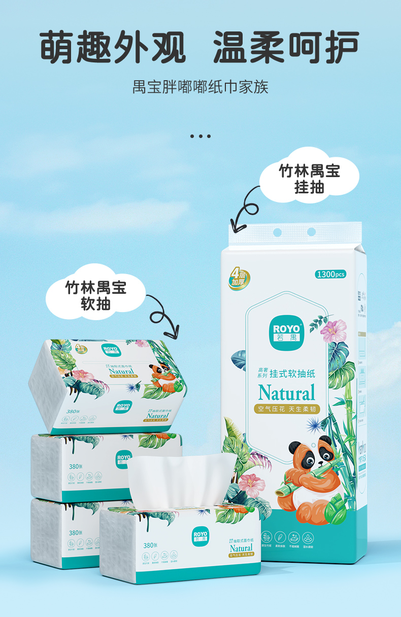 若禺RoyoPanda软抽纸竹柔系列4层加厚300张/包原生竹浆湿水可用6包1提R1R1101