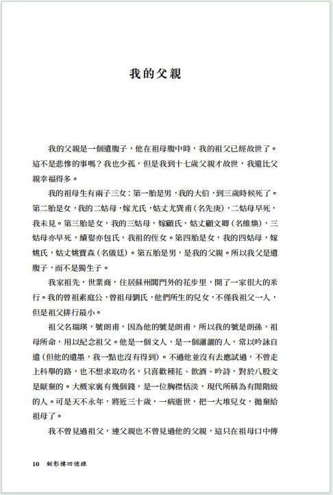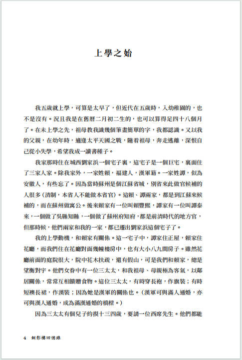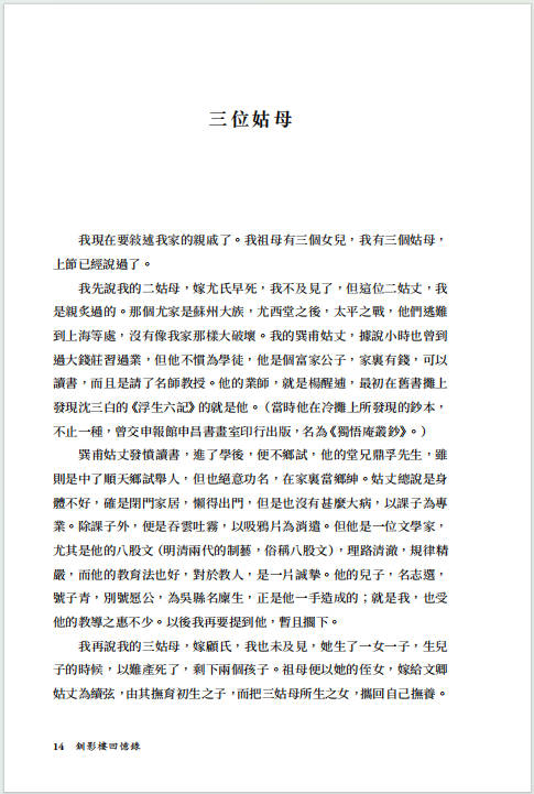 (3) 作者十九歲中秀才,後譯小說、辦報紙,開風氣之先。從他的回憶中,除了可見具體的風俗、事件,也可由其坦誠的敍述中窺見當時文人思想觀念的變遷。本書對於研究清末蘇州民俗、科舉、新聞和出版業的發展以及當時文人的交往,都是可貴的資料。