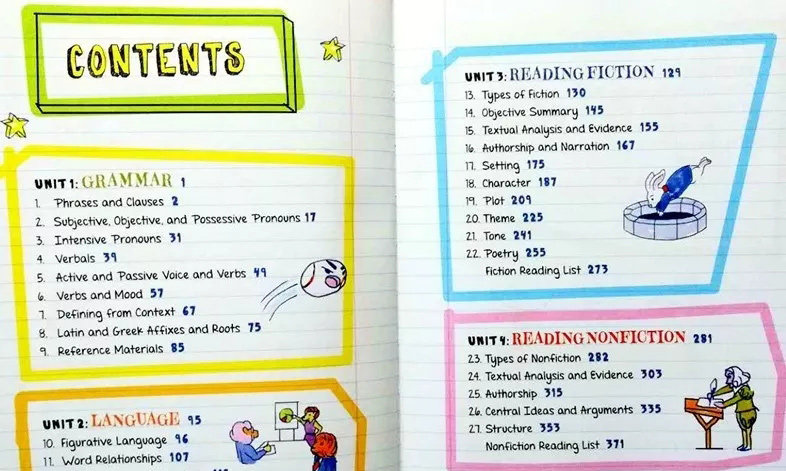这是英语书English Language Arts的目录,语法、词汇、阅读、写作都有所涉及。