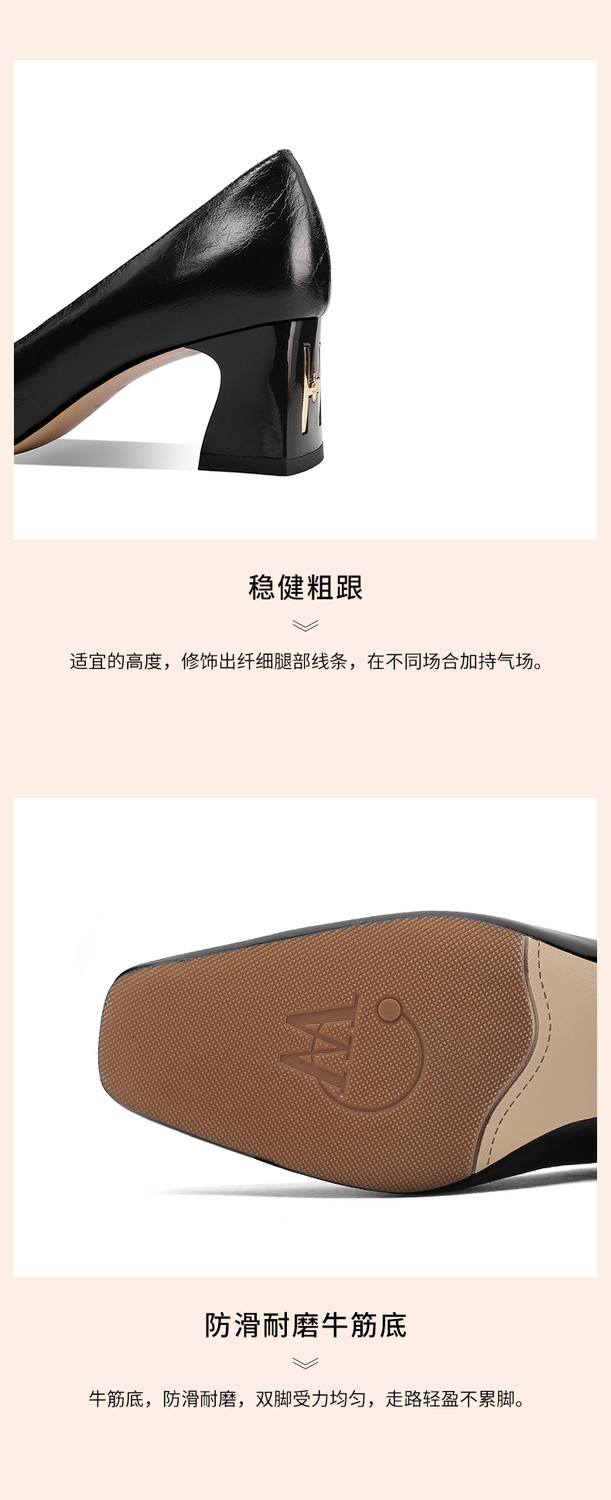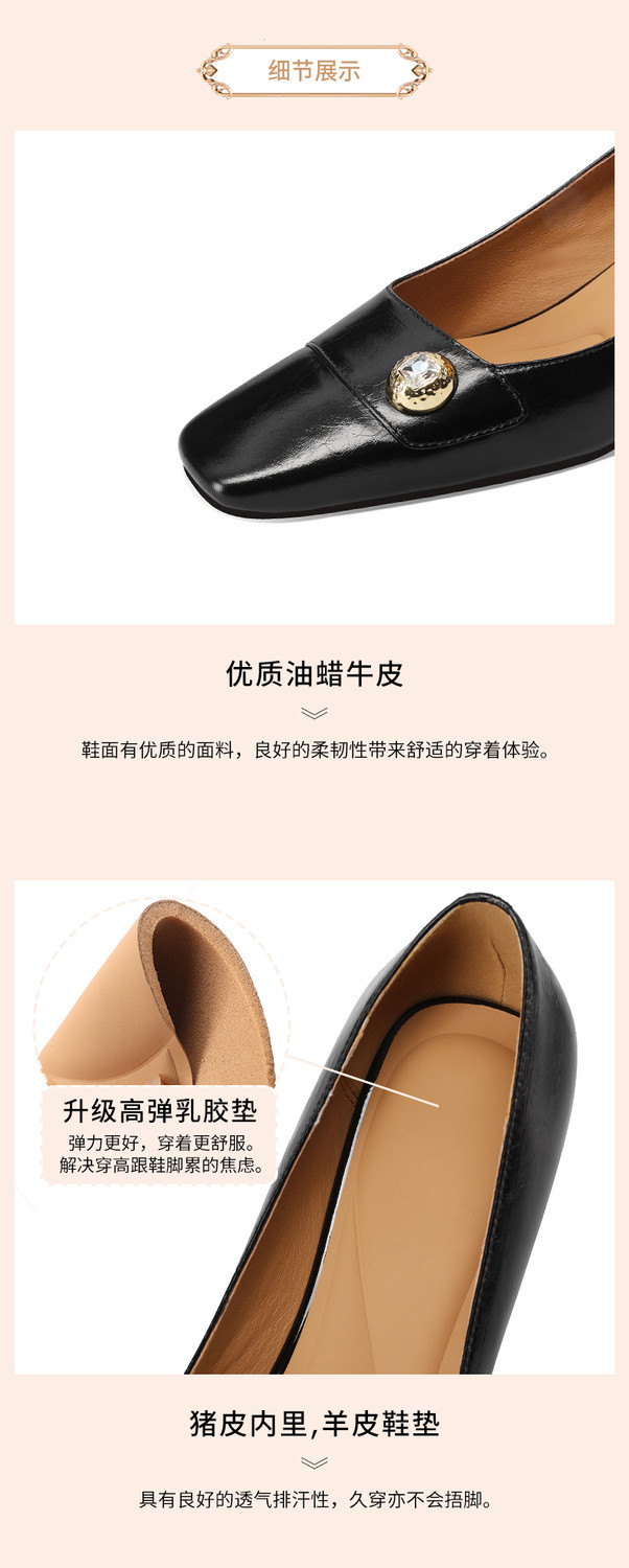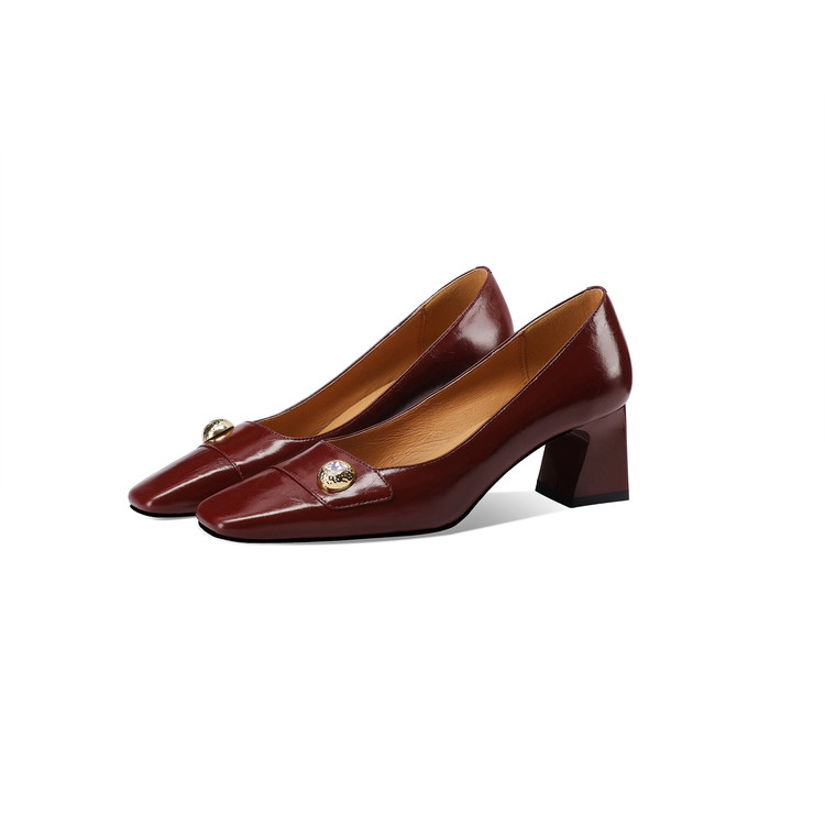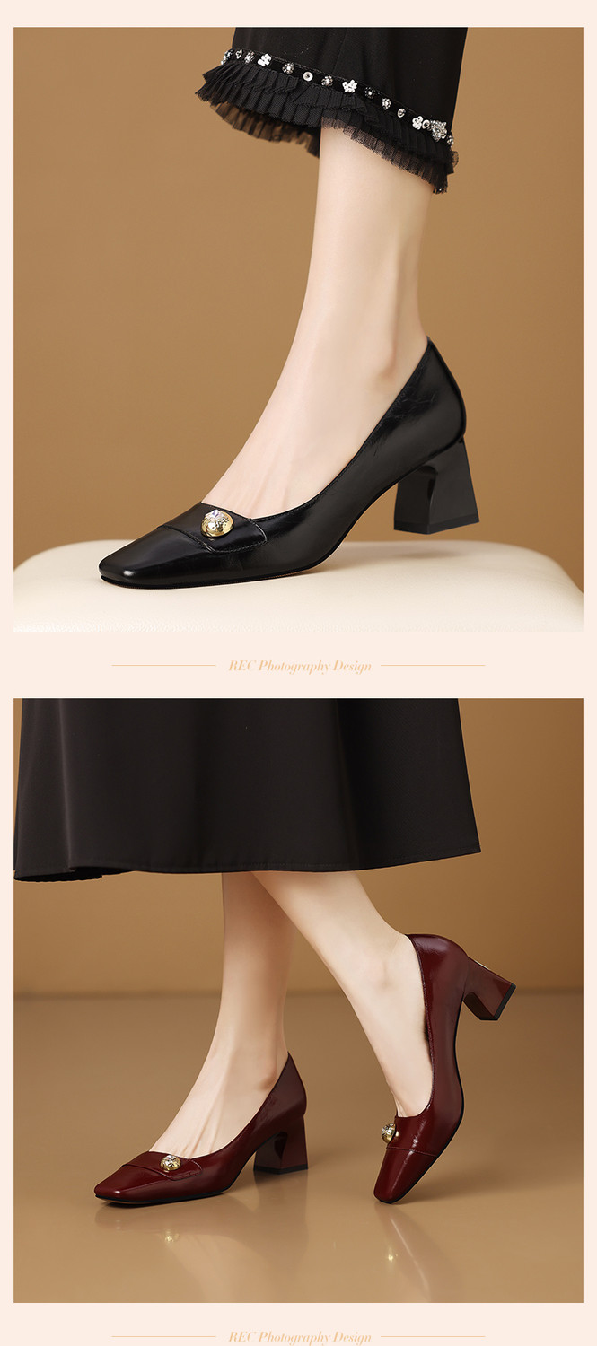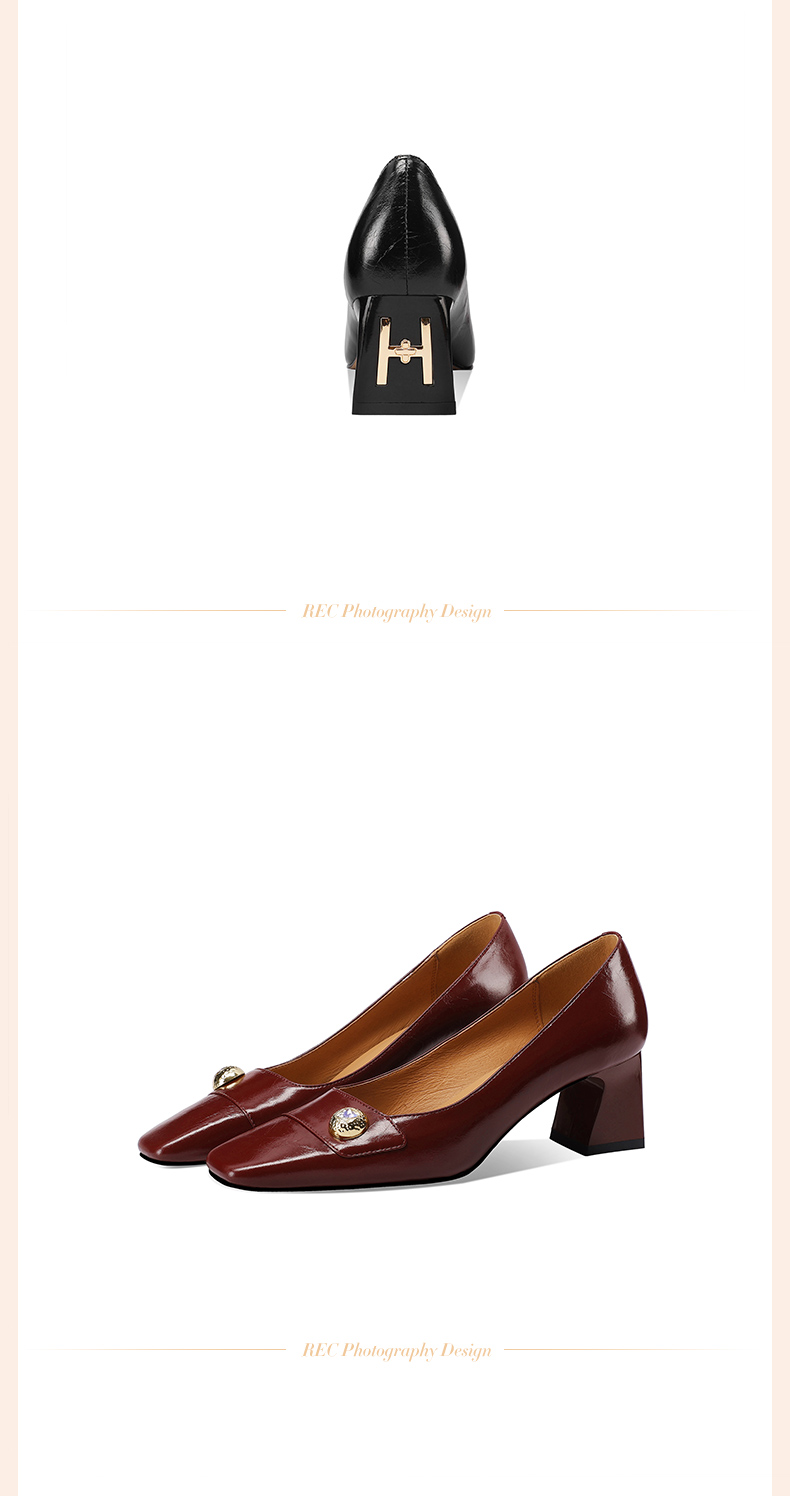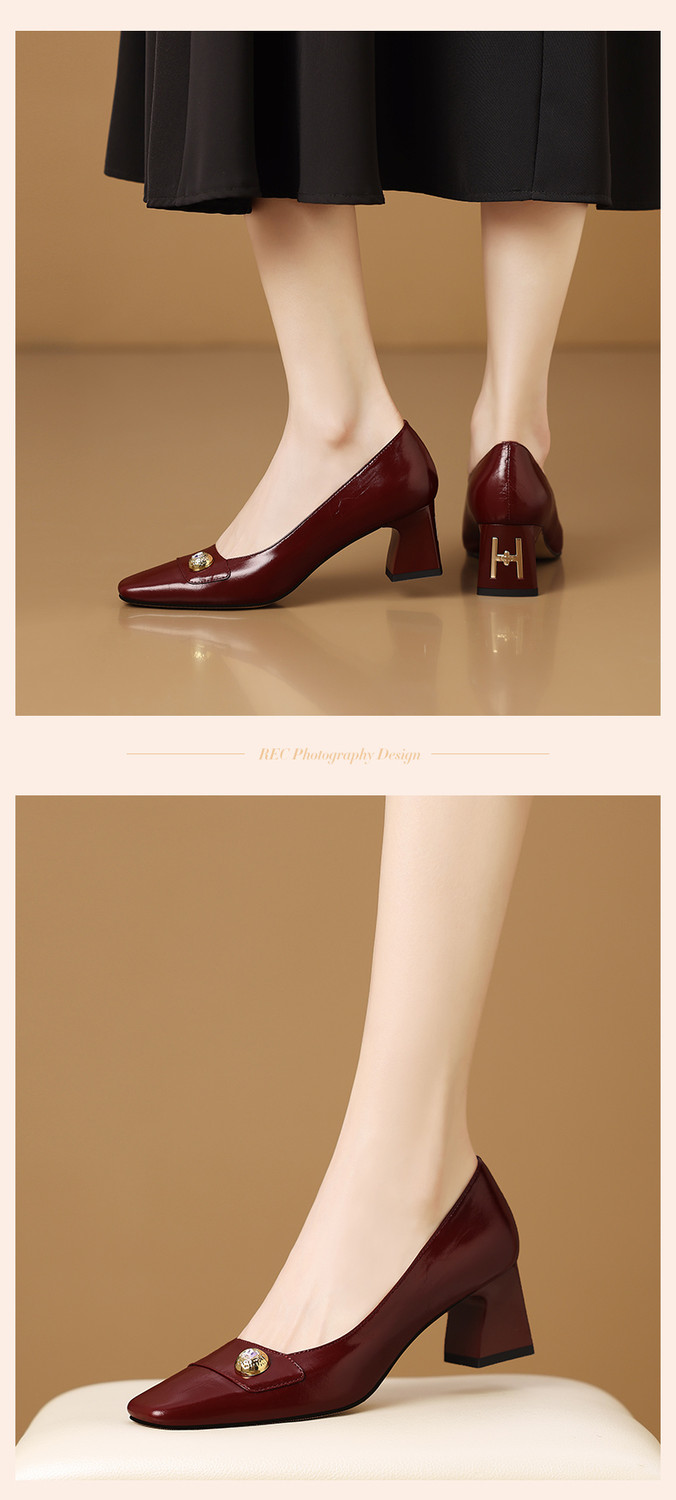 【预售5天】真皮方头法式复古浅口中跟单鞋女粗跟时尚百搭酒红色女鞋子HY&H3620