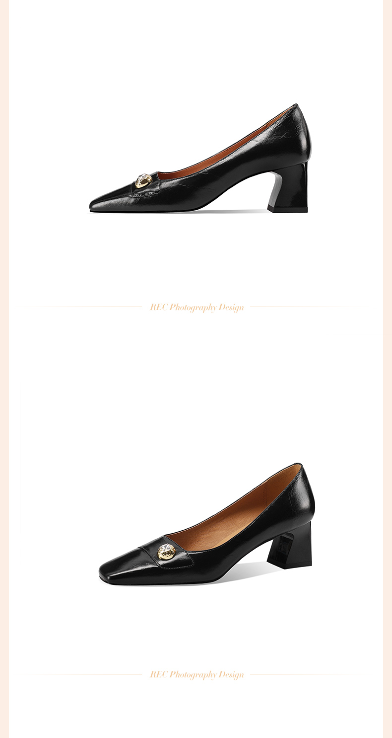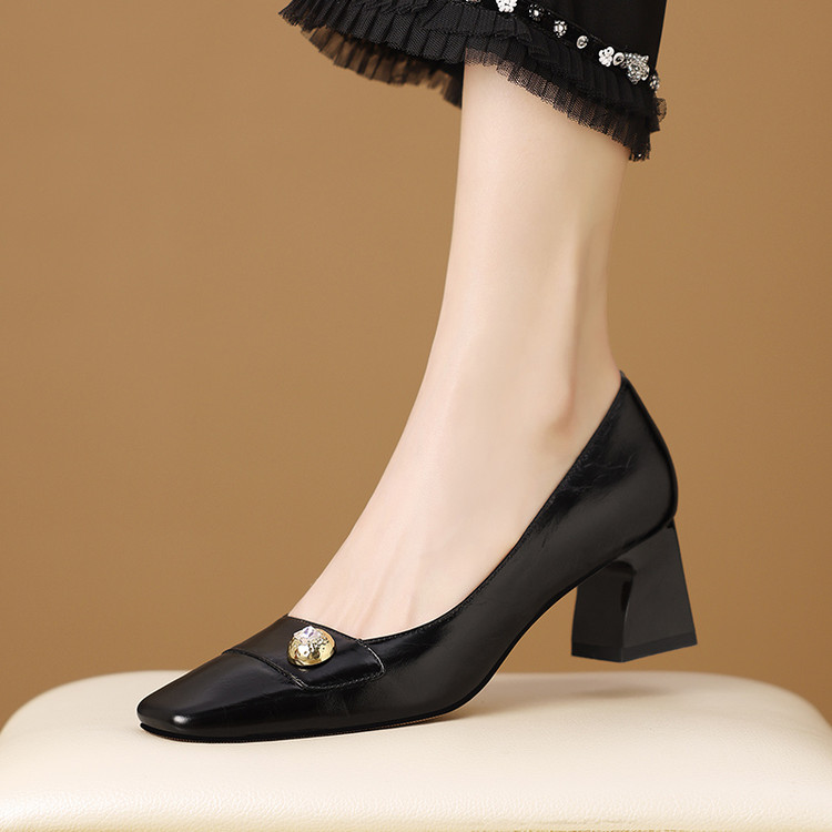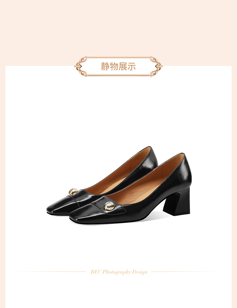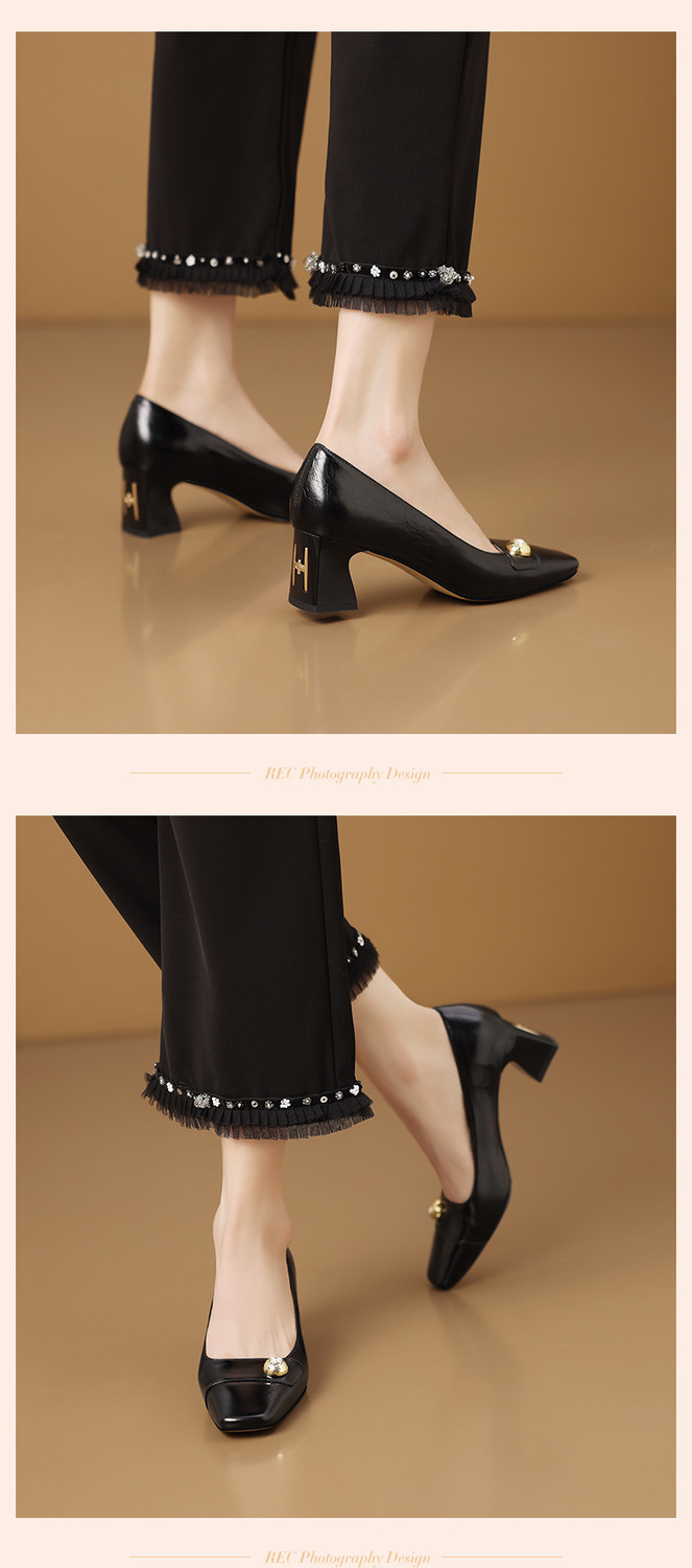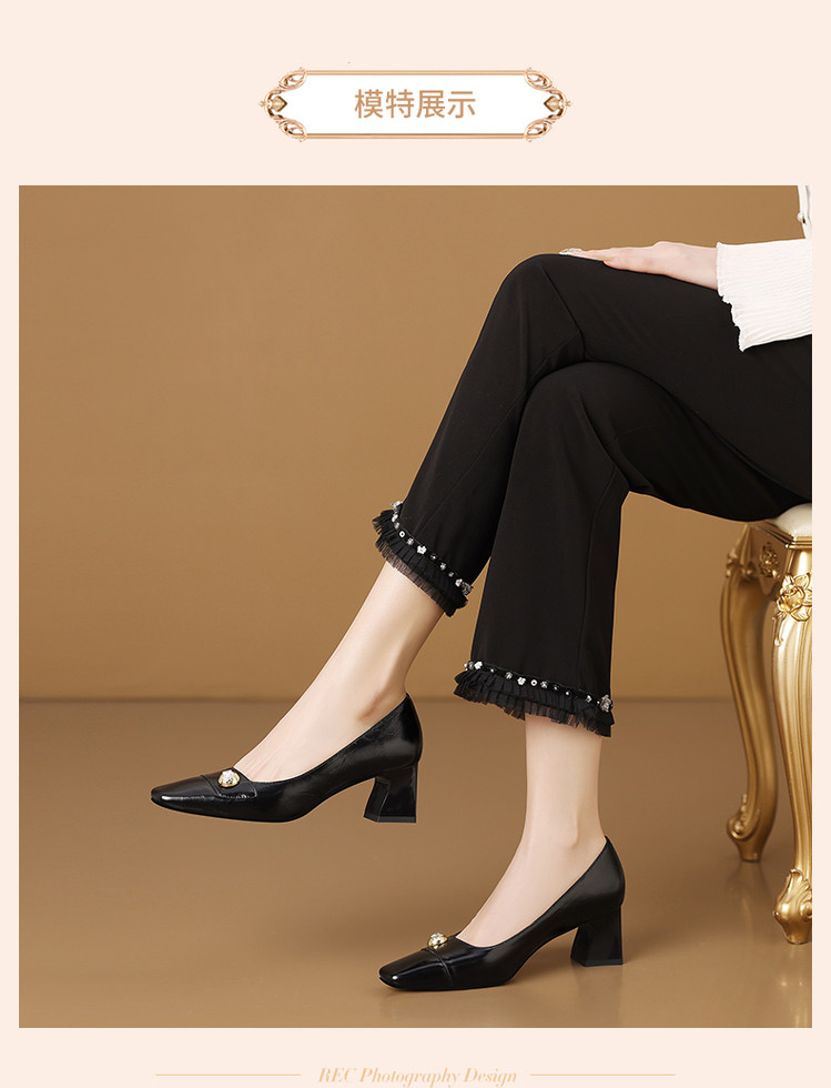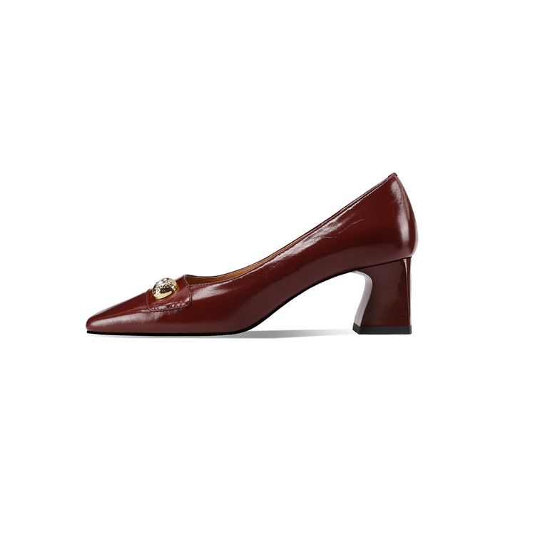 【预售5天】真皮方头法式复古浅口中跟单鞋女粗跟时尚百搭酒红色女鞋子HY&H3620