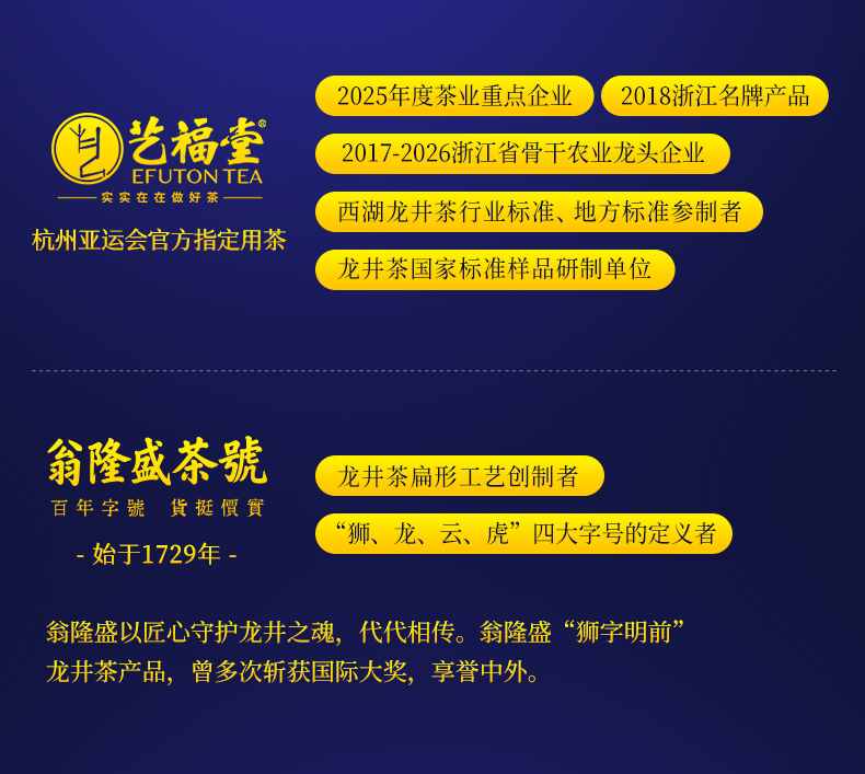 “艺福堂茶业”创立于2008年,是一家集生产、销售、科研为一体的现代茶业企业,主打西湖龙井,兼营世界各地名优茗茶及花草茶,是中国茶行业为数不多的年销售额过5亿的品牌之一,是杭州亚运会官方指定用茶!