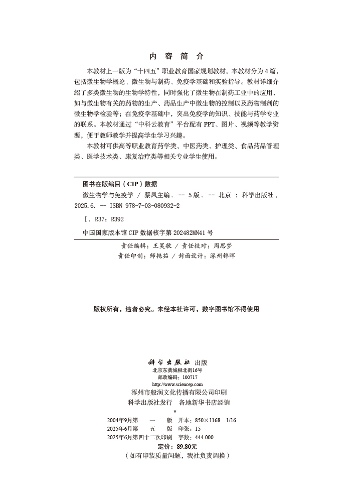 书名:微生物学与免疫学(第五版)