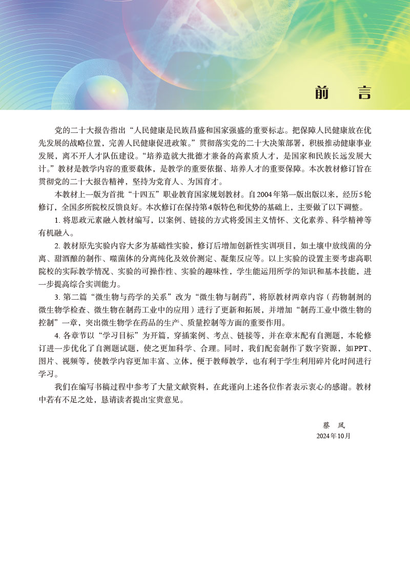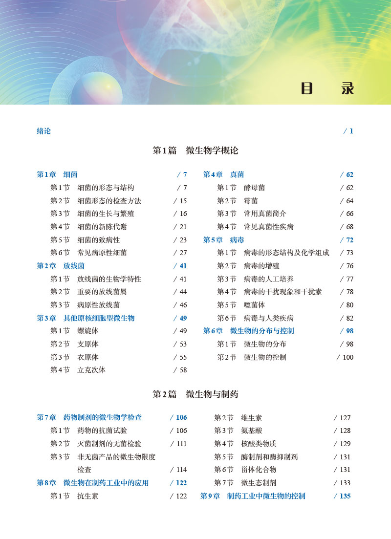 (1)将思政元素融入教材编写:根据习近平总书记在2016年全国高校思想政治工作会议上指出的教育要为人民服务,为中国共产党治国理政服务的理念,教材编写过程中将思想政治教育与微生物学课程的教学内容有机结合。教材中以链接的方式将新中国成立以来我国在微生物学领域取得的成果展示给学生;在配套PPT中充分挖掘思政元素(如樊庆笙教授与青霉素的生产、汤飞凡与沙眼衣原体、新冠肺炎疫情防治等)做成课程案例供教学使用;实验实训内容中要求学生严格规范操作等,从爱国主义情怀、文化素养、科学精神等多方面有机融入,为培养德智体美劳全面发展的人才打下基础。 (2)体现“实用性”原则:结合高职教育的特点,在编写过程中力求通俗易懂,重点突出,在“实用性”原则的指导下组织教材的理论体系内容。 (3)“药味浓”:本书加强了微生物学的基础知识、基本技能与药品生产技术专业的联系,突出微生物学在制药工业中的重要地位。 (4)编写内容中配有大量图表,因为《微生物学》是一门较抽象的学科,有助于学生对阐述内容的理解和掌握。每章都编写有学习目标、小结和目标检测及参考答案,使得教材与学习指导相结合,不论是教师备课或学生复习都会感到非常方便。