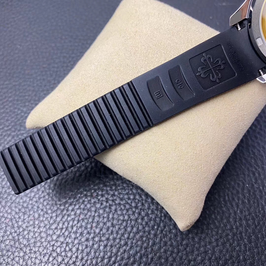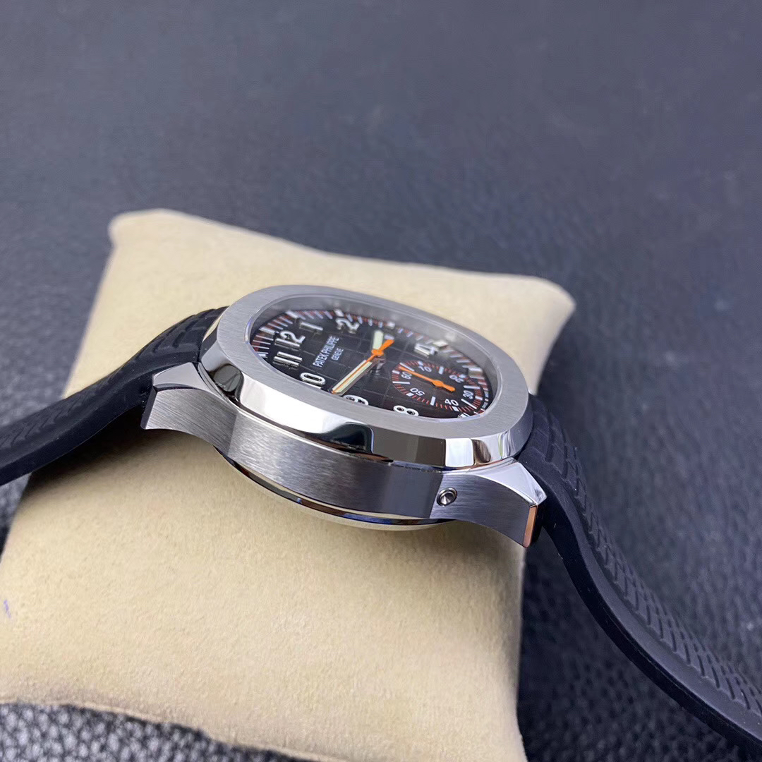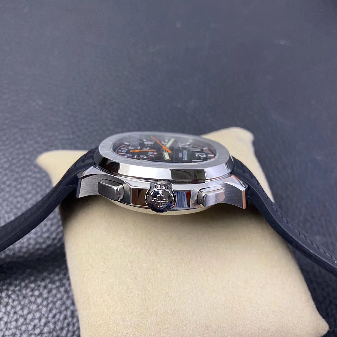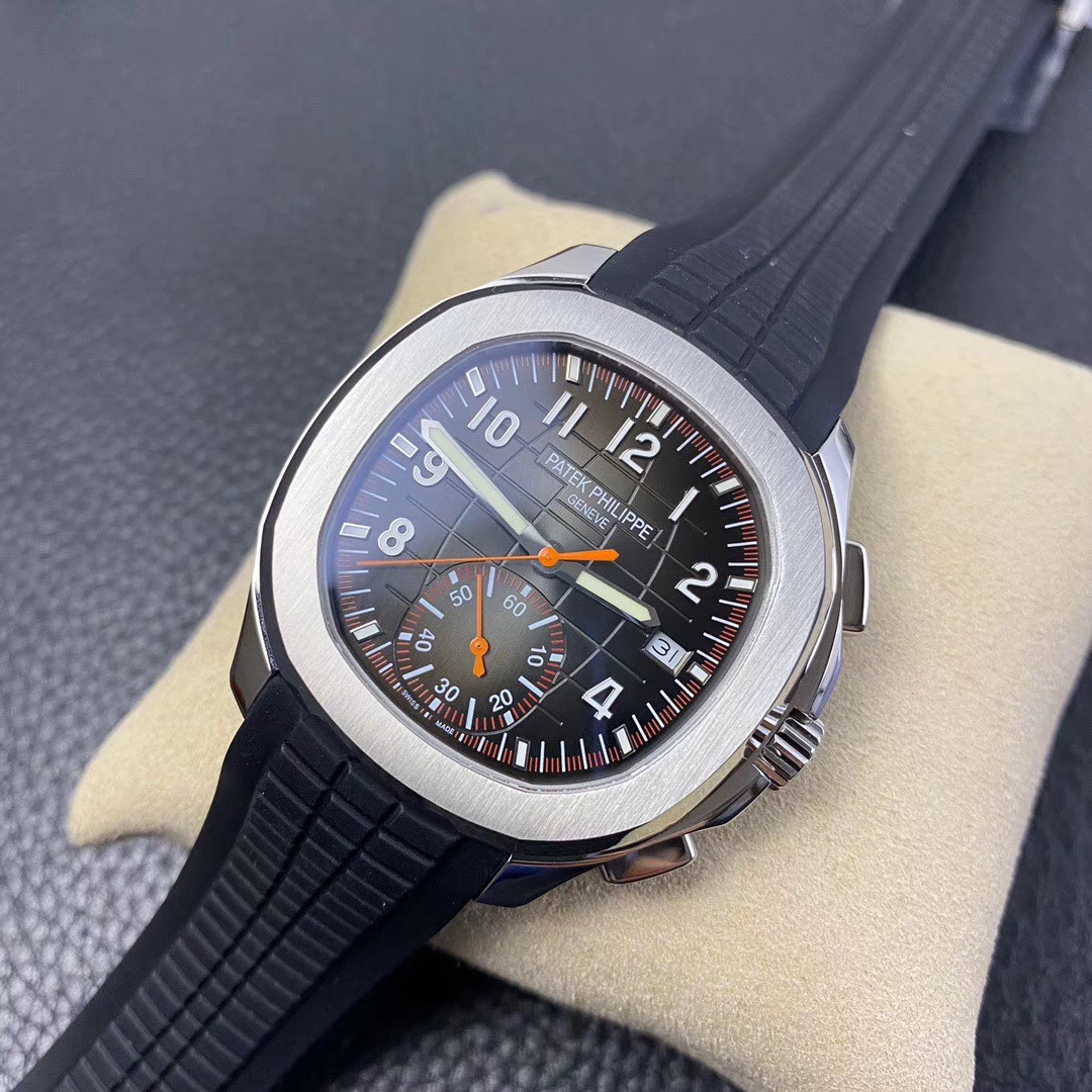 N百达翡丽新款计时手雷(计时Aquanaut)5968A彩色盘面和彩色胶带,表盘中央的计时秒针、刻度和6点位的30分钟计时盘刻度、计时指针都是橘黄色的