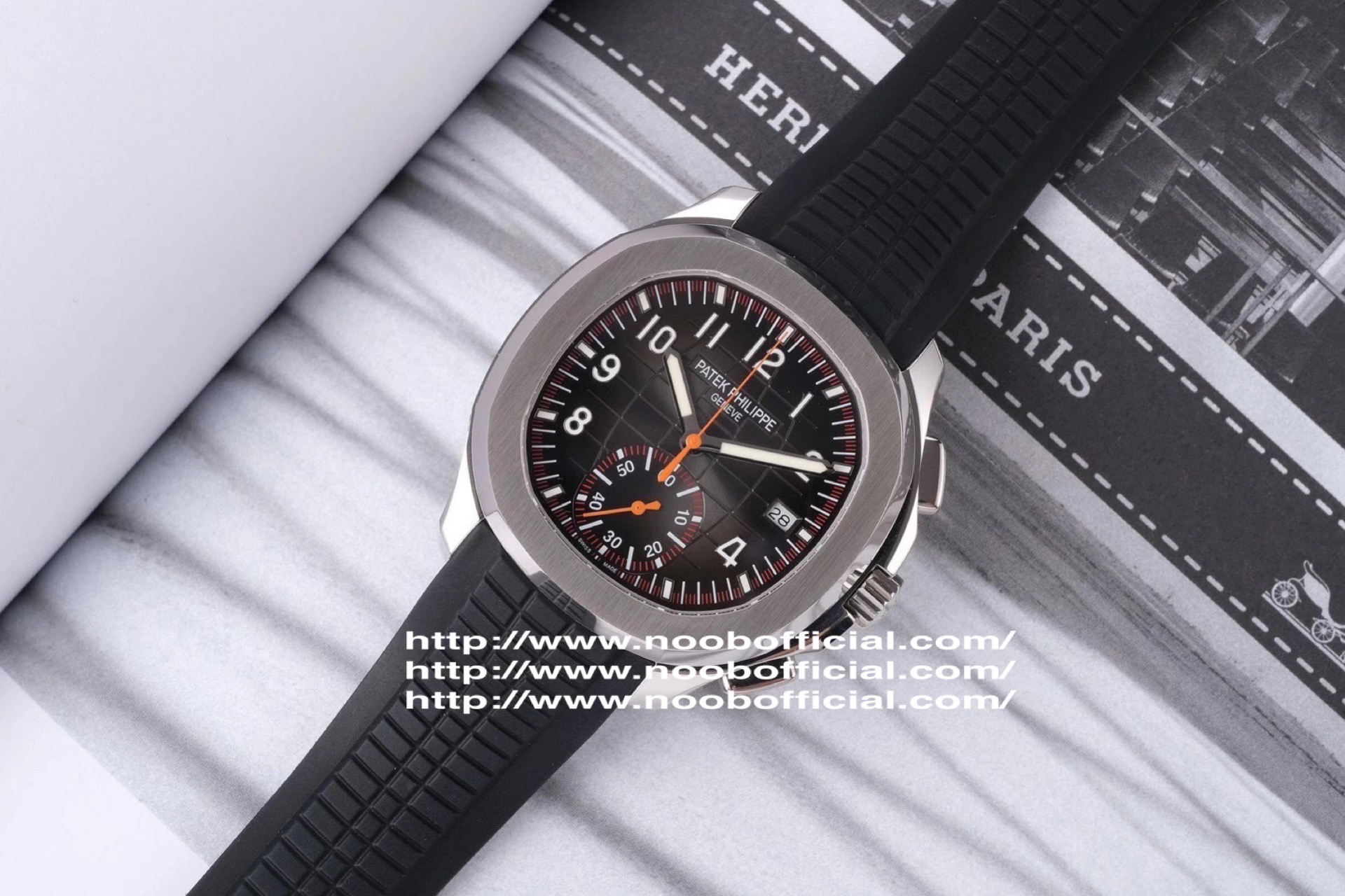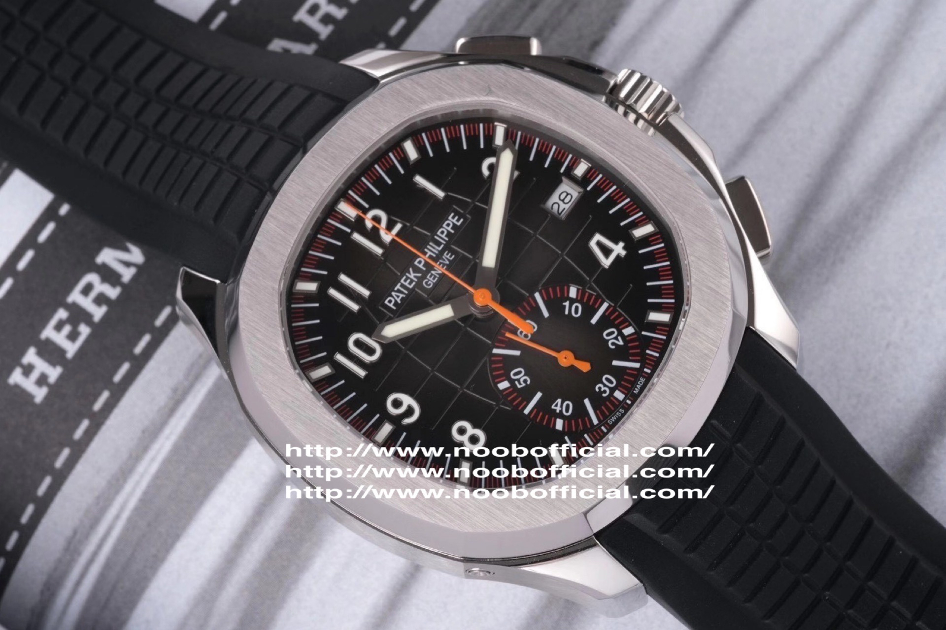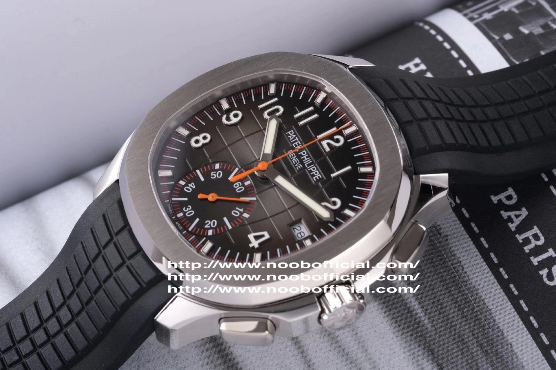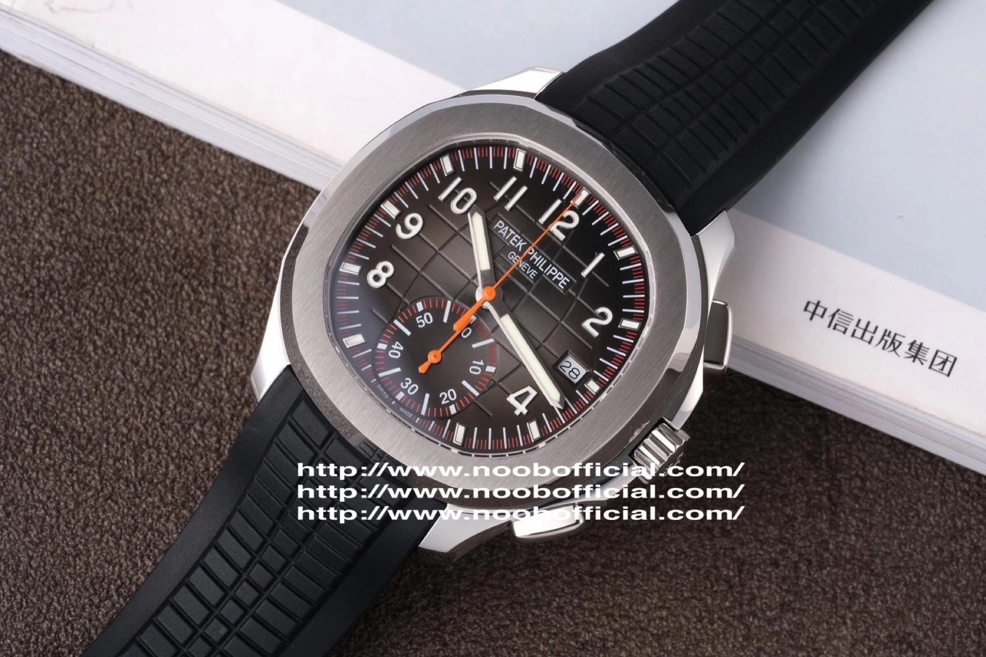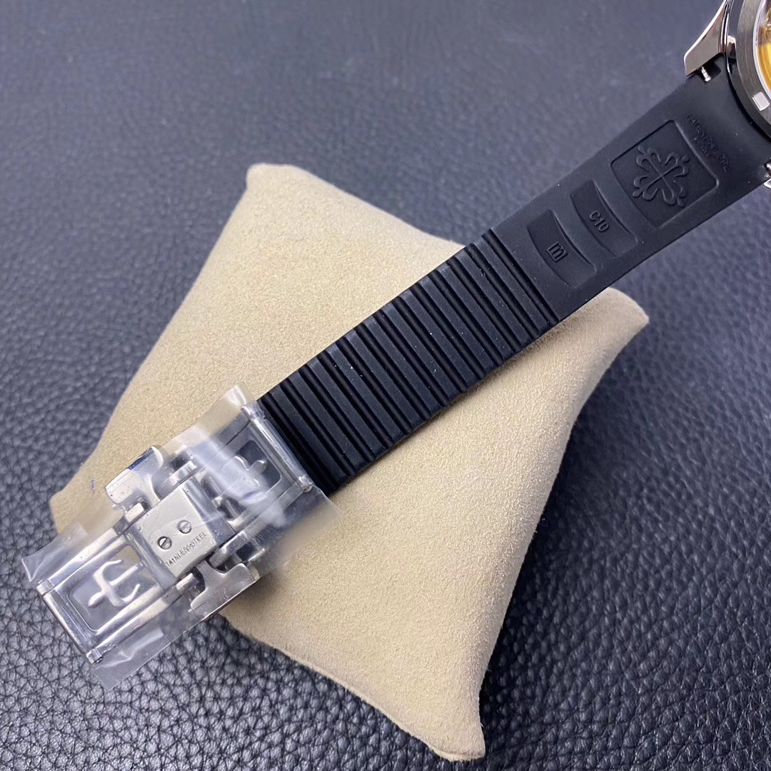 N百达翡丽新款计时手雷(计时Aquanaut)5968A彩色盘面和彩色胶带,表盘中央的计时秒针、刻度和6点位的30分钟计时盘刻度、计时指针都是橘黄色的