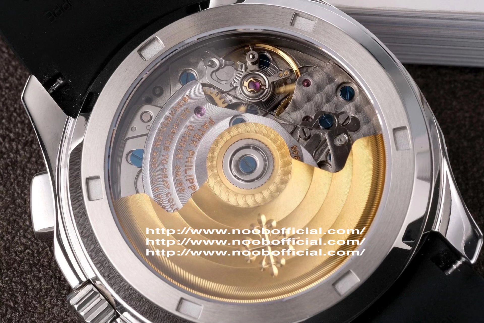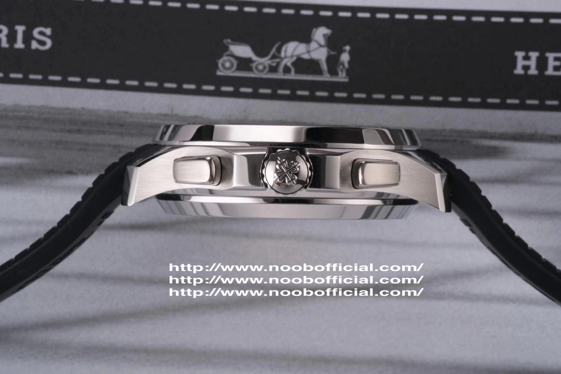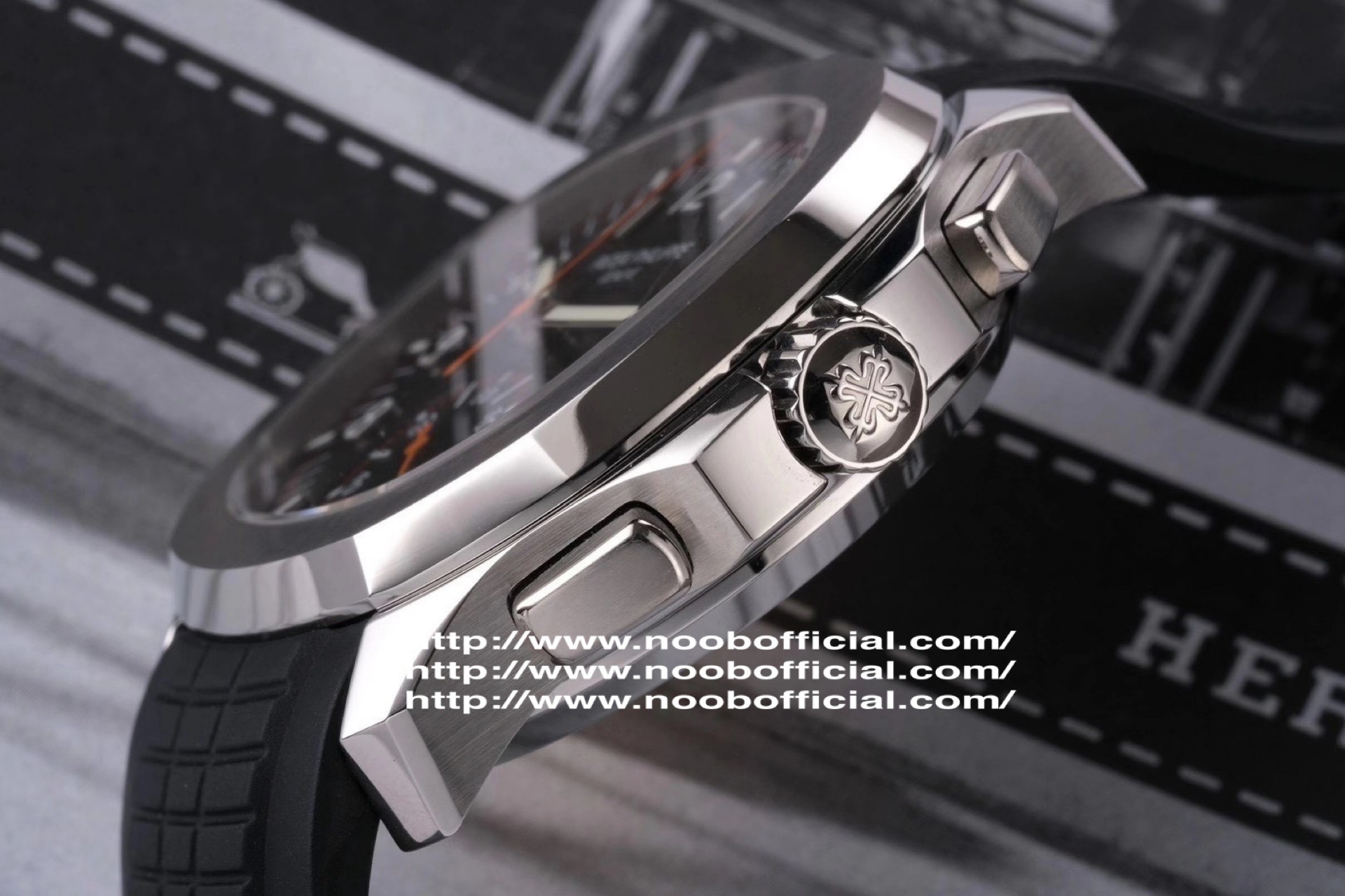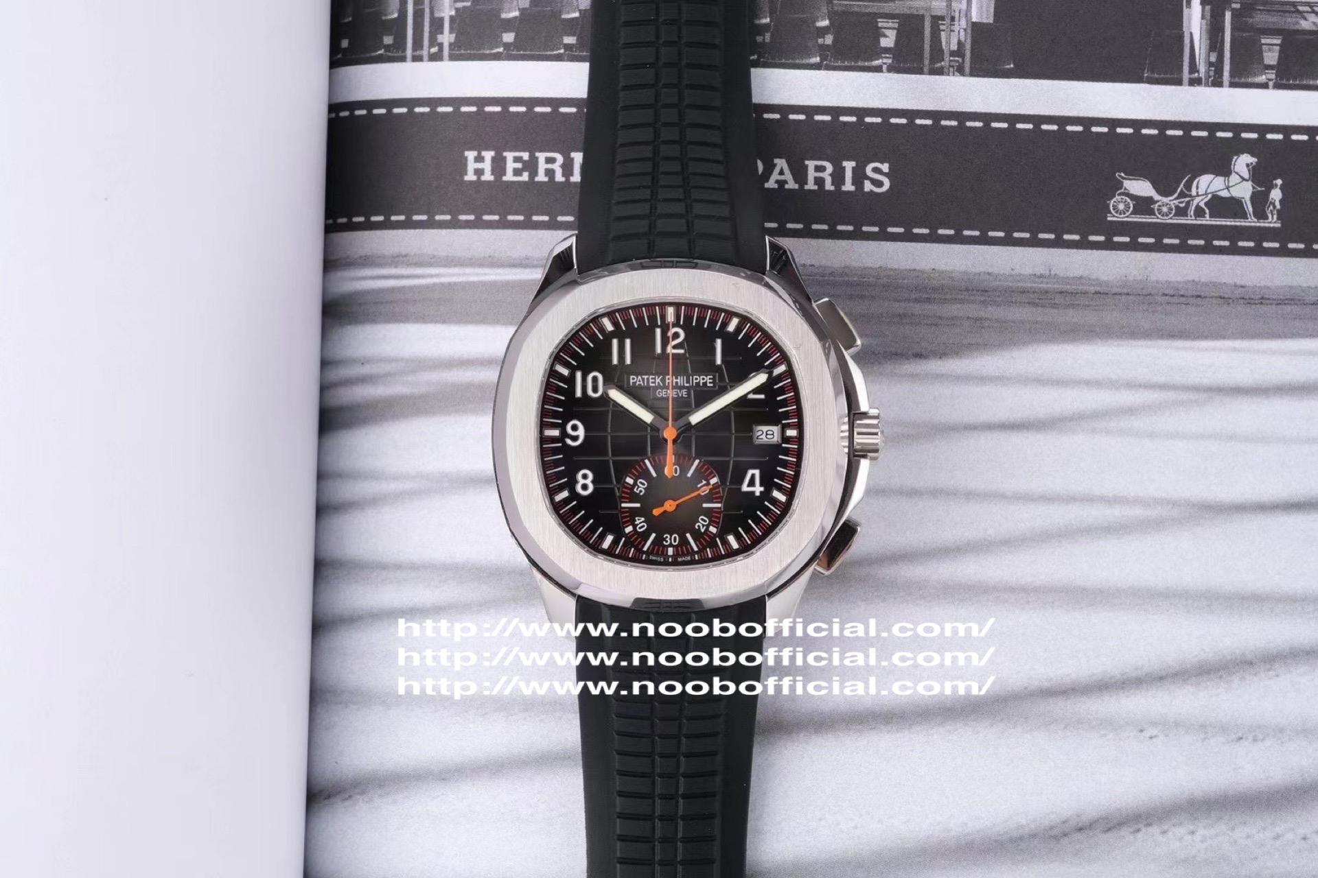 N百达翡丽新款计时手雷(计时Aquanaut)5968A彩色盘面和彩色胶带,表盘中央的计时秒针、刻度和6点位的30分钟计时盘刻度、计时指针都是橘黄色的