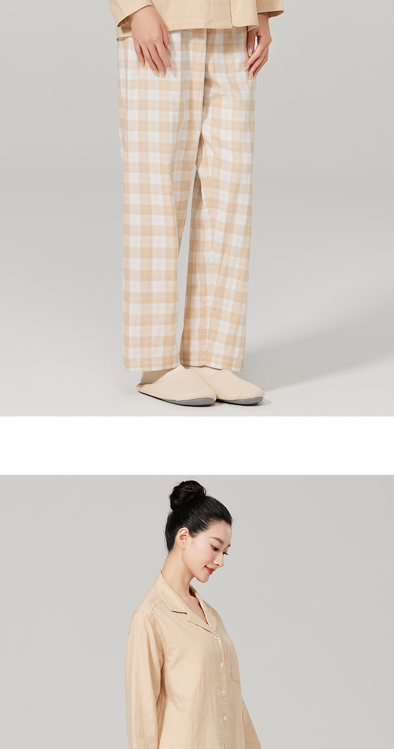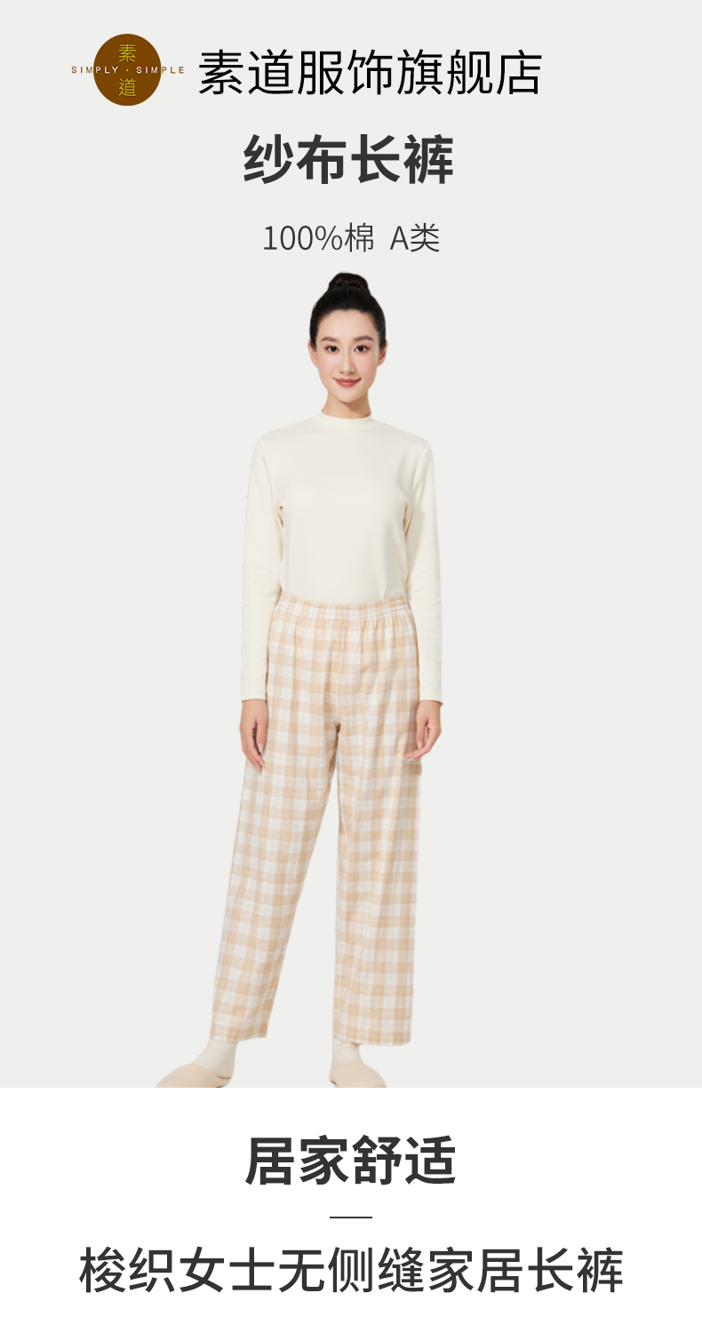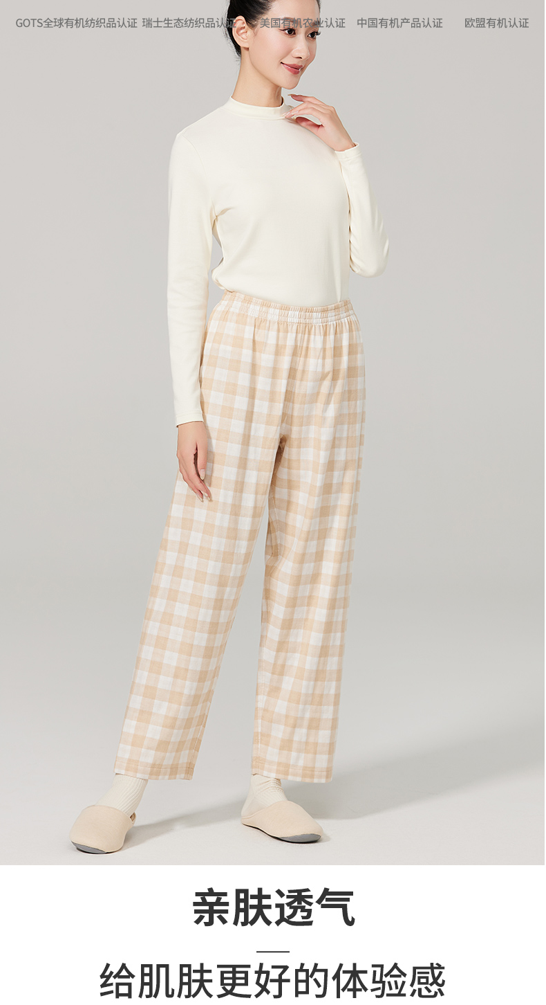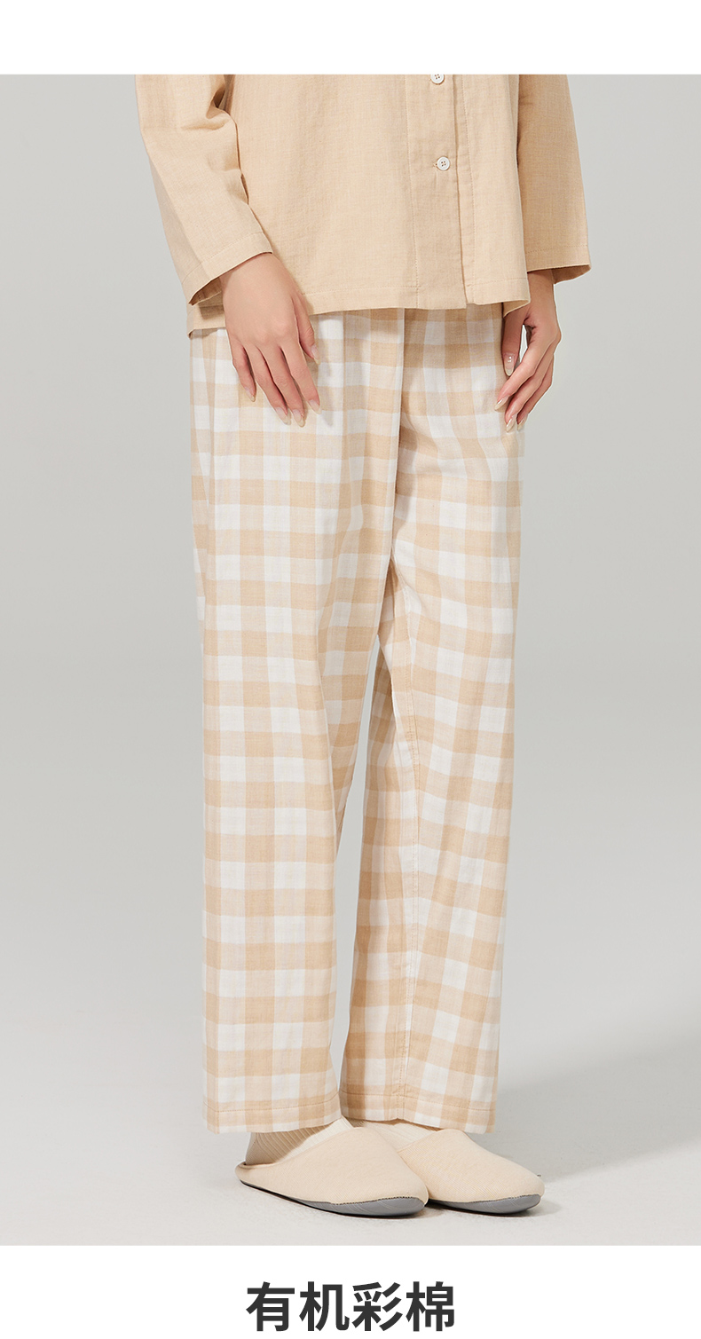 素道有机彩棉女士家居裤 100%棉纱布长裤松紧腰睡裤 梭织直筒女裤