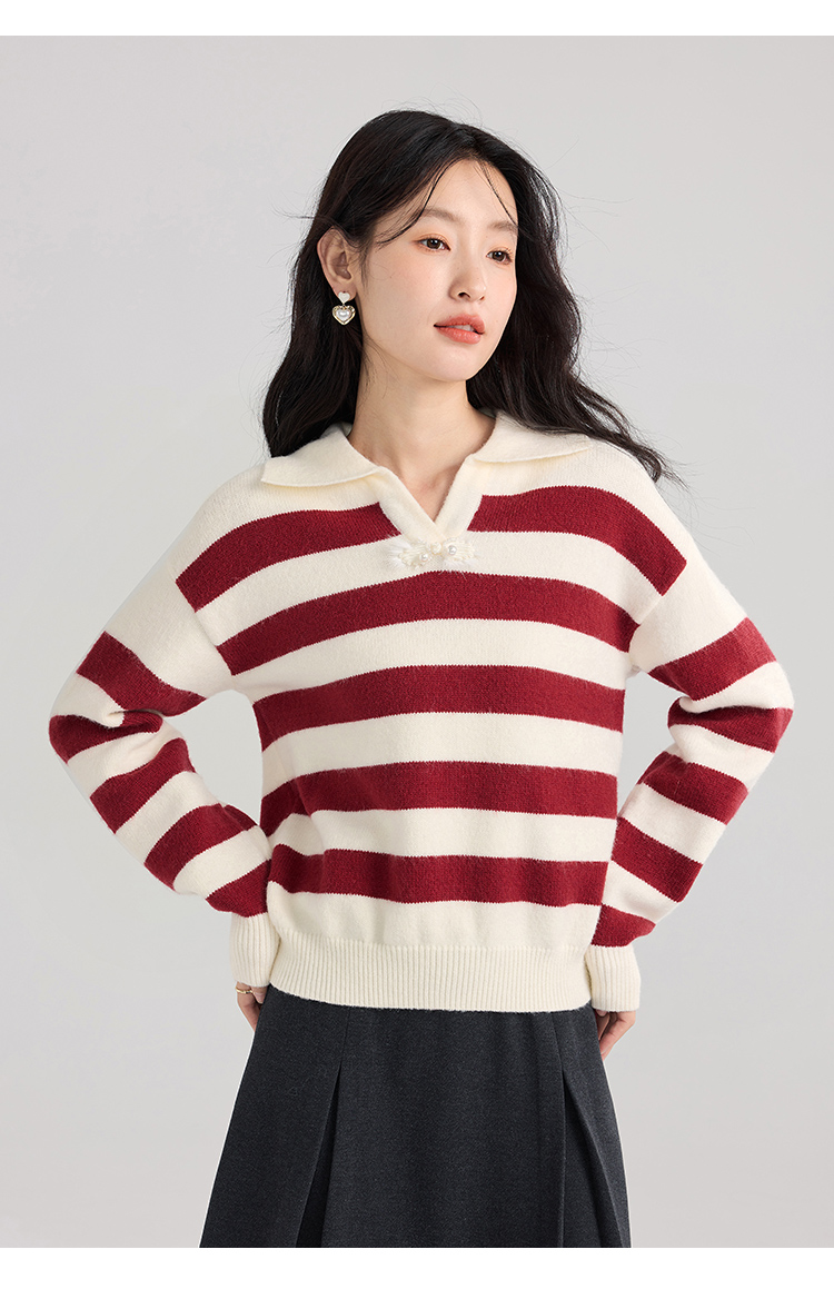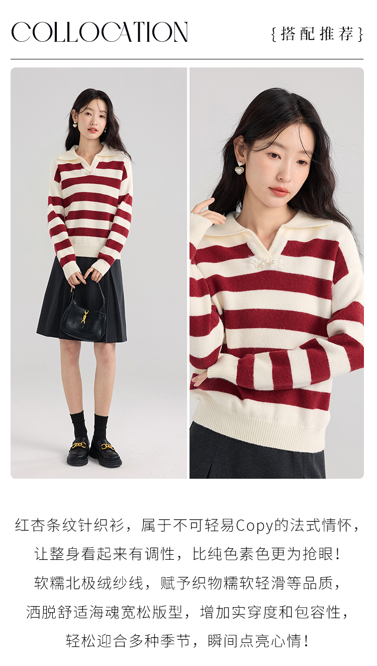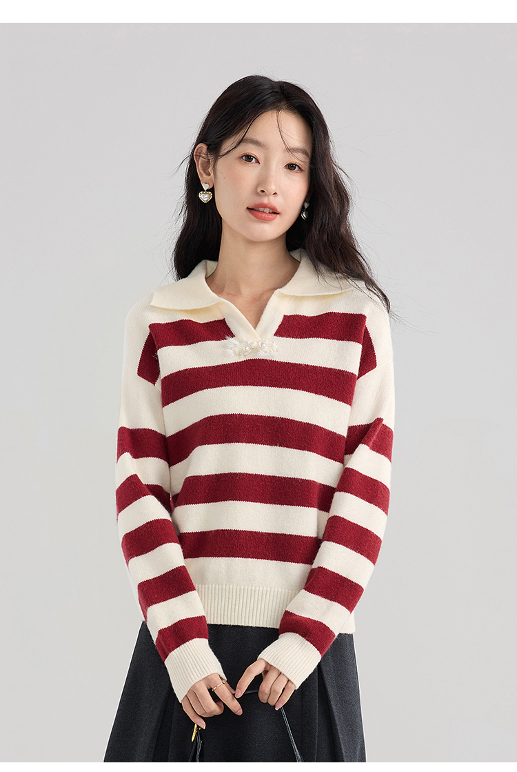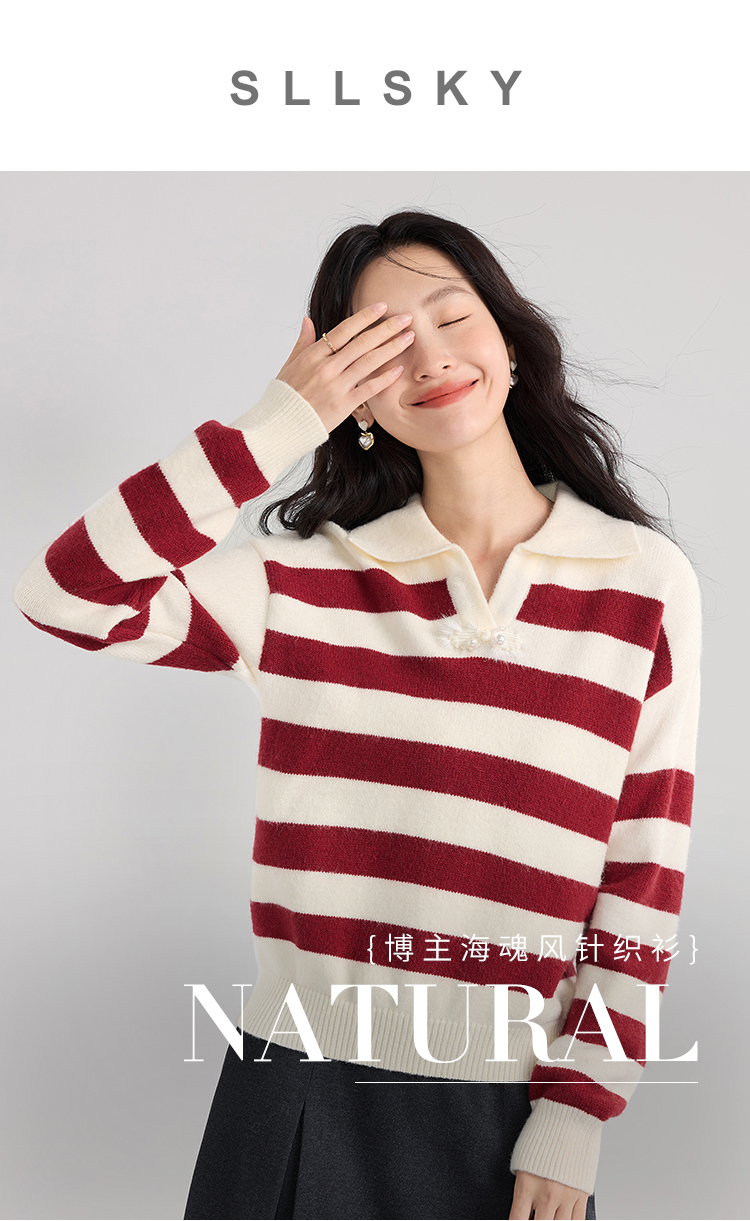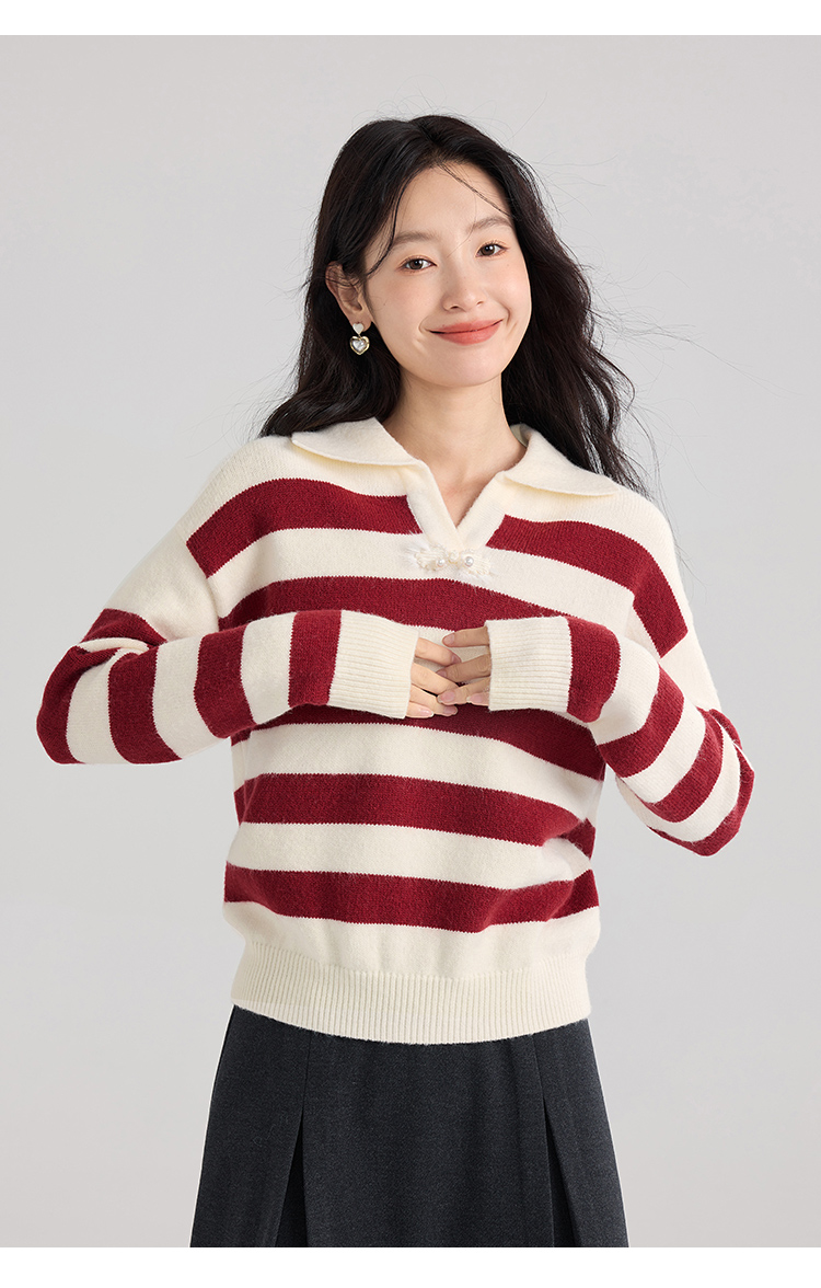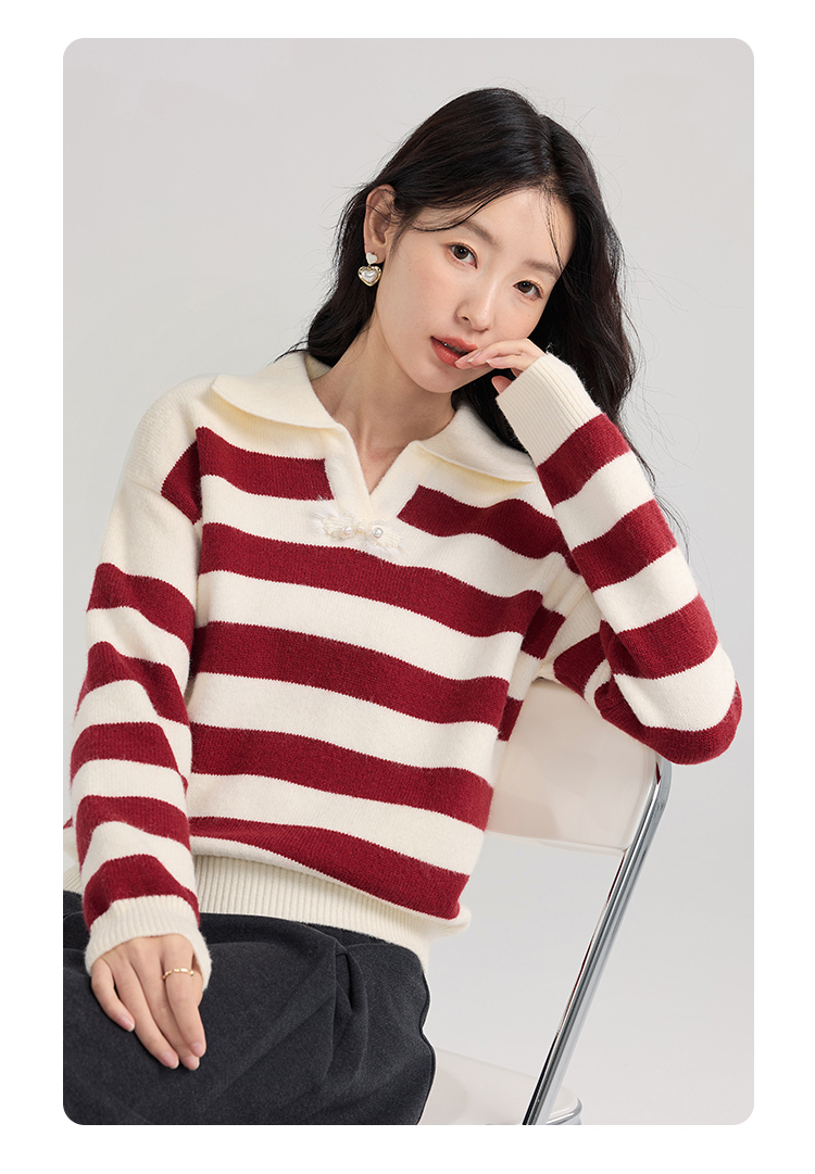 【专属特价】熙世界新中式粗条纹POLO领针织衫女秋冬款休闲毛衣上衣