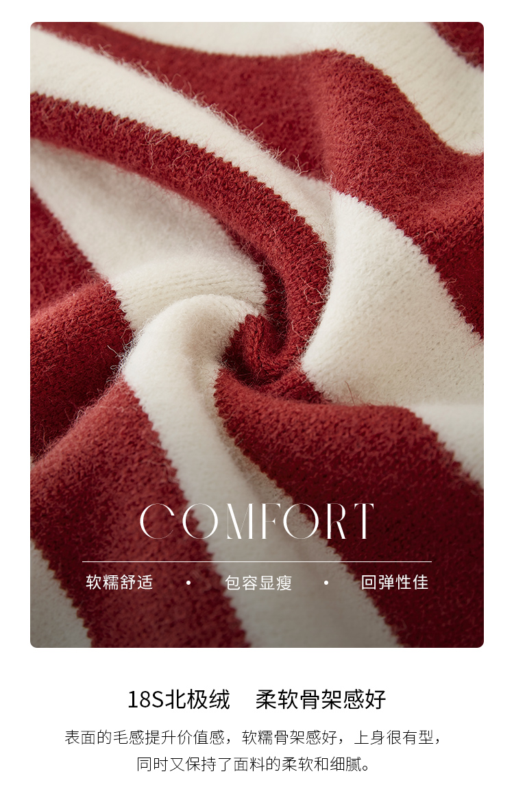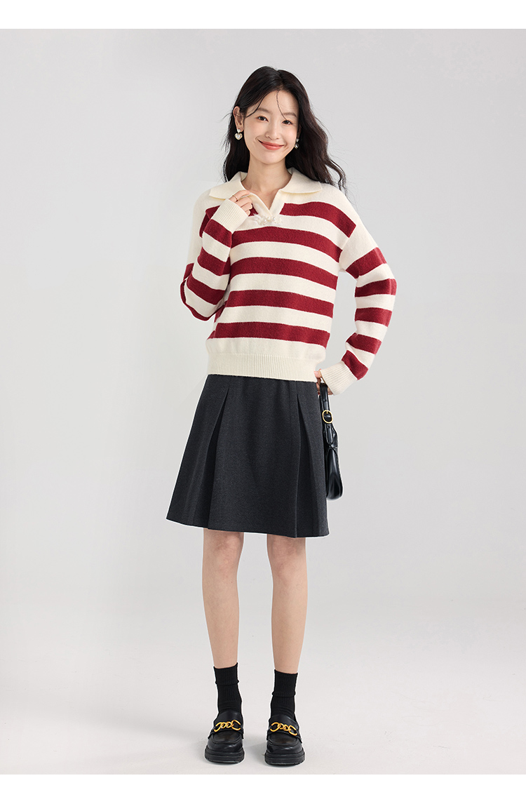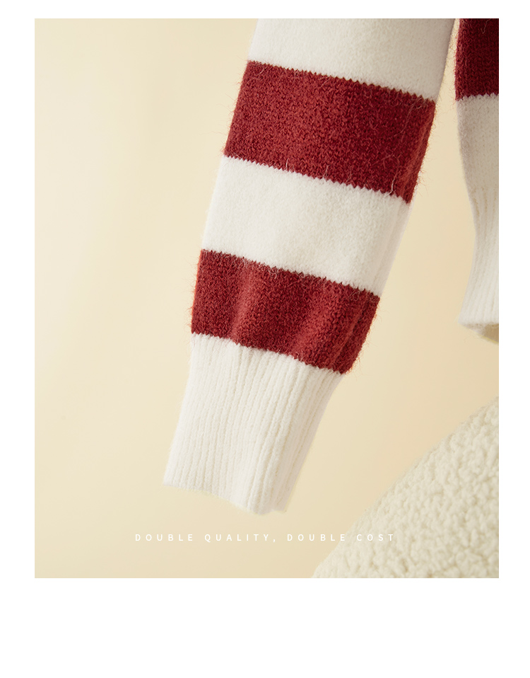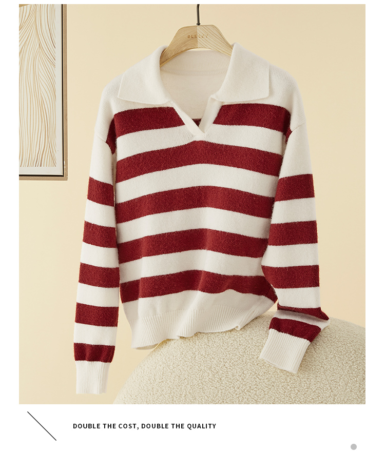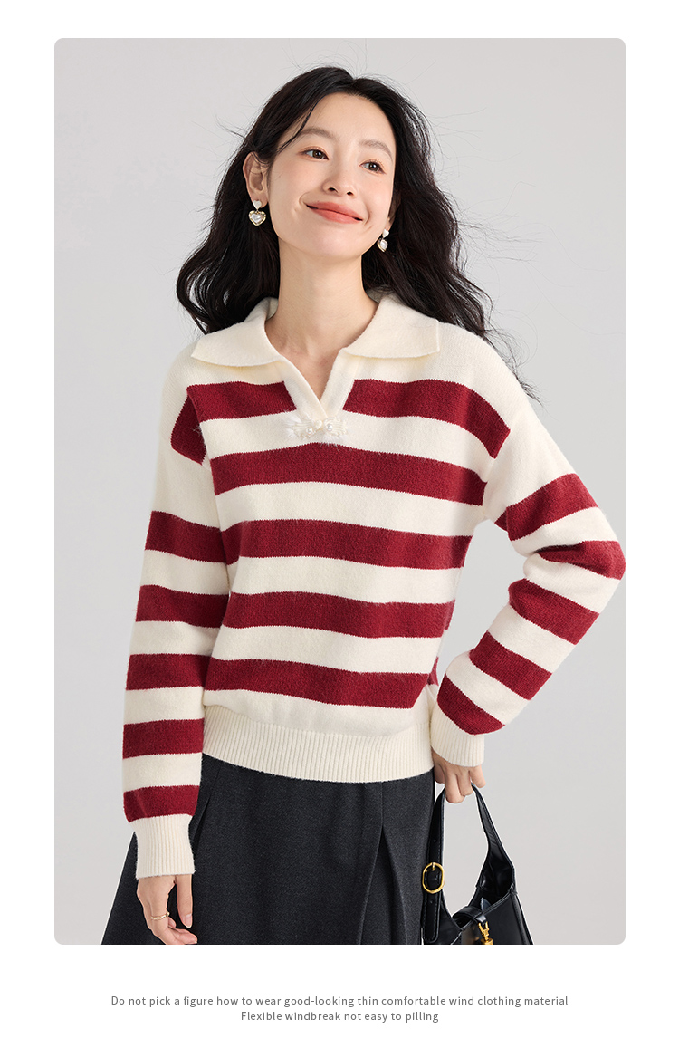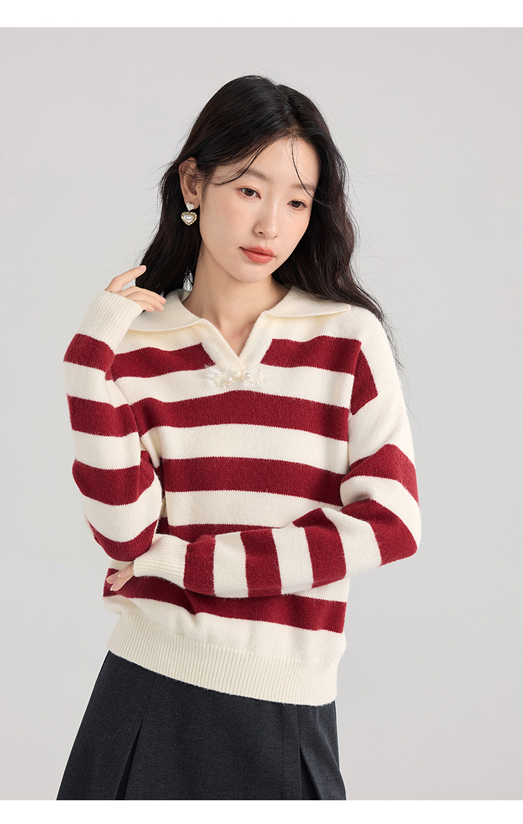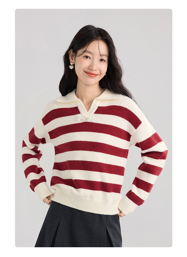 【专属特价】熙世界新中式粗条纹POLO领针织衫女秋冬款休闲毛衣上衣