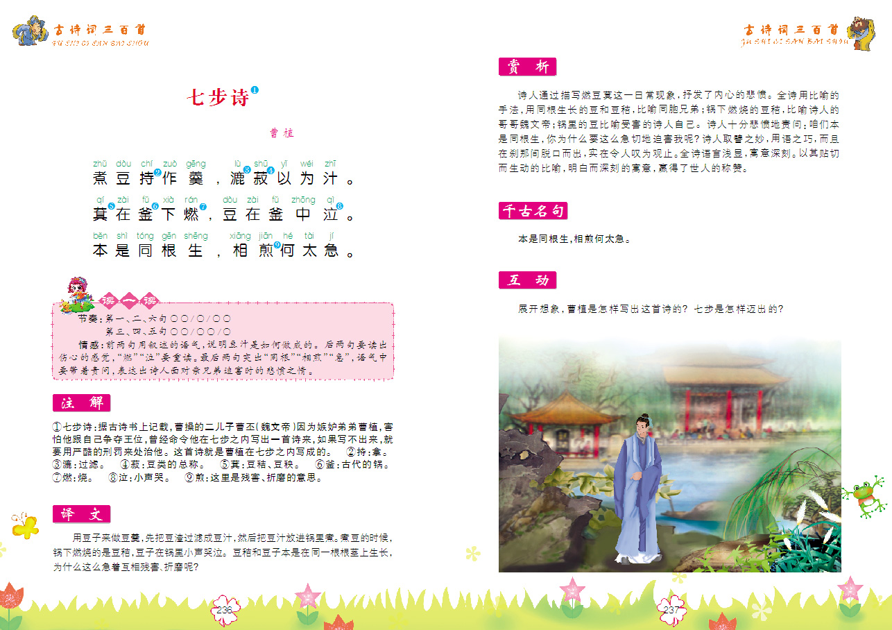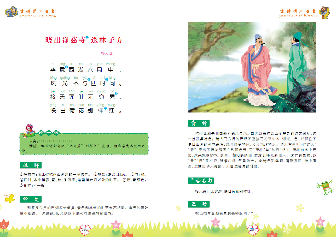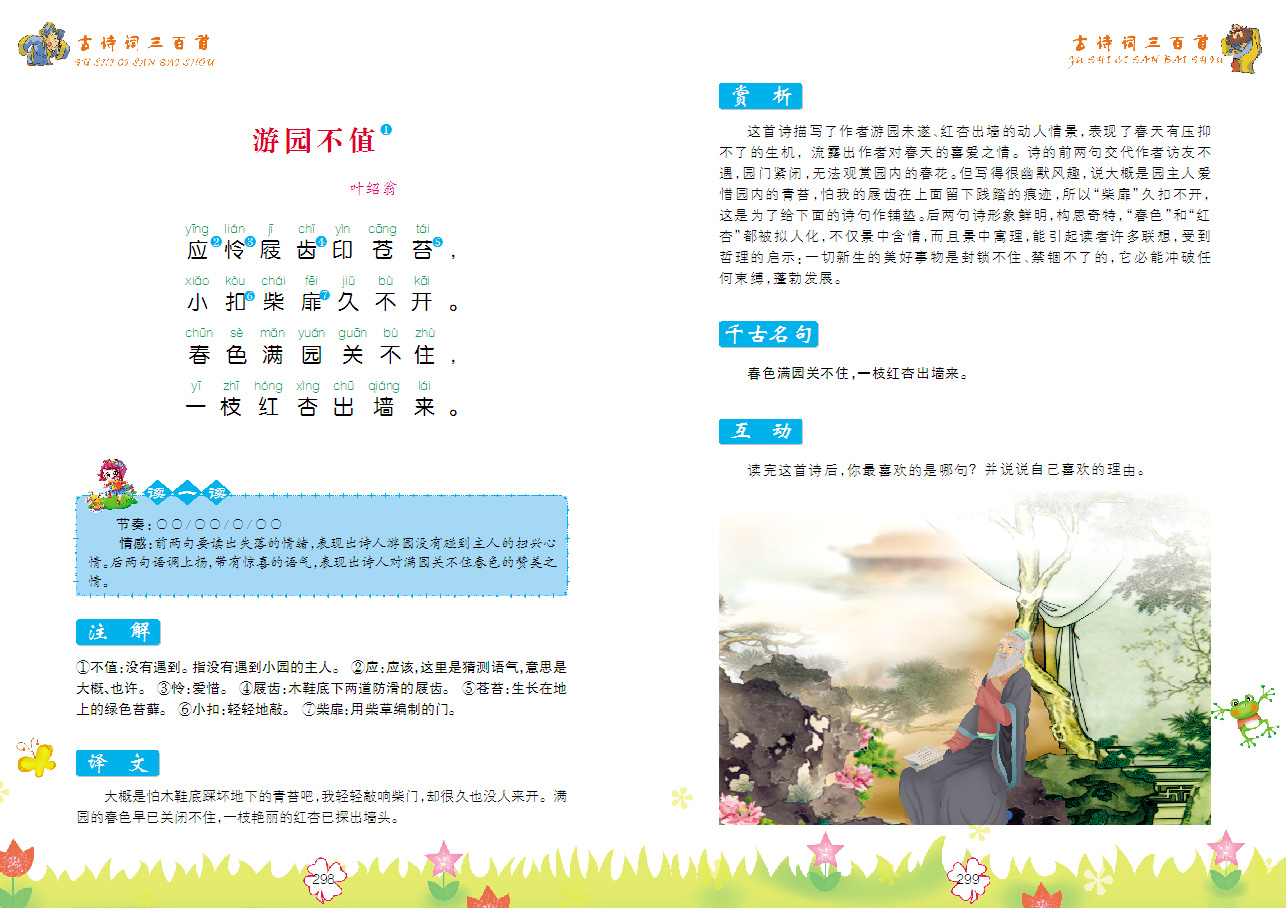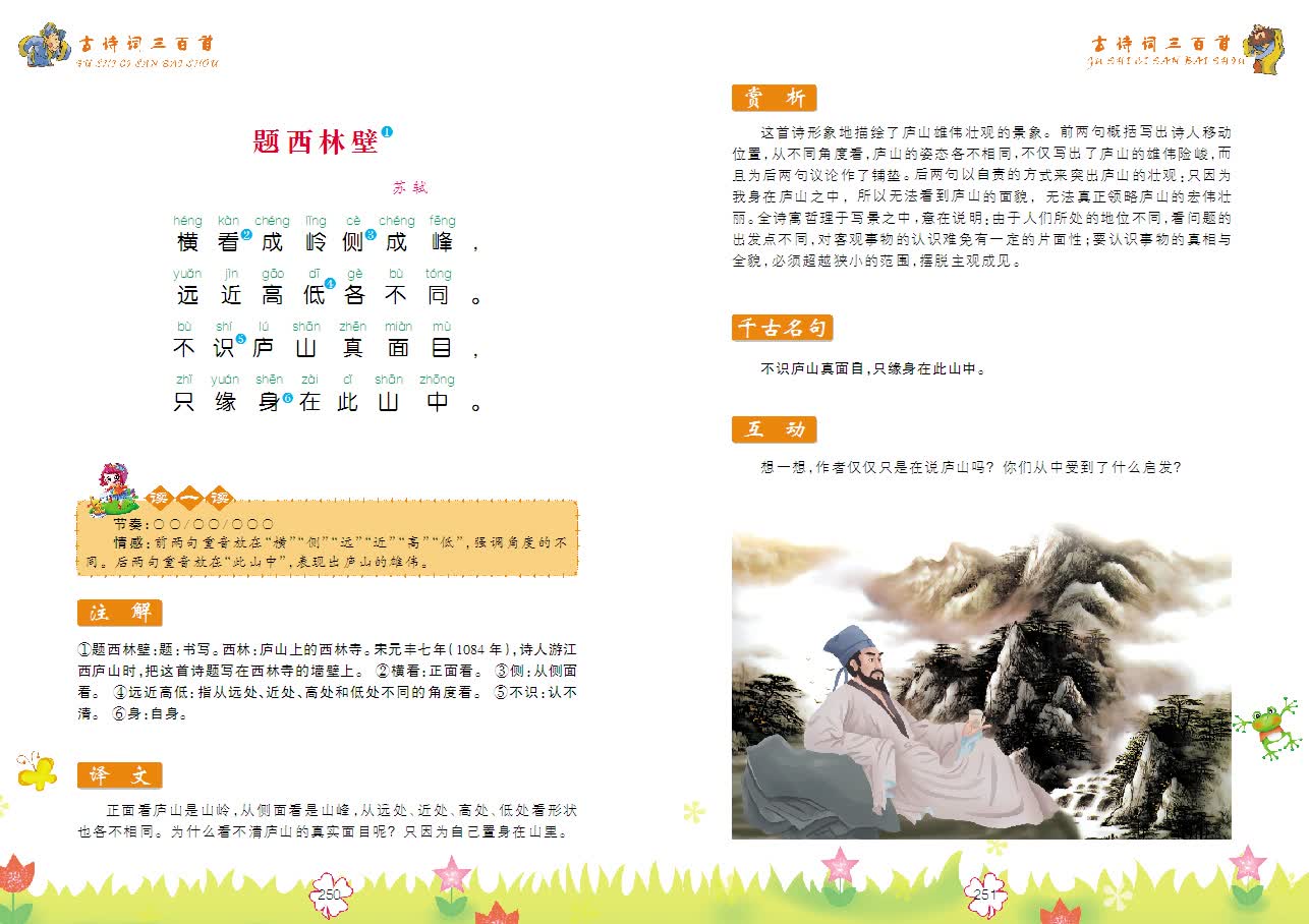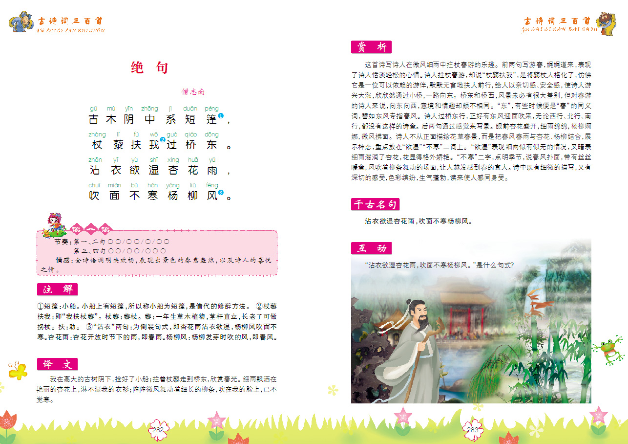 诗歌是中国古代文学的较高代表,从古至今诗歌的溪流在华夏文明中汇成滚滚大河,诗歌的韵律在中华大地上亘古不息。唐朝是中国诗歌发展的黄金时代。唐朝二百多年间,云蒸霞蔚,名家辈出,唐诗数量多达五万首。唐诗蕴含空灵之境,唐诗寄托诗人情怀;唐诗承载国恨家仇,唐诗写尽坎坷人生。千种感情,万种感叹,平平仄仄,动人心魄。唐诗经过一千多年的传诵,仍以其隽永的韵味和独有的艺术魅力,成为不同历史时期众多家庭的首要读物。本书中的每首诗词都分为原文、读一读、注解、译文、赏析、千古名句、互动七部分,对其进行全方位解读,方便读者学习和理解。希望本书能成为孩子们学习古典诗词的不错读本。
