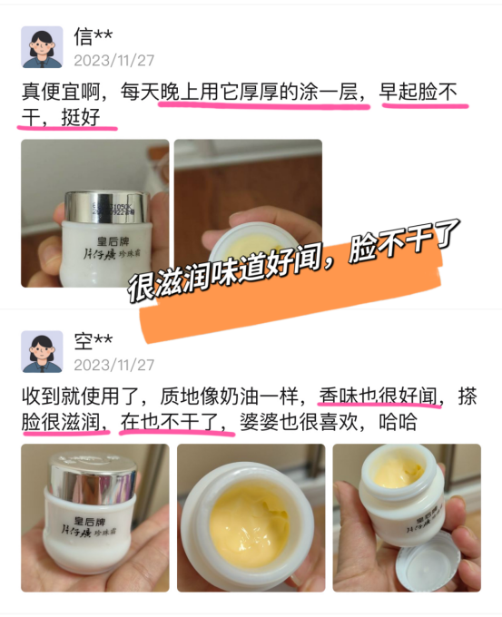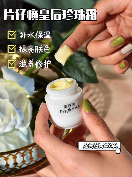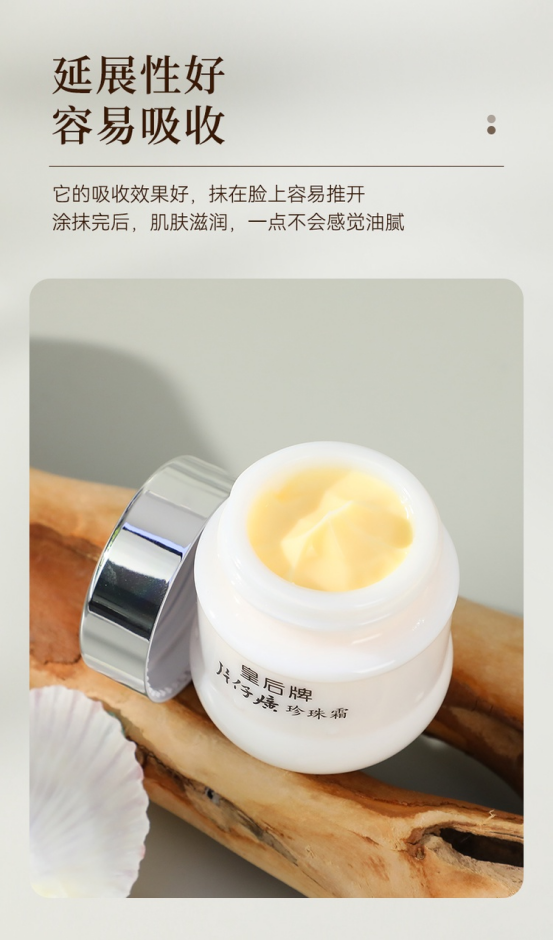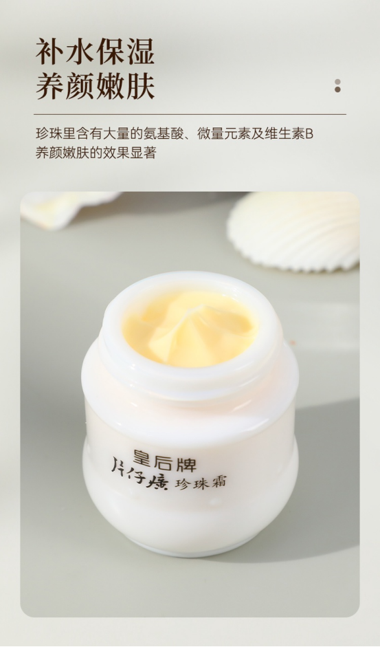 肌肤平时保养少,一到换季,干燥、起皮、松垮就接踵而来 随着年龄增长,衰老状态明显 肌肤里的水分不断流失,皮肤失去“保鲜力”,主要原因是缺水 皇后牌片仔癀珍珠霜,补足肌肤水分,不干不起皮,又能维持肌肤健康状态