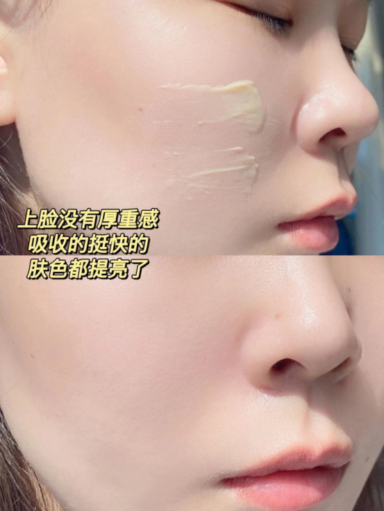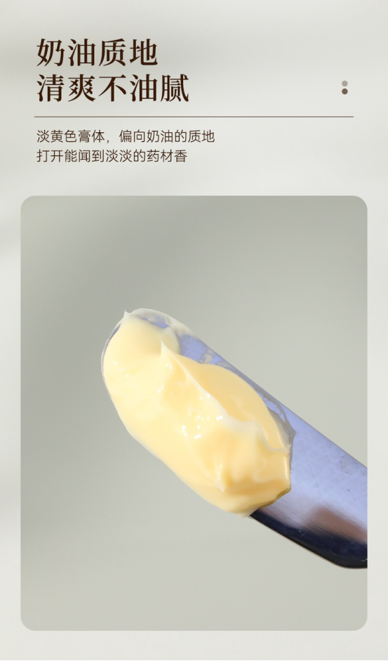 奶油质地,清爽不油腻 淡黄色膏体,偏向奶油的质地 打开能闻到淡淡的药材香 抹豆子大小上脸,清清爽爽 柔滑不油腻,上手很好推开 一会儿就被肌肤吸收得干干净净