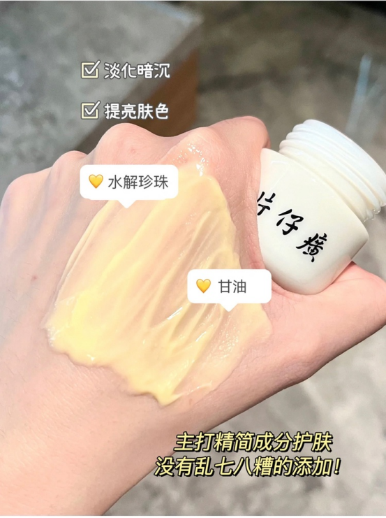 除了有传统的养颜成分 还添加了水解珍珠和甘油这两个天然温和的成分 水解珍珠与市面上的珍珠粉相比 分子小更易于被皮肤吸收 能够有效阻挡黑色素的生成 再与甘油结合起到了1+1