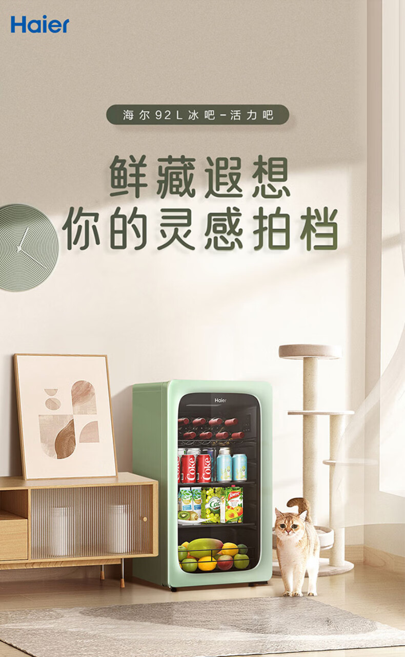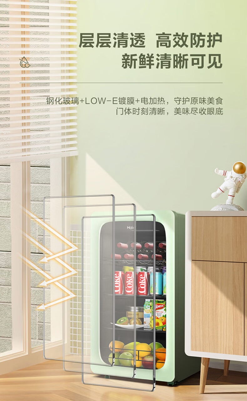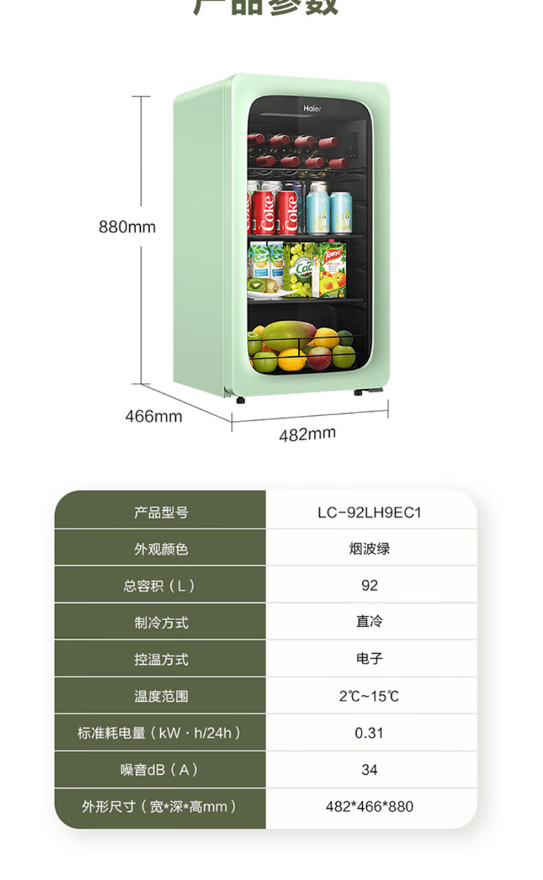 海尔(Haier)冰吧家用92升透明玻璃门小型冰吧客厅办公室饮料茶叶冷藏柜水果立式保鲜柜LC-92LH9EC1