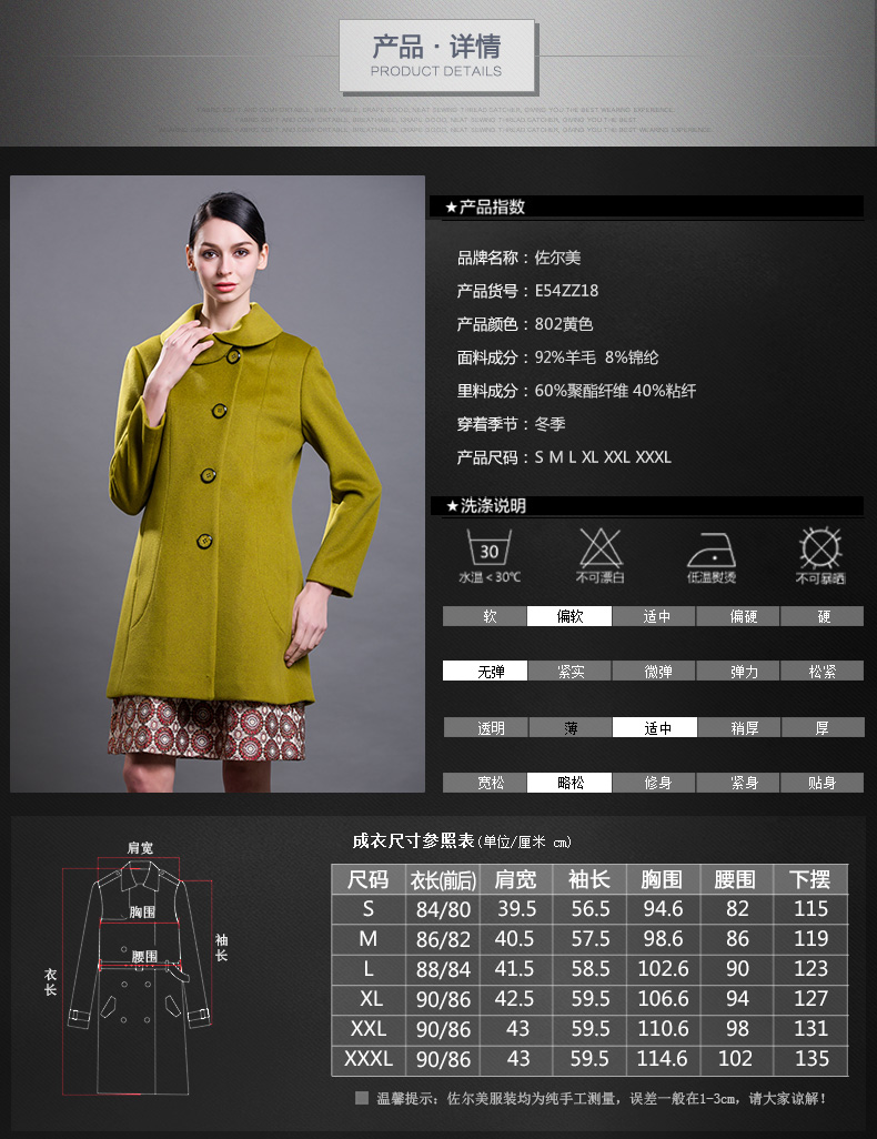 佐尔美冬纯色大码女装中长款修身显瘦羊毛大衣毛呢外套女E54ZZ18