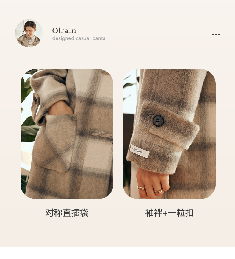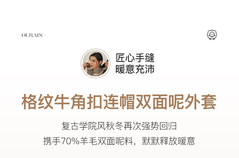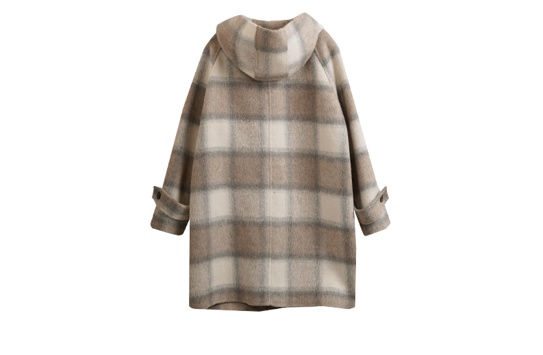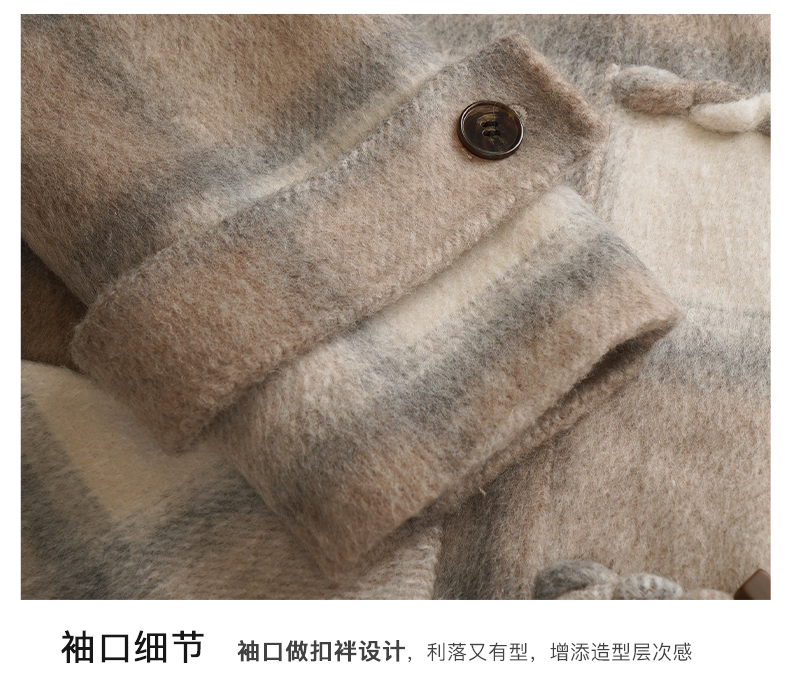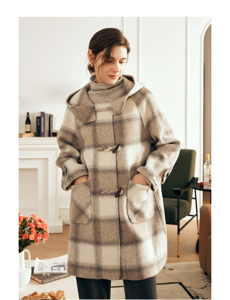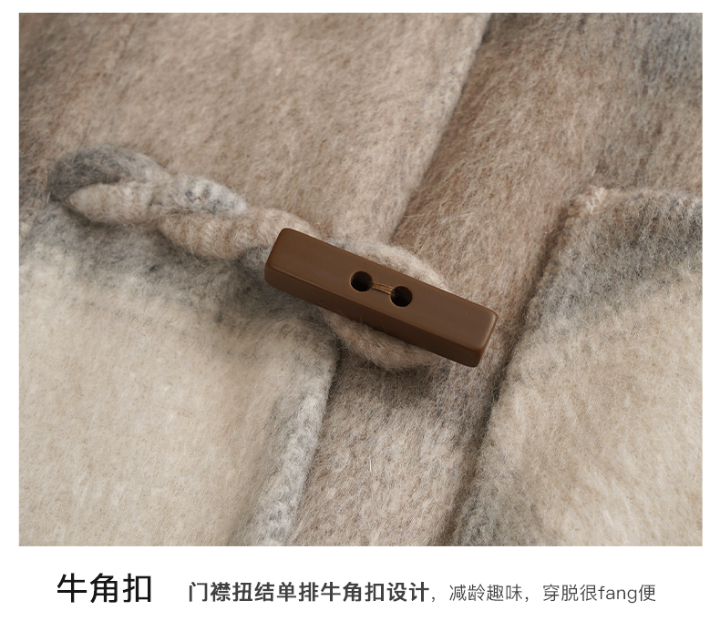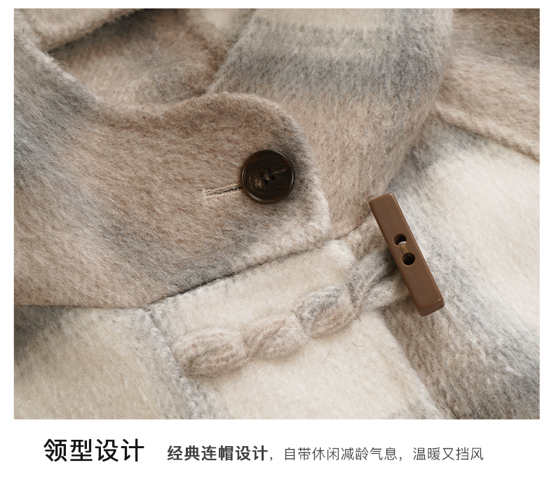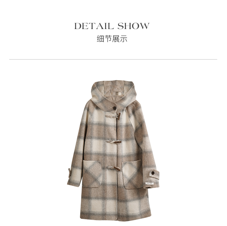 欧芮儿格纹牛角扣连帽双面呢外套复古学院风