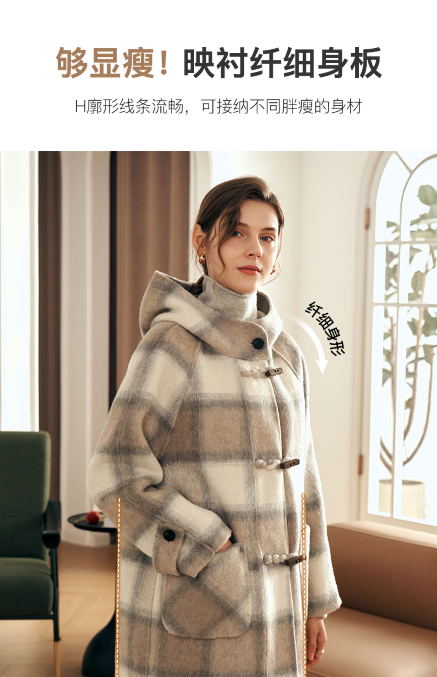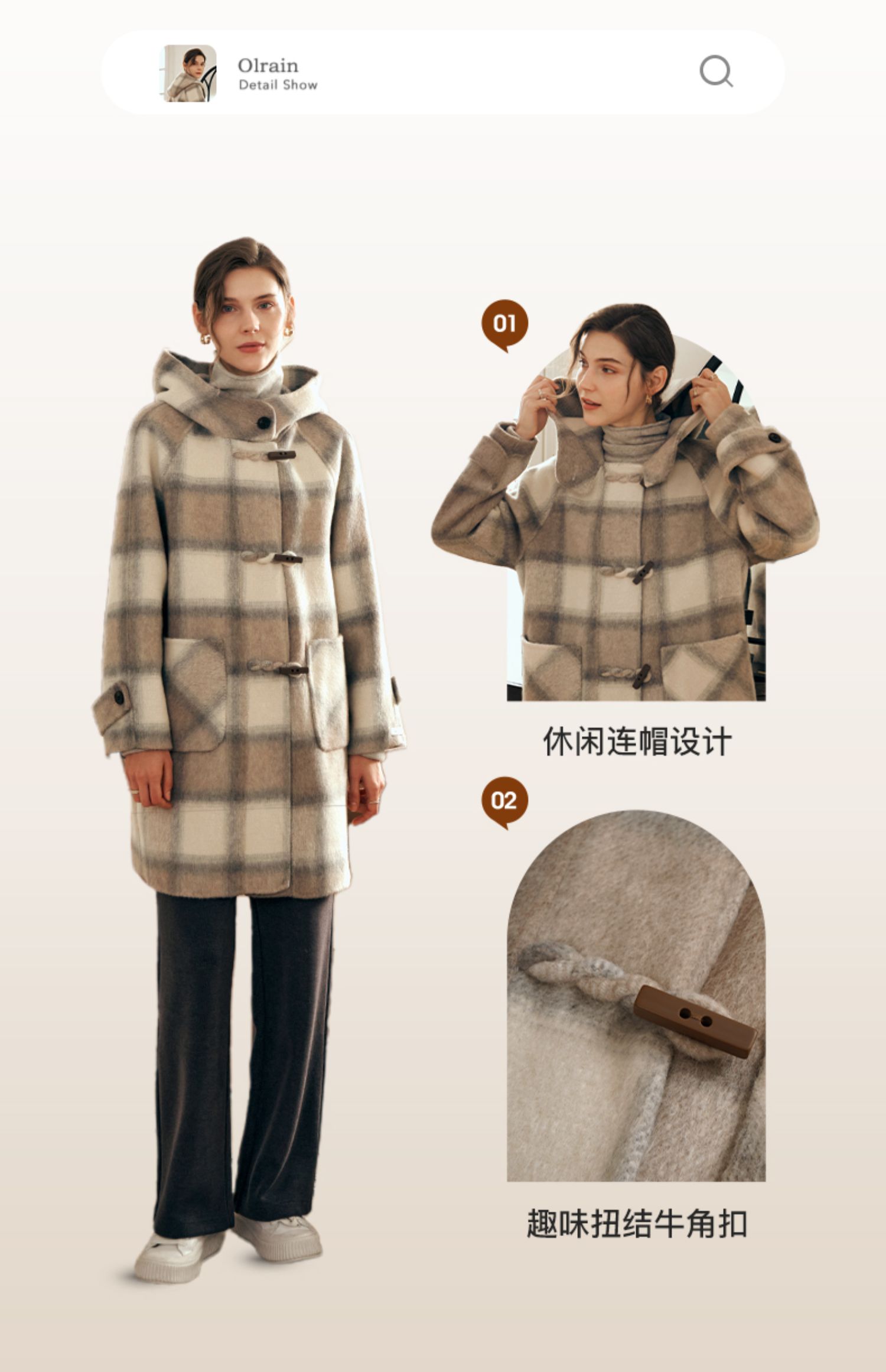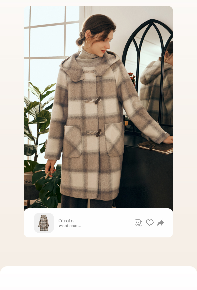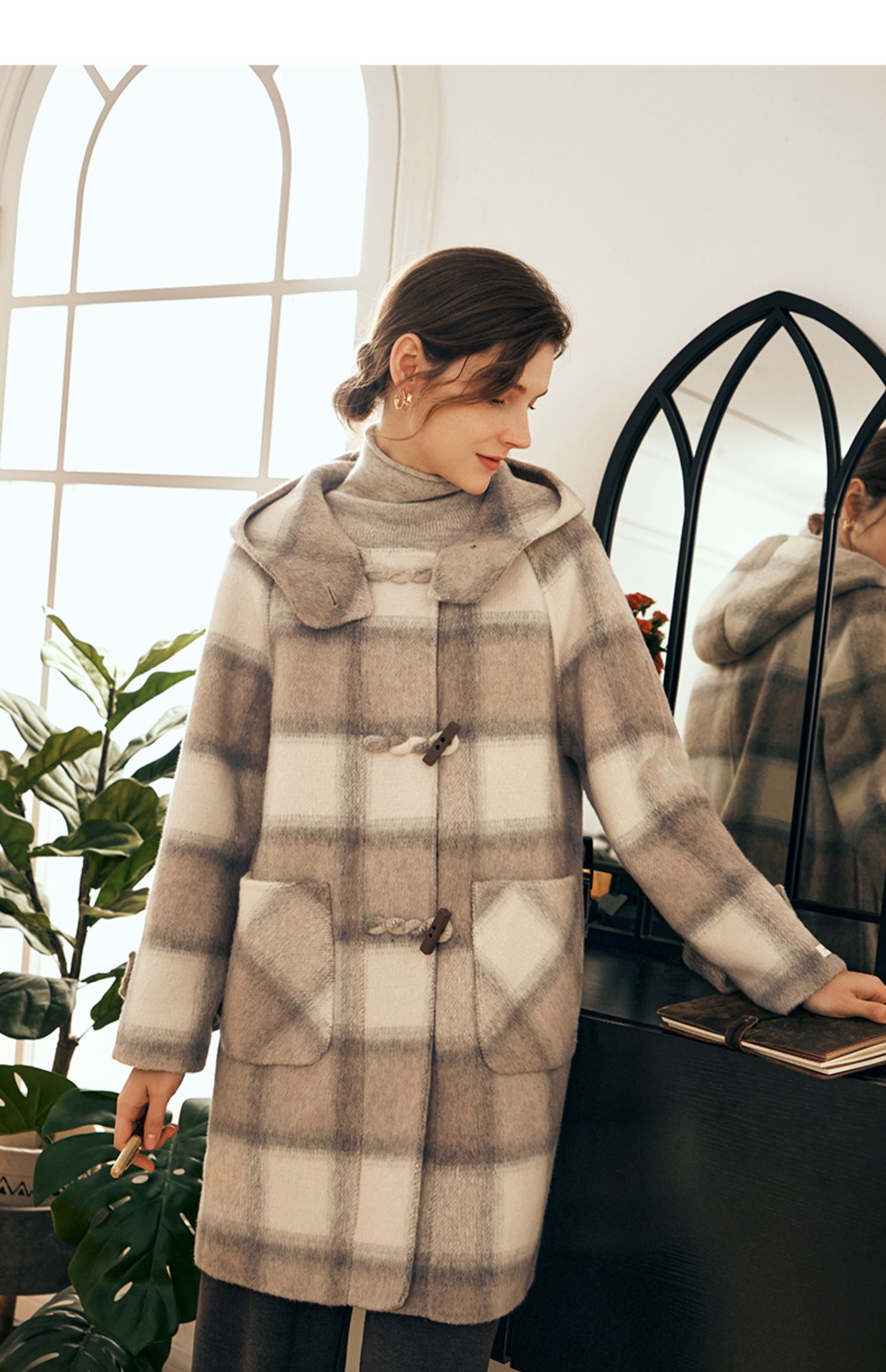 欧芮儿格纹牛角扣连帽双面呢外套复古学院风