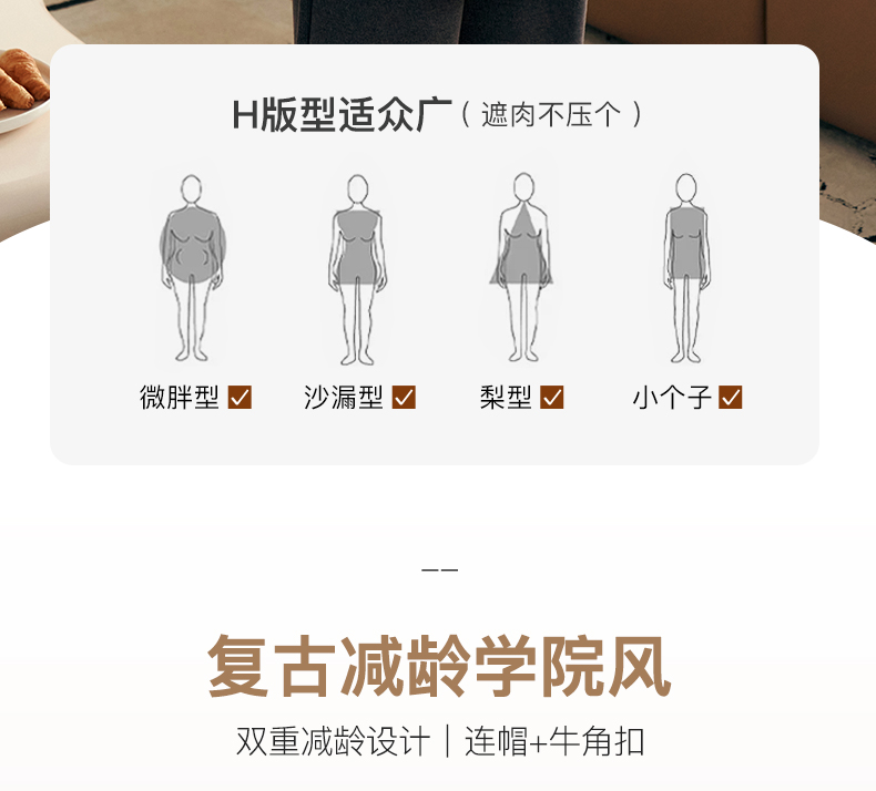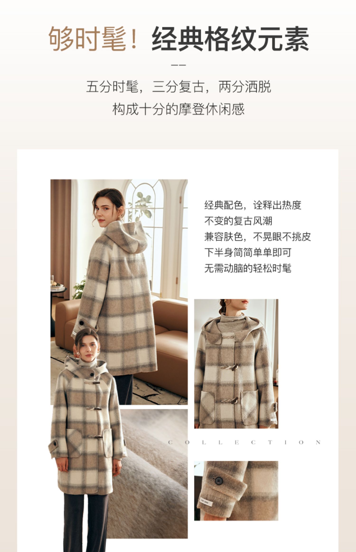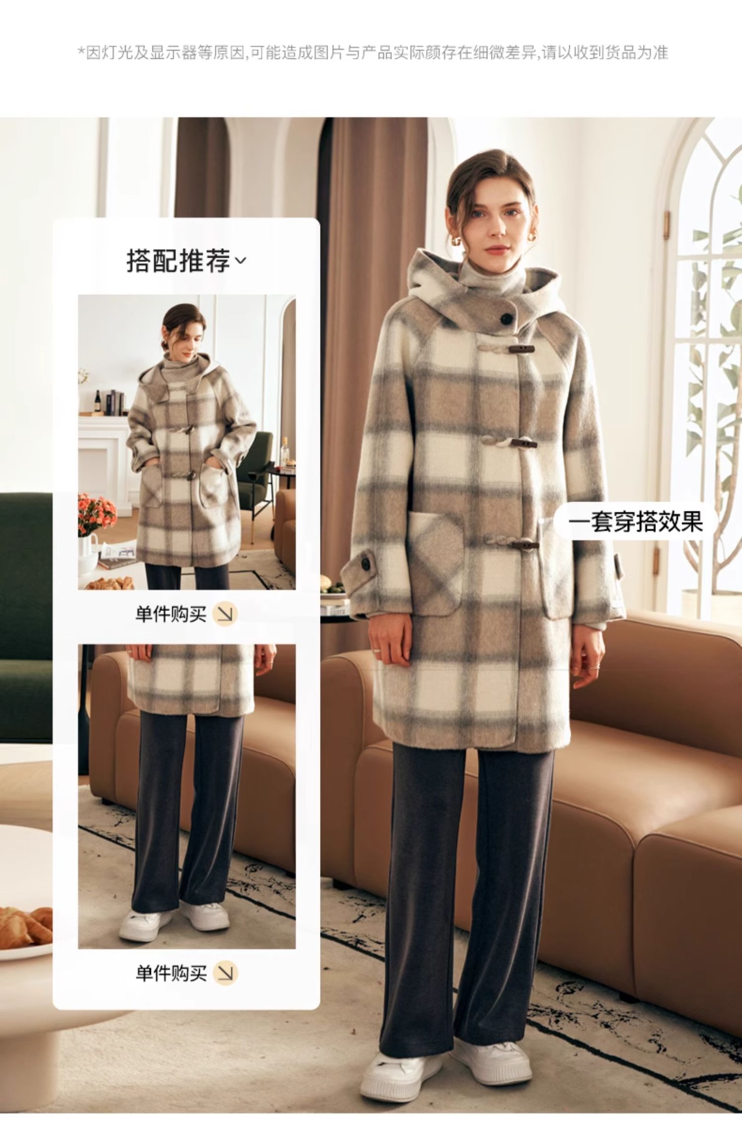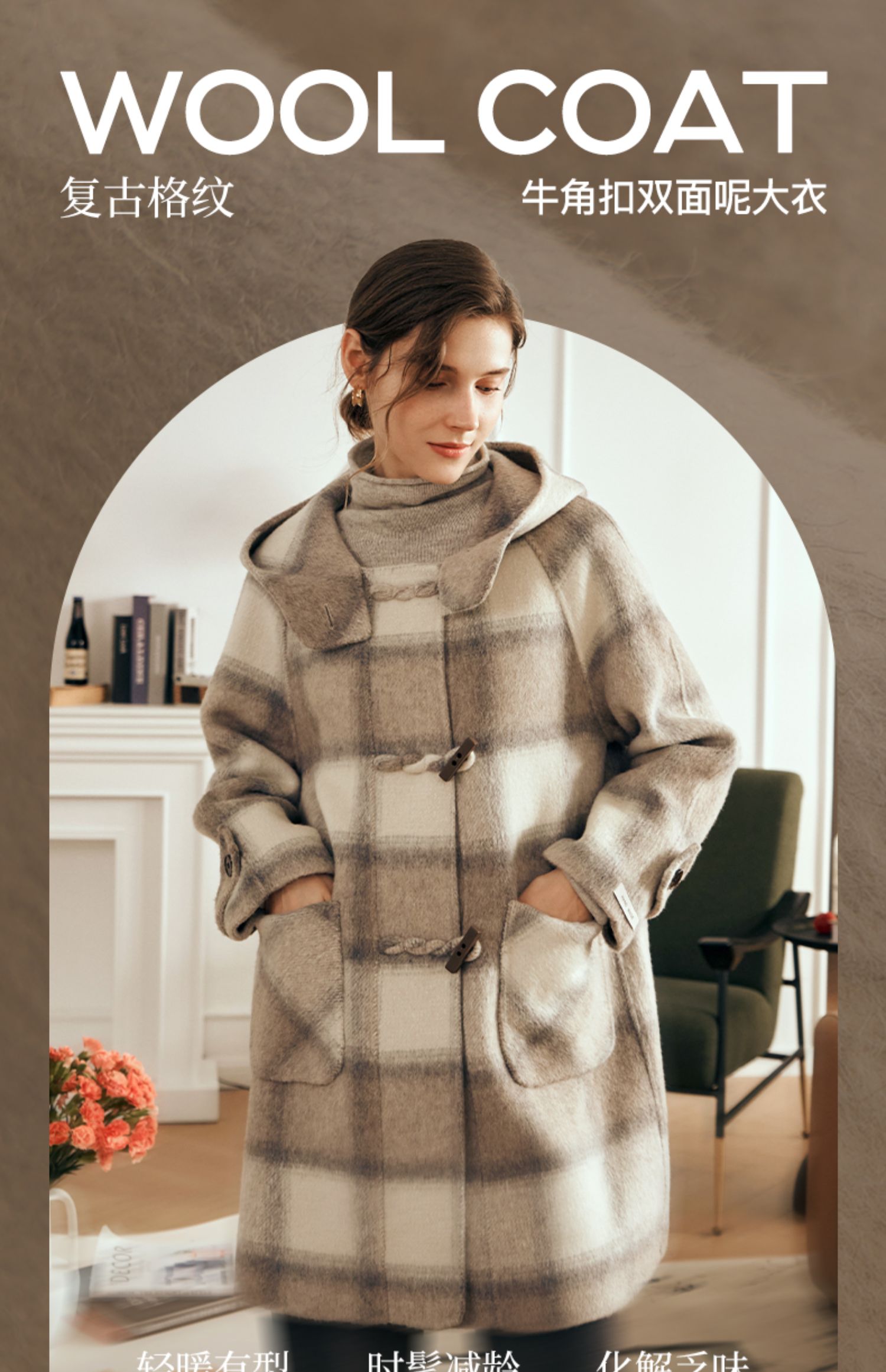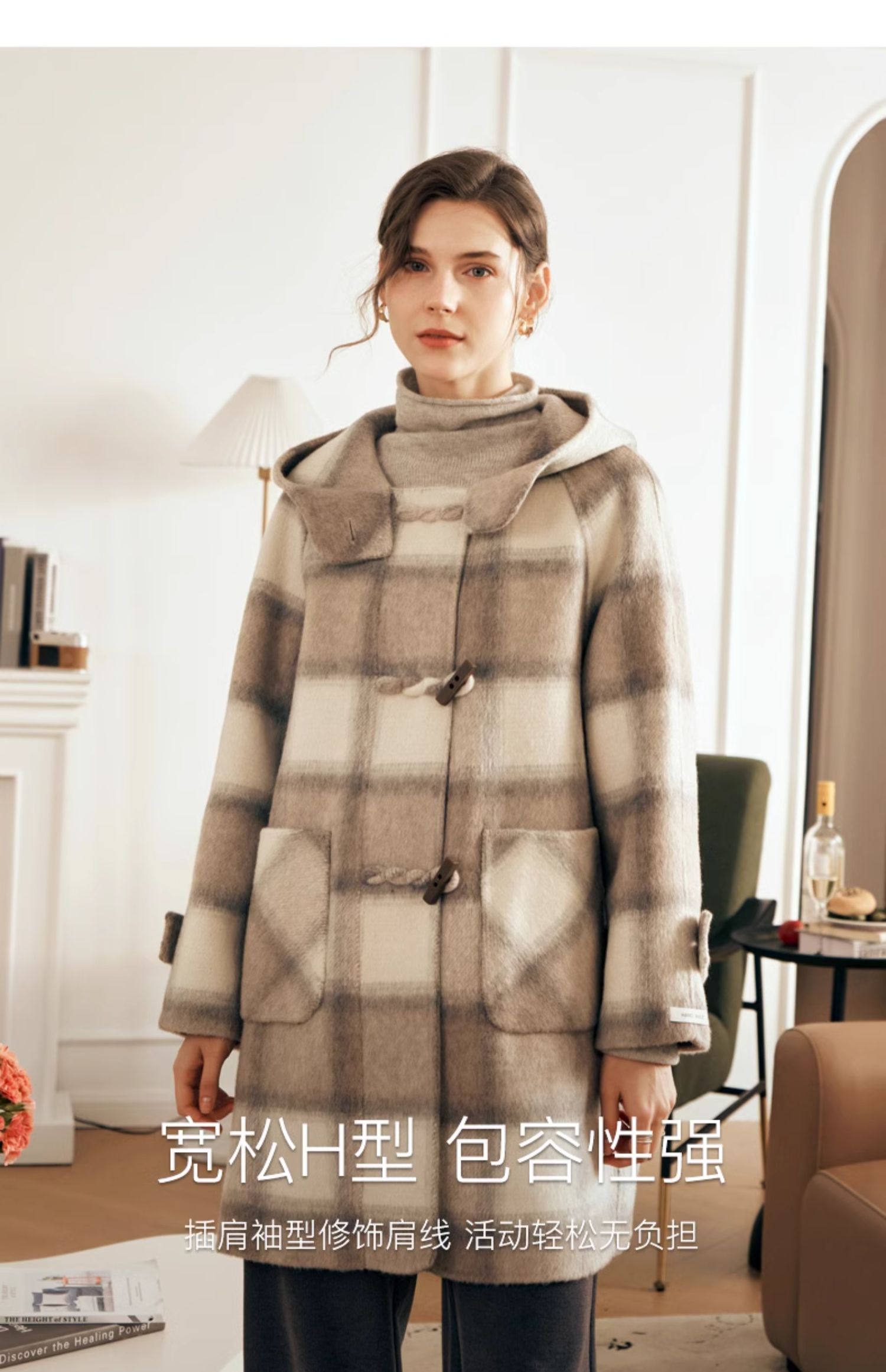 欧芮儿格纹牛角扣连帽双面呢外套复古学院风