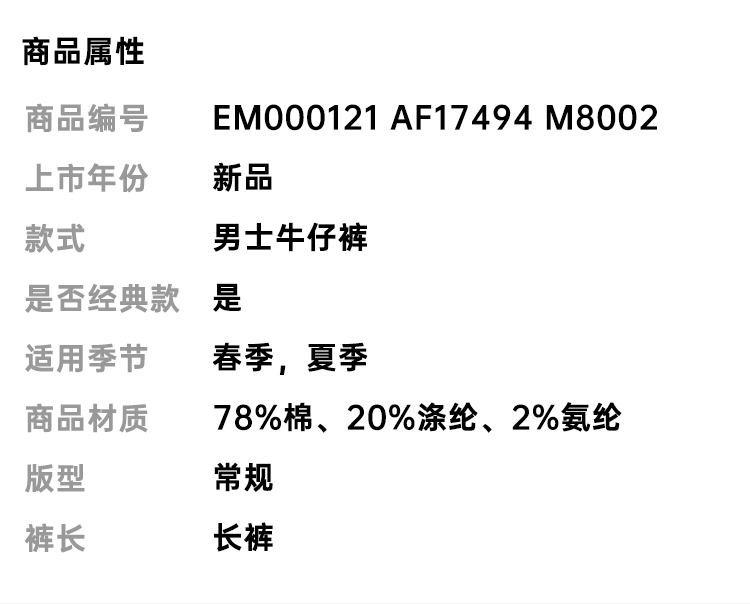 EMPORIO ARMANI 阿玛尼 男士徽标贴片牛仔裤 灰色 EM000121 AF17494 M8002