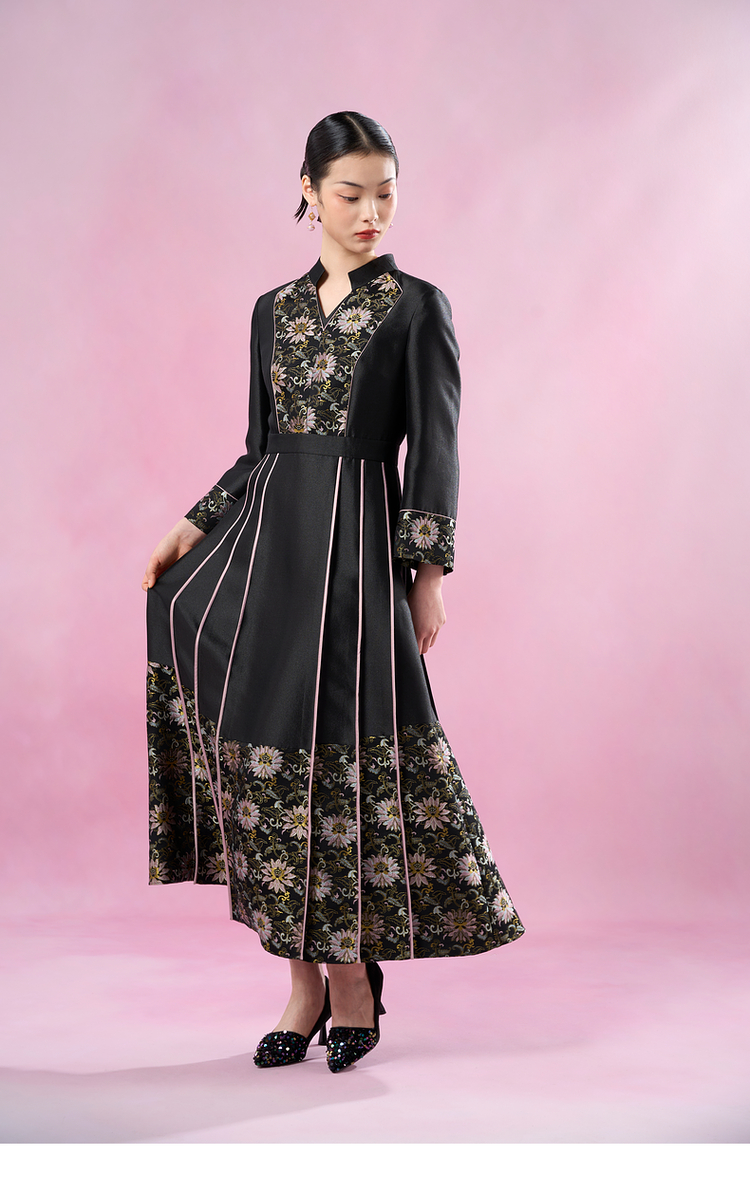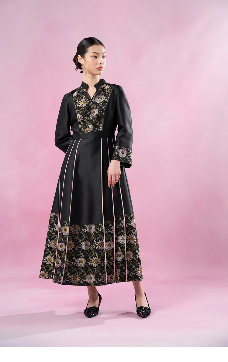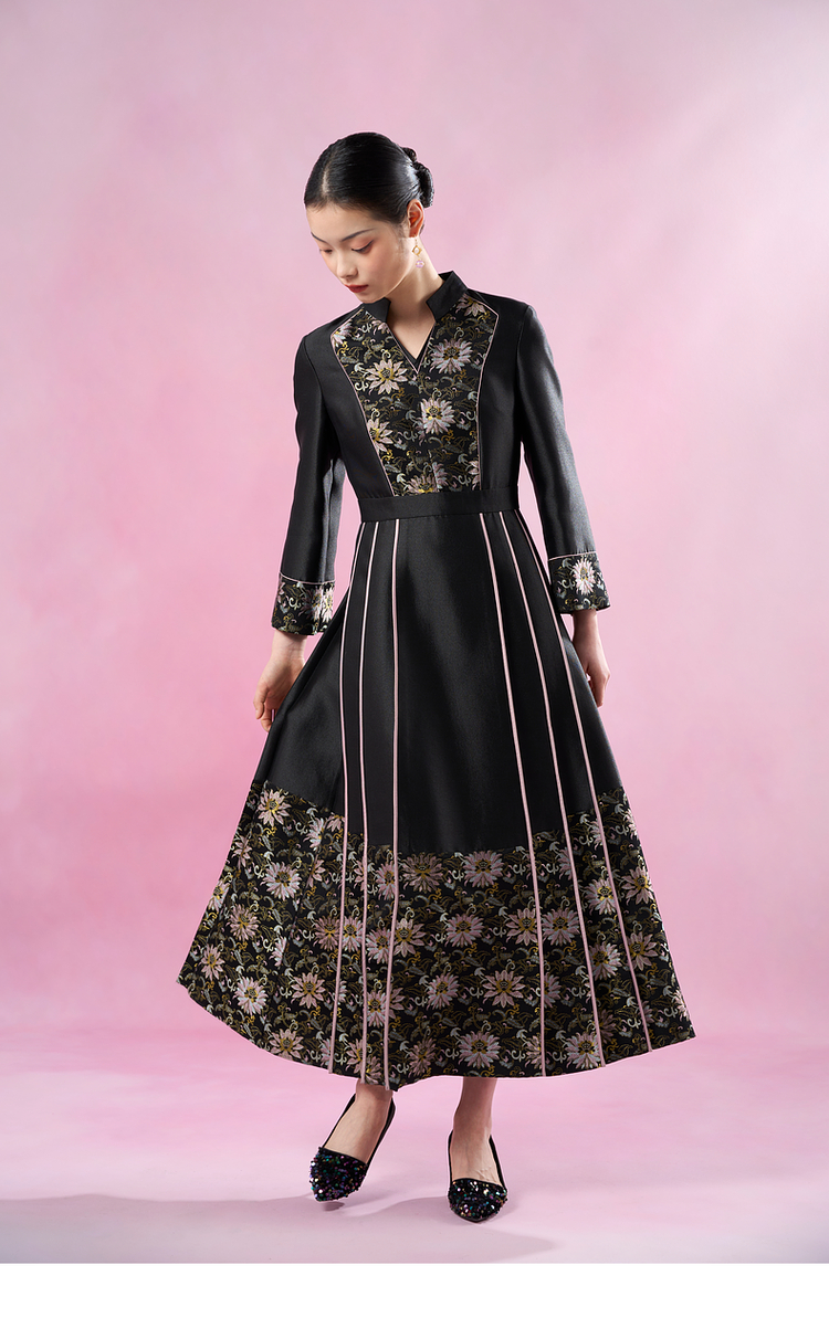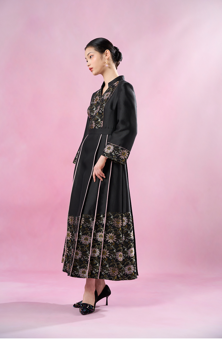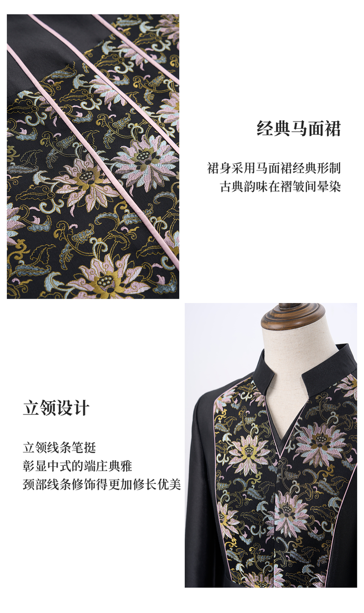 吉祥衣家2025春夏新款气质长袖绣花新中式国风修身如意莲依连衣裙