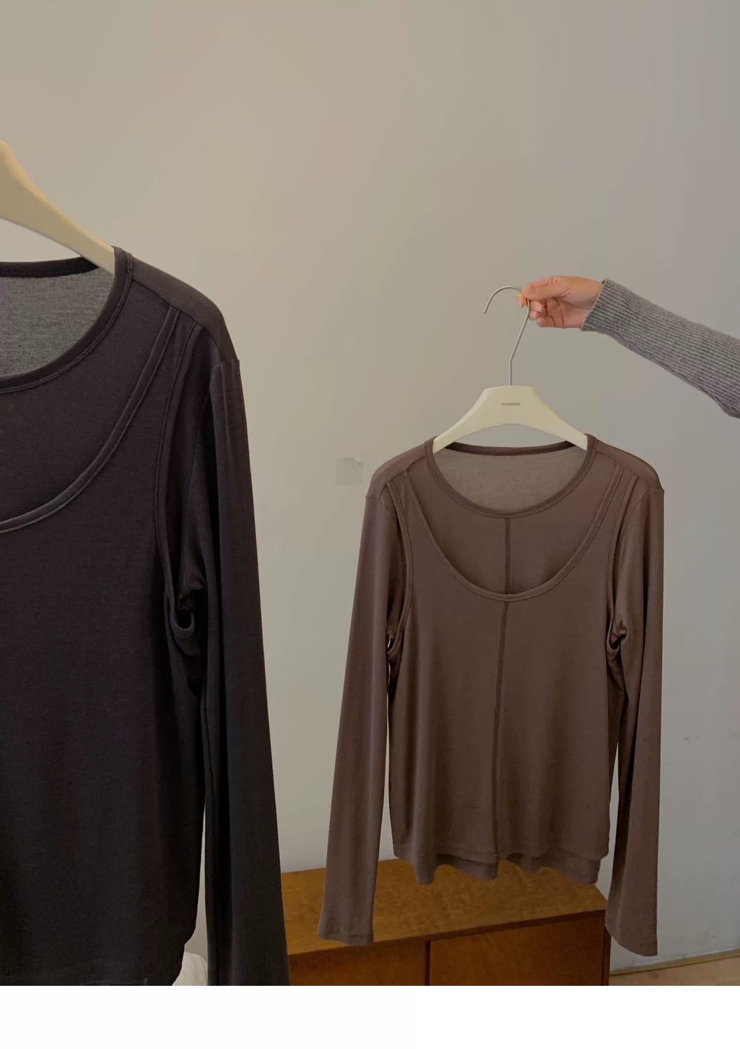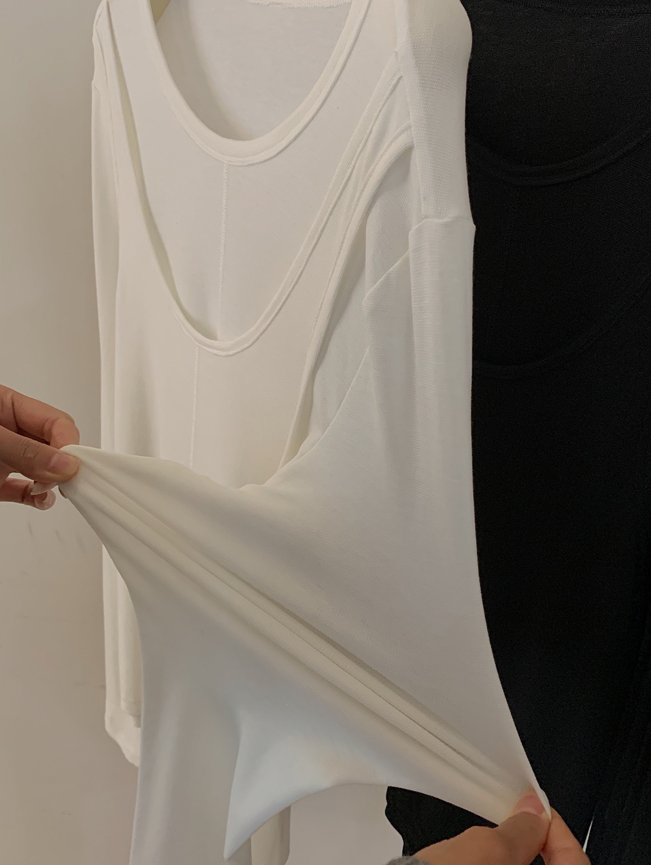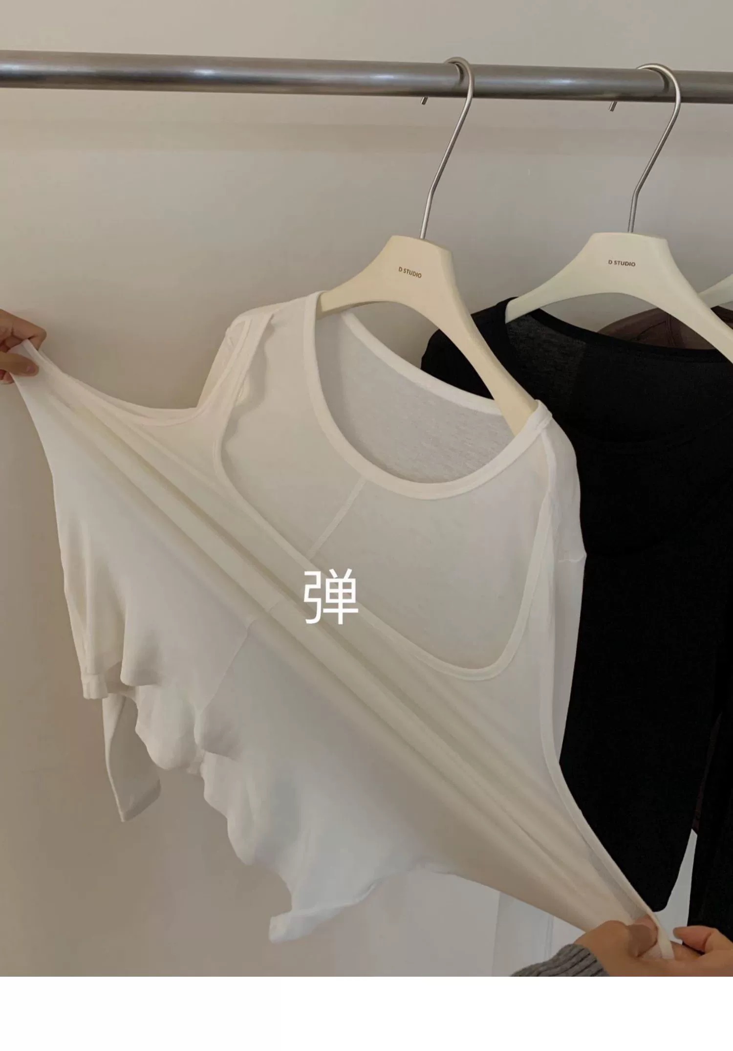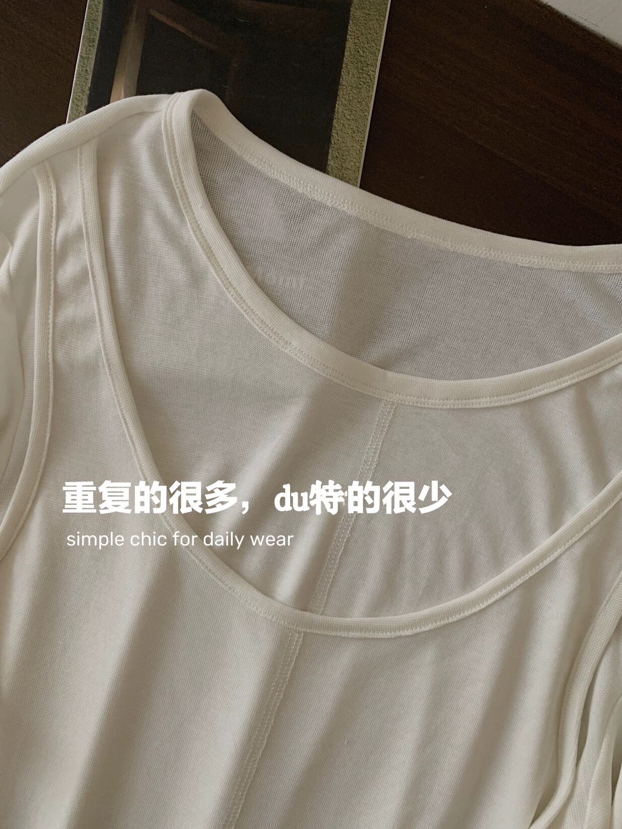 简约的T很多,但有别致设计感的很少。这款前片做了假两件叠搭的设计,一扫常规T的平庸感,穿上就很有造型的感觉。面料弹力灰常大,其实不怎么挑身材,不紧绷,但修身 ,也能藏肉肉。