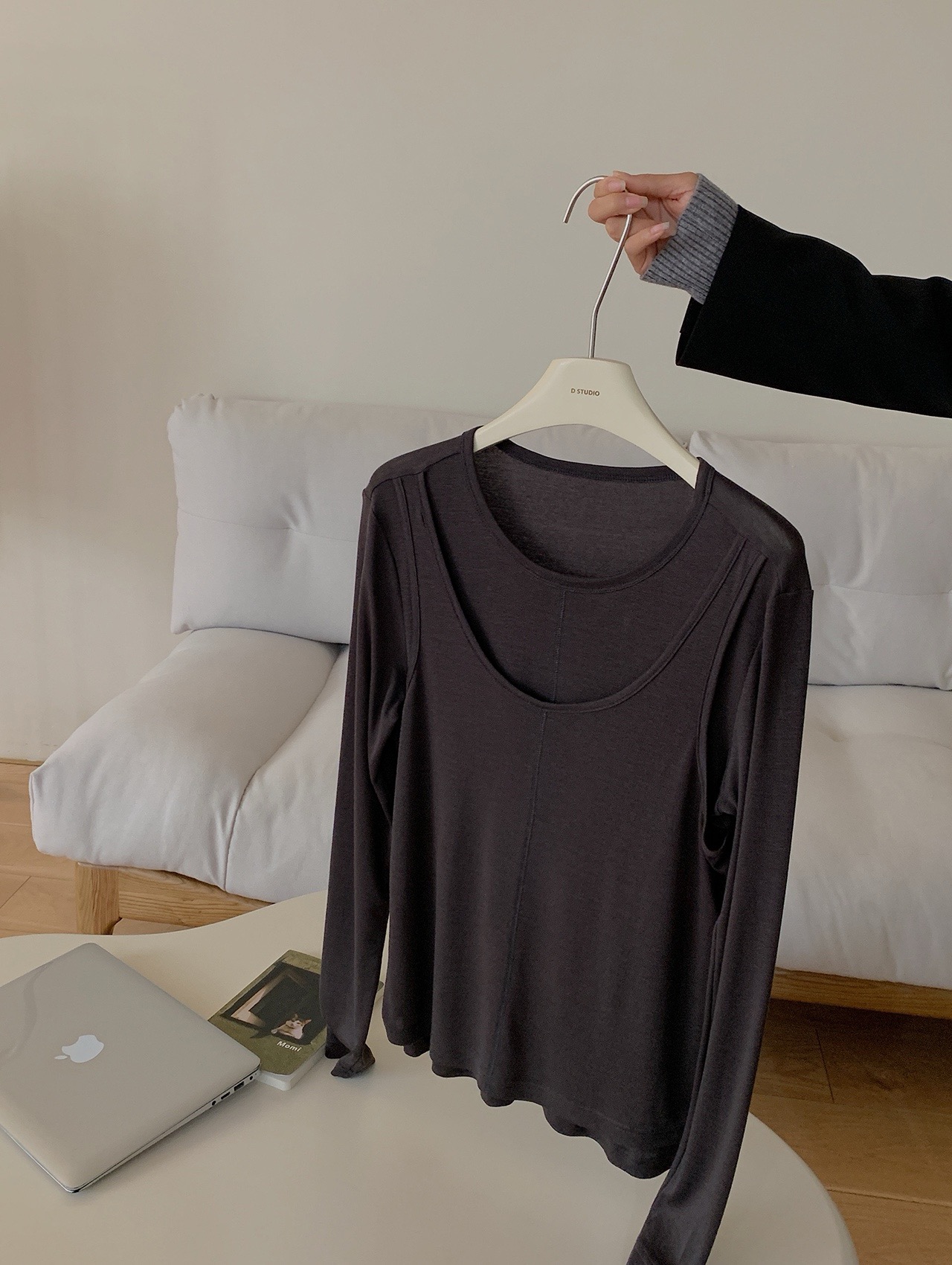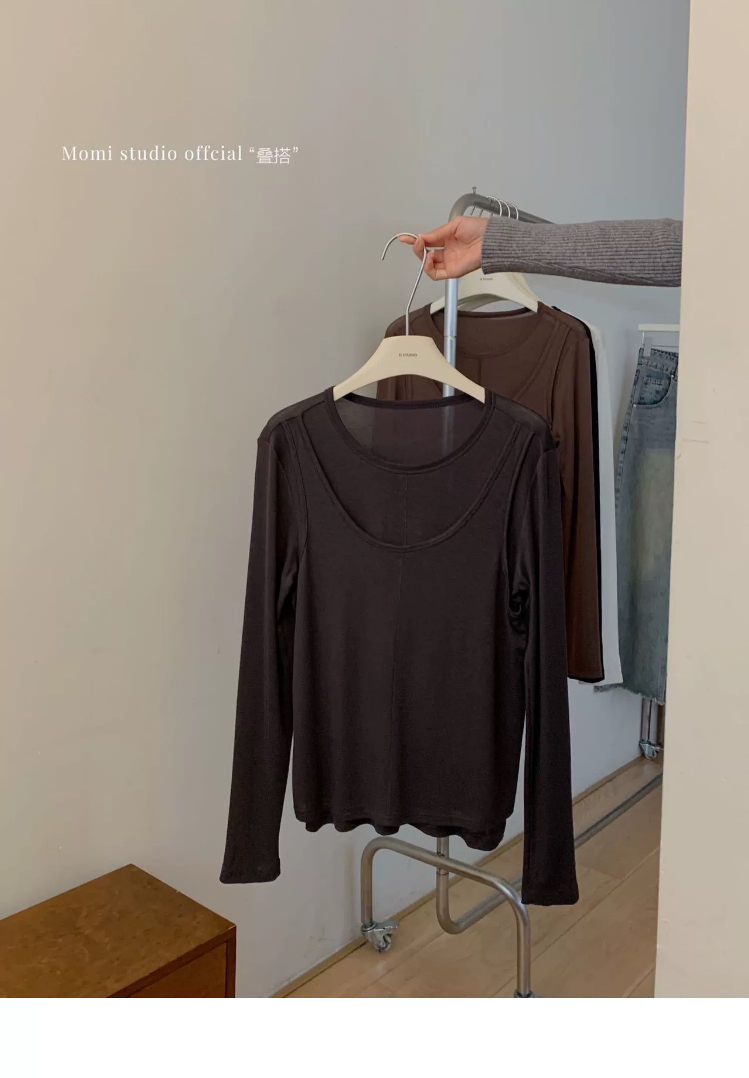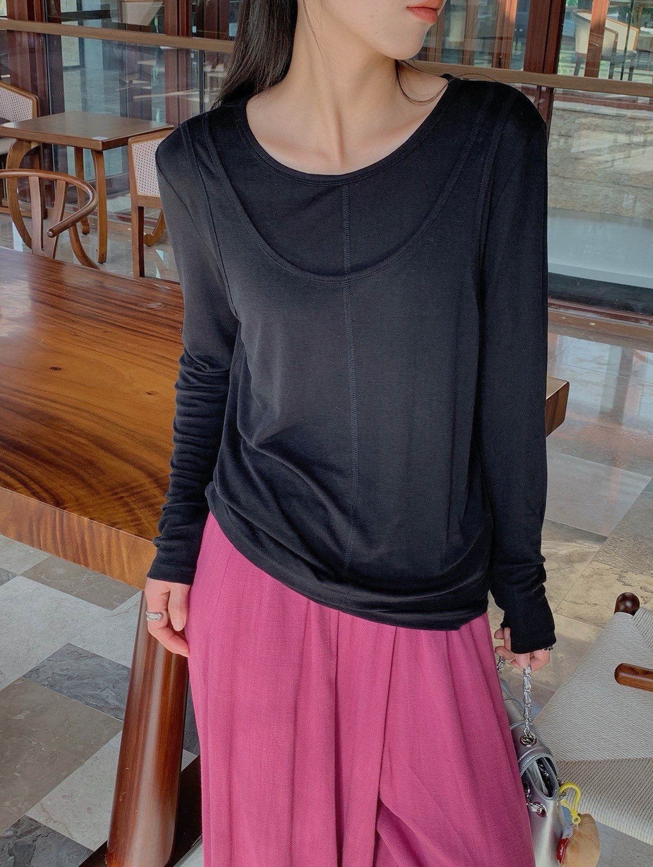 简约的T很多,但有别致设计感的很少。这款前片做了假两件叠搭的设计,一扫常规T的平庸感,穿上就很有造型的感觉。面料弹力灰常大,其实不怎么挑身材,不紧绷,但修身 ,也能藏肉肉。