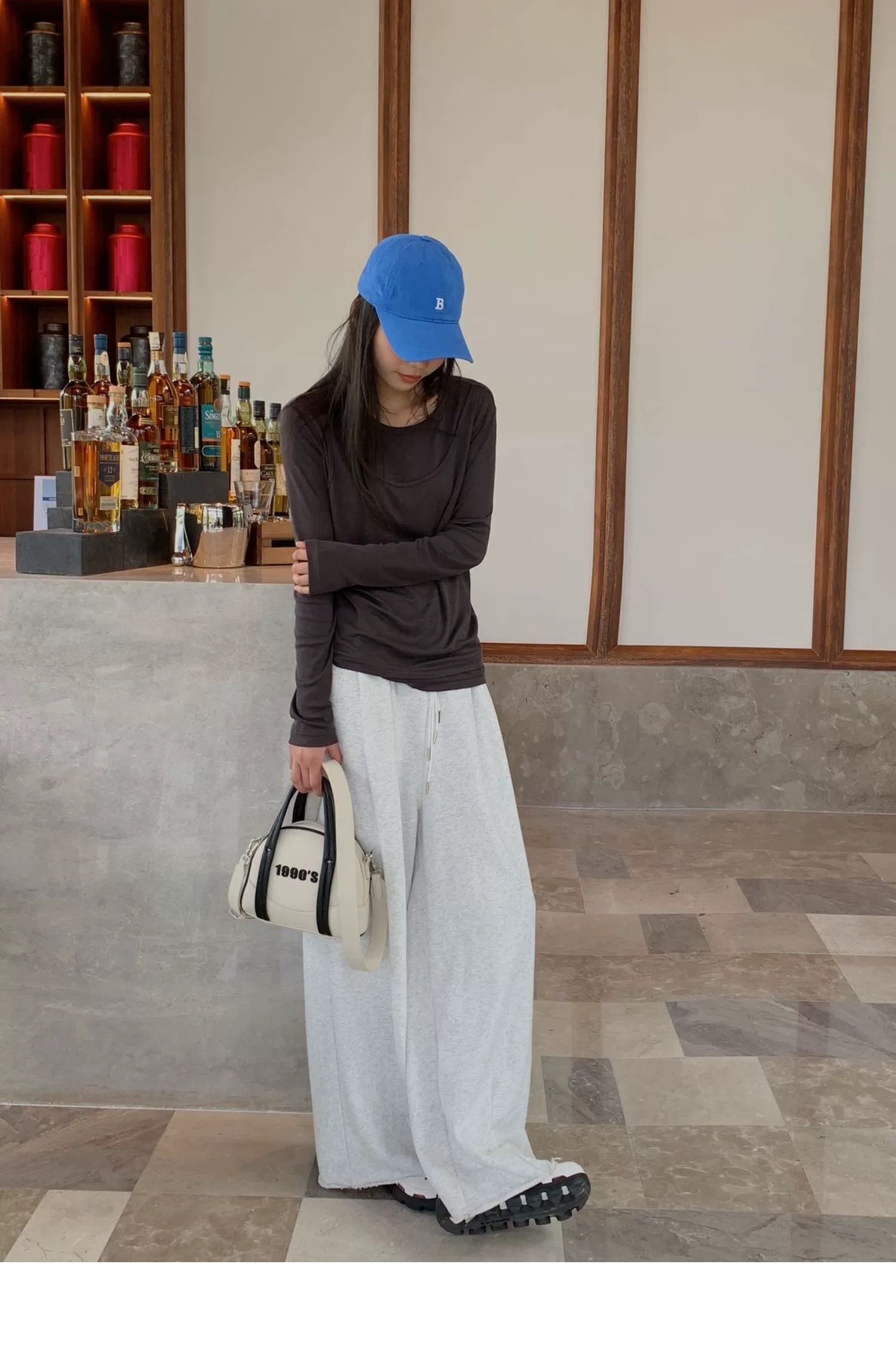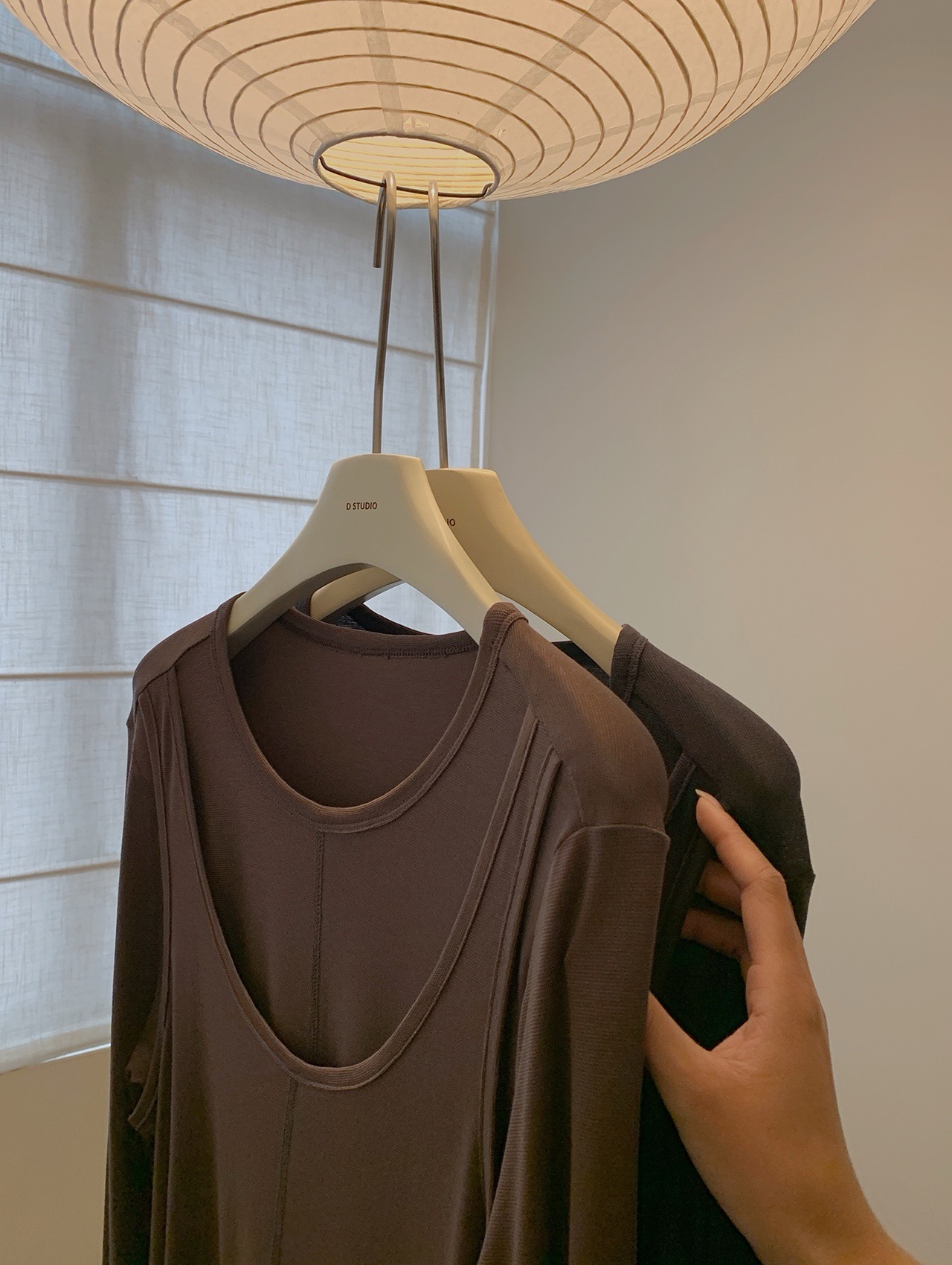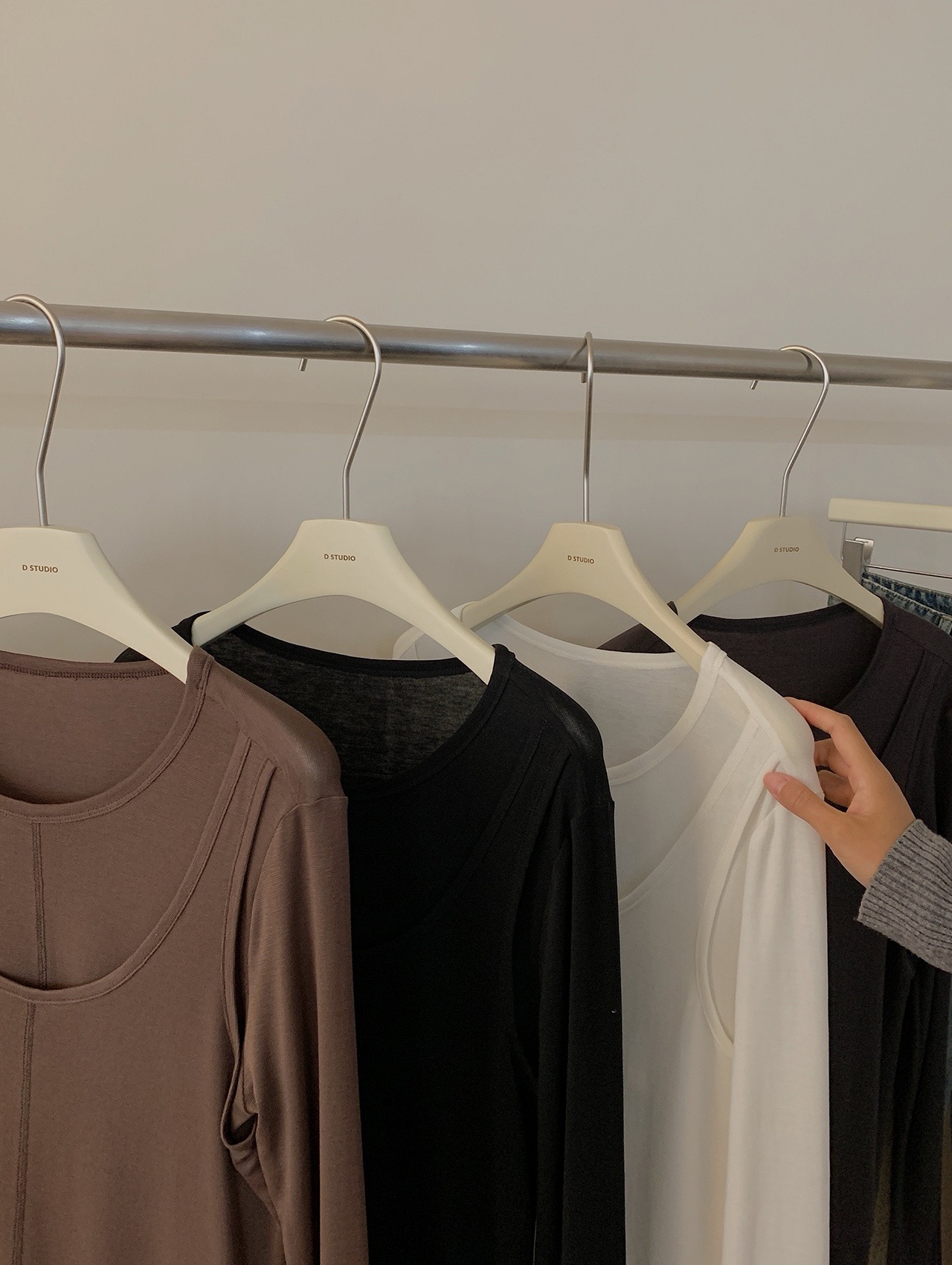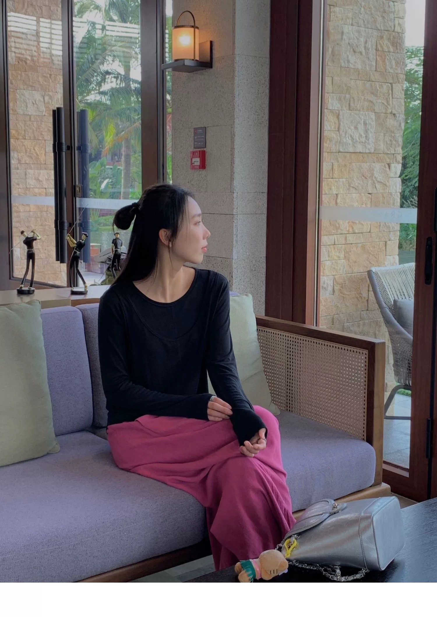 简约的T很多,但有别致设计感的很少。这款前片做了假两件叠搭的设计,一扫常规T的平庸感,穿上就很有造型的感觉。面料弹力灰常大,其实不怎么挑身材,不紧绷,但修身 ,也能藏肉肉。