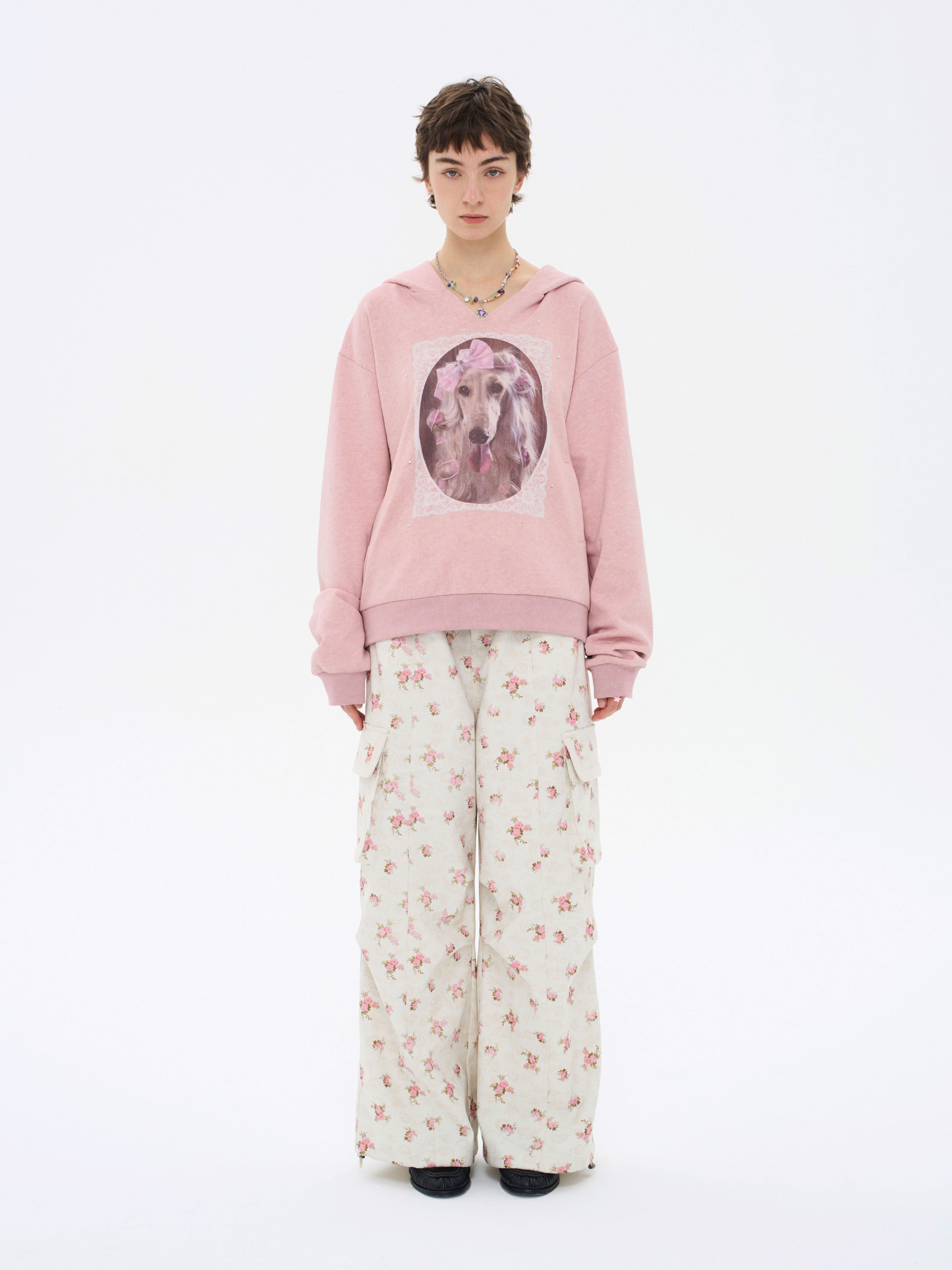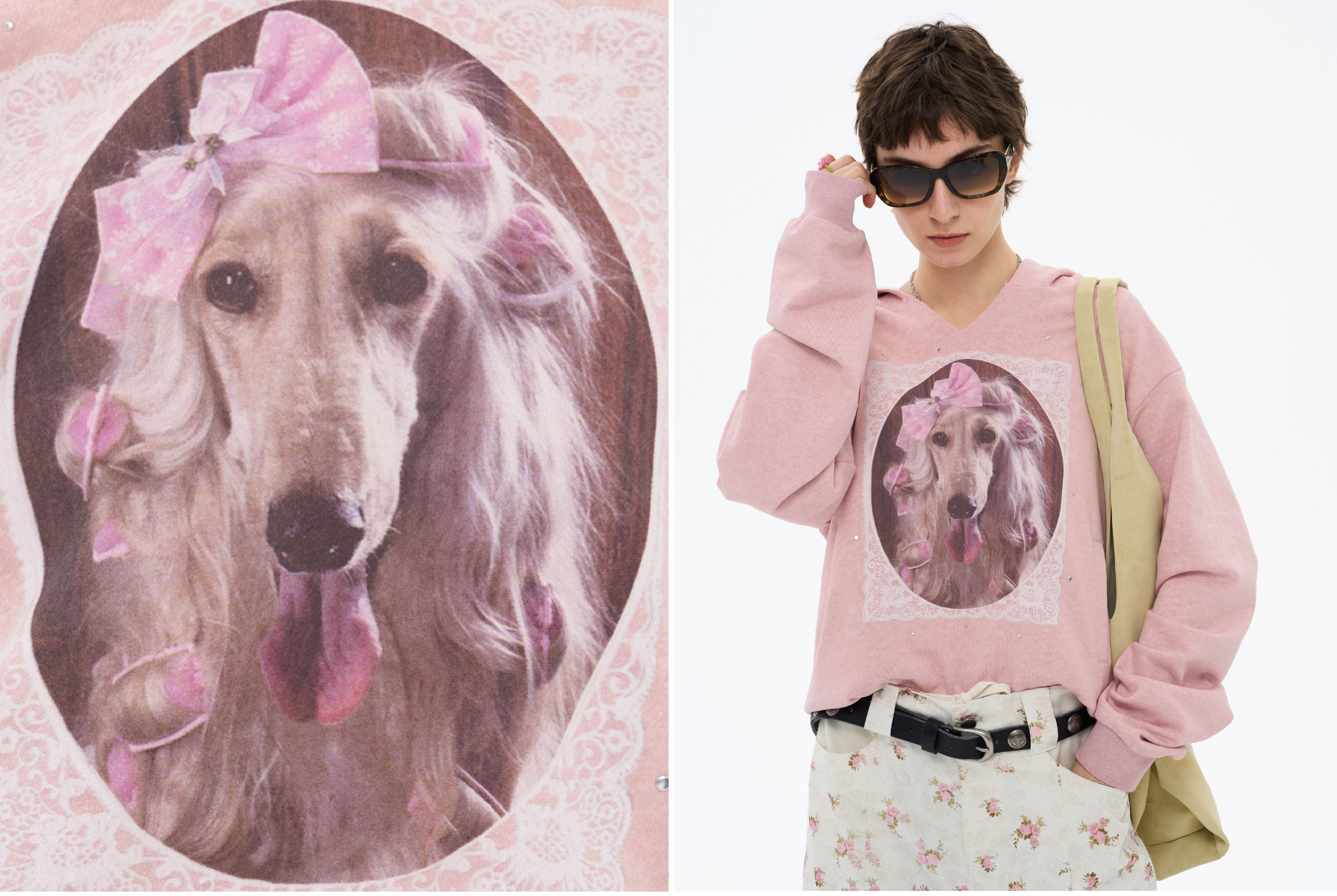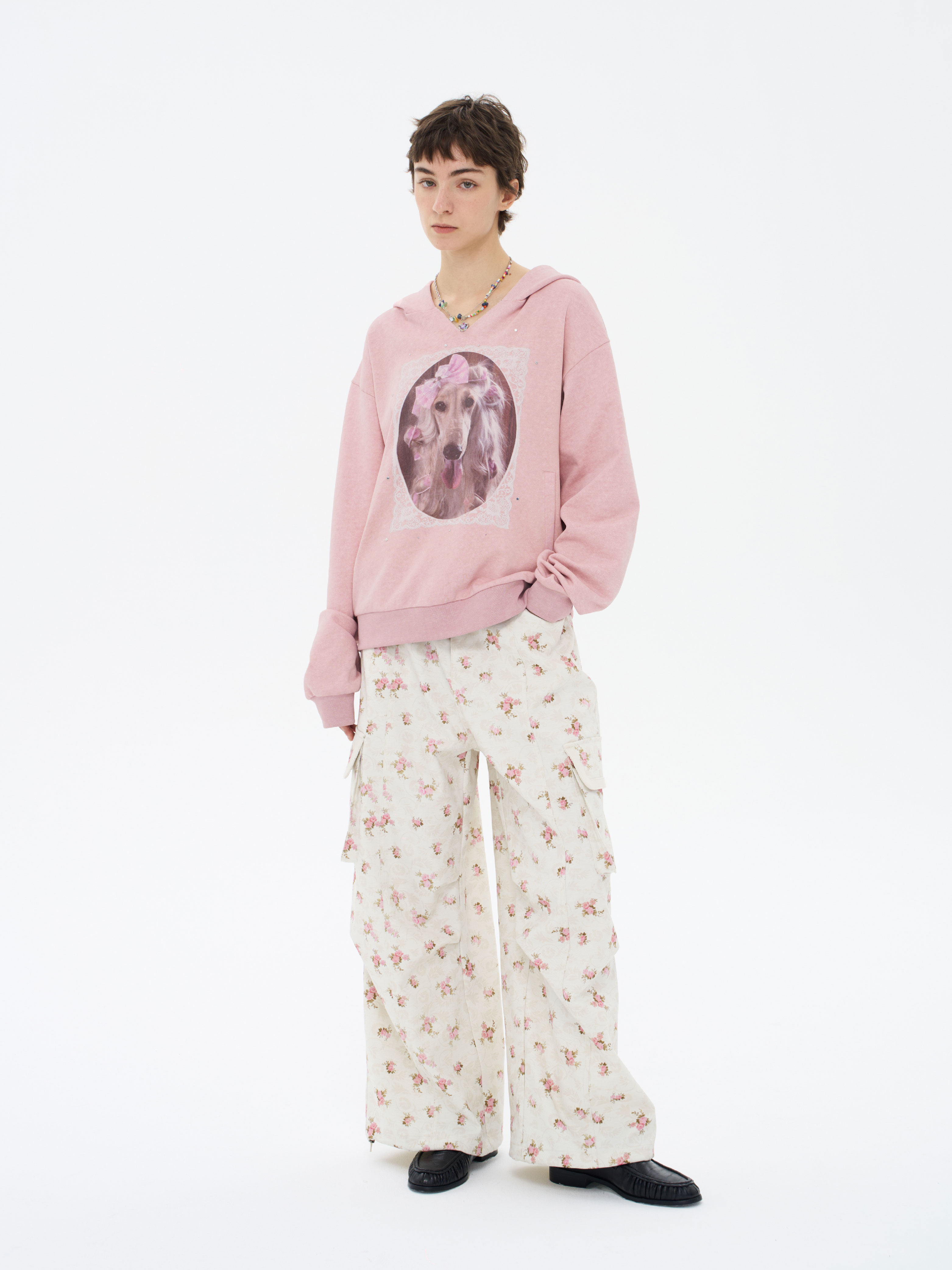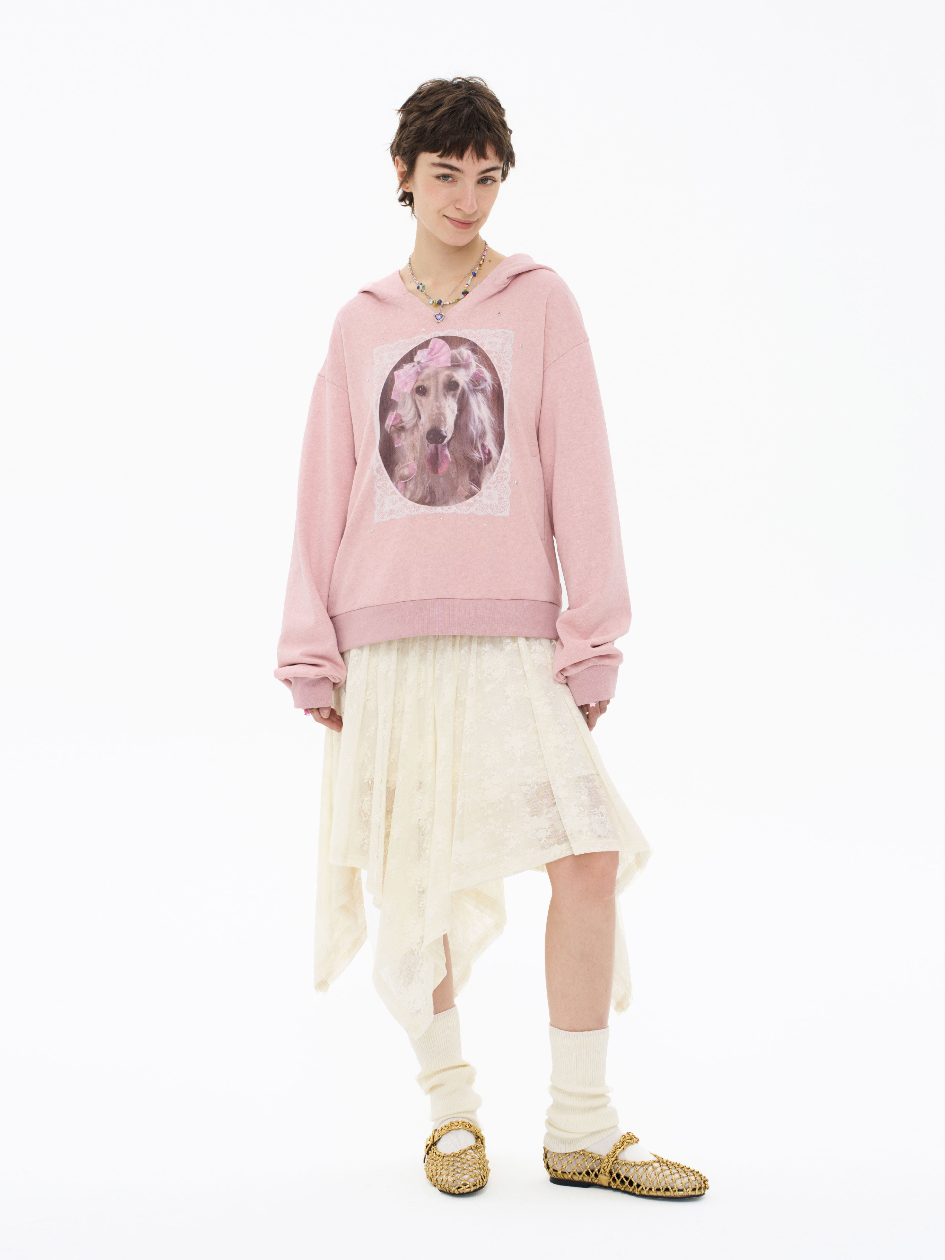 local tag/lt26ssk21/蕾丝小狗画像 印花烫钉做旧卫衣