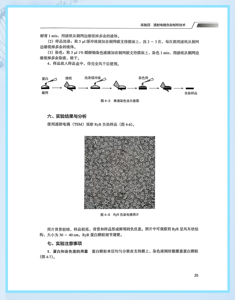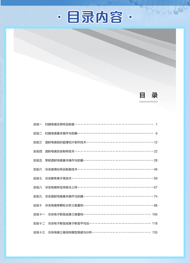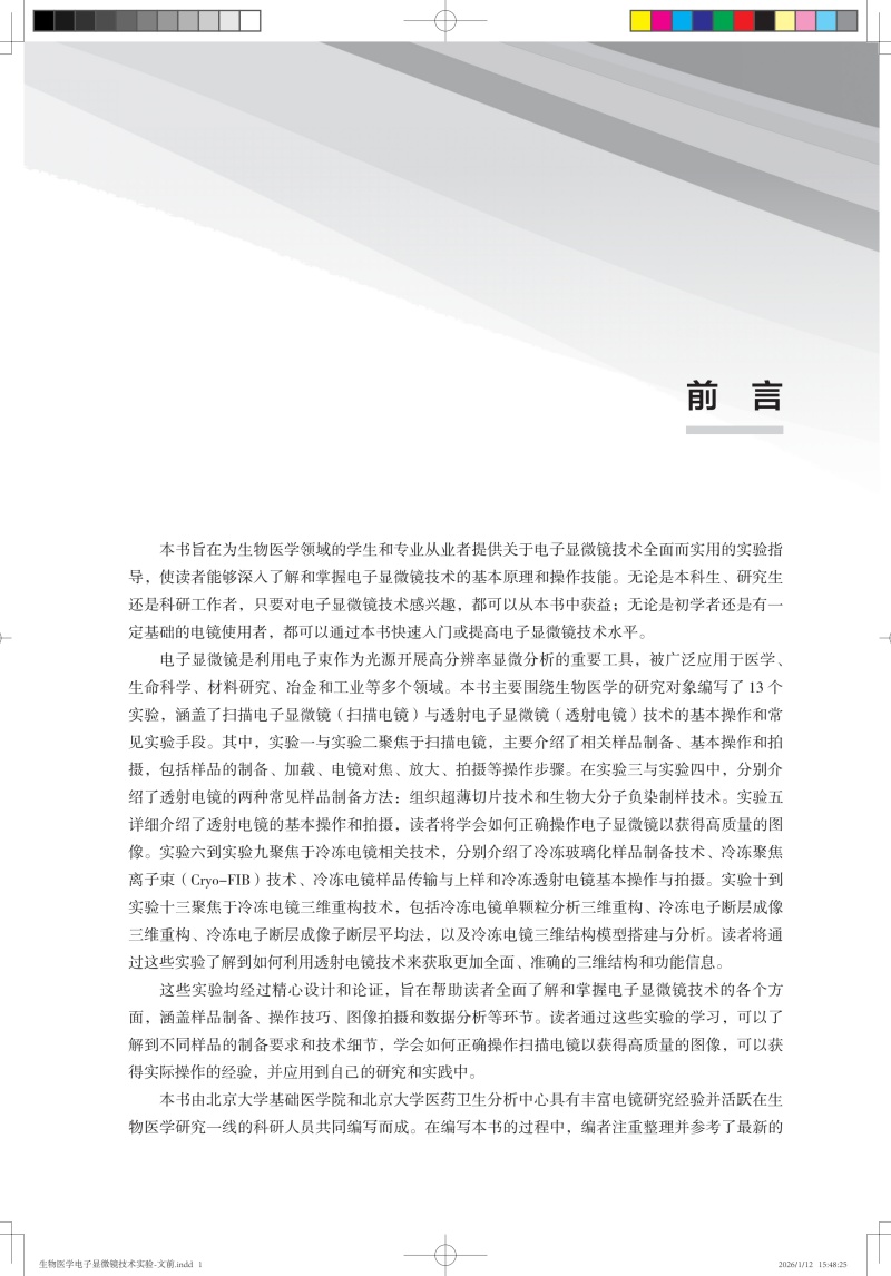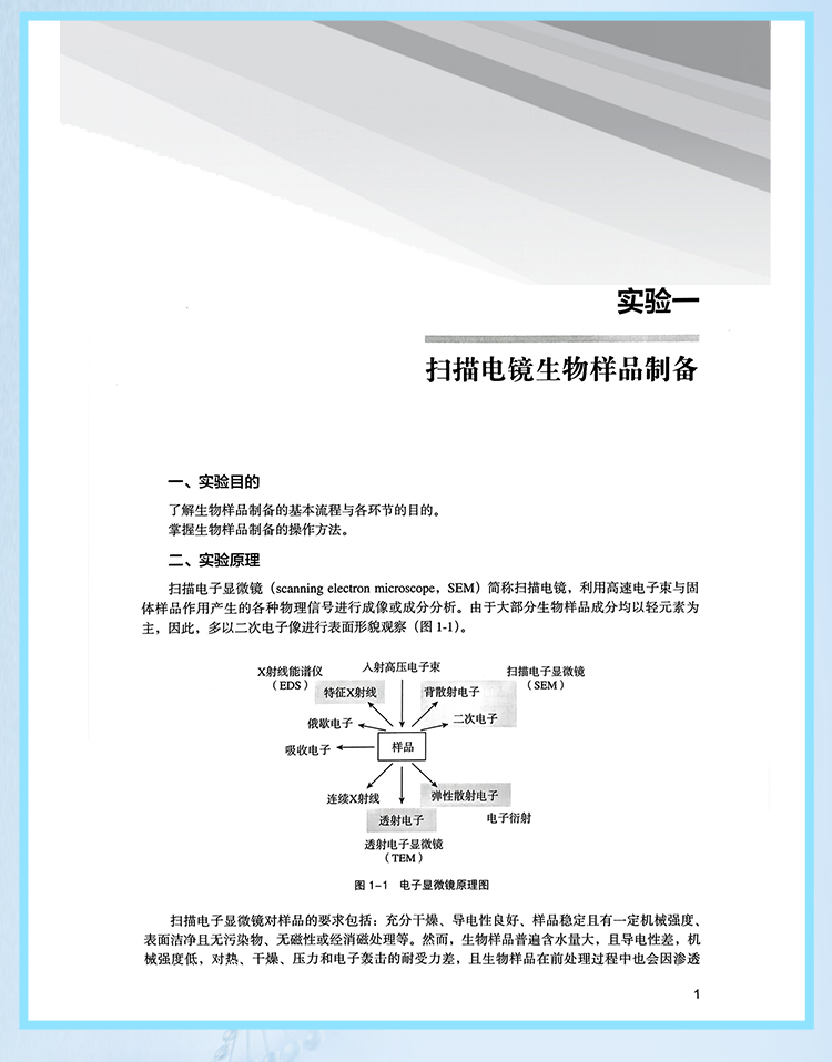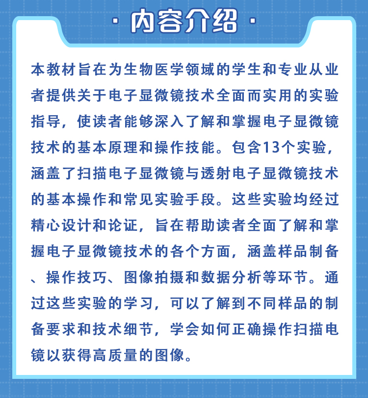 本教材旨在为生物医学领域的学生和专业从业者提供关于电子显微镜技术全面而实用的实验指导,使读者能够深入了解和掌握电子显微镜技术的基本原理和操作技能。包含13个实验,涵盖了扫描电子显微镜与透射电子显微镜技术的基本操作和常见实验手段。这些实验均经过精心设计和论证,旨在帮助读者全面了解和掌握电子显微镜技术的各个方面,涵盖样品制备、操作技巧、图像拍摄和数据分析等环节。通过这些实验的学习,可以了解到不同样品的制备要求和技术细节,学会如何正确操作扫描电镜以获得高质量的图像。