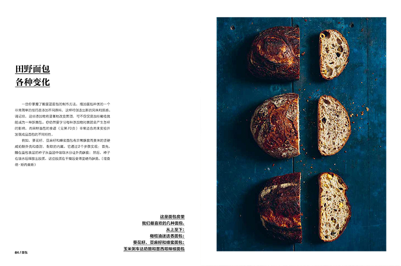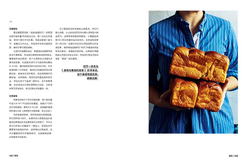 3.50+食谱,涵盖面包(如田野面包、纽约熟食面包、法式长棍、北欧面包等)、黄油(发酵黄油、发酵法式酸奶油、黄油酱汁、酥油等)、面包与黄油结合的美食(三明治、面包酱等)、利用剩面包制作的美味的食谱(意大利面包沙拉、番茄面包汤、面包布丁等);同时,作者还介绍了全世界49种主流面包和14种特色黄油的历史、来源与文化。
