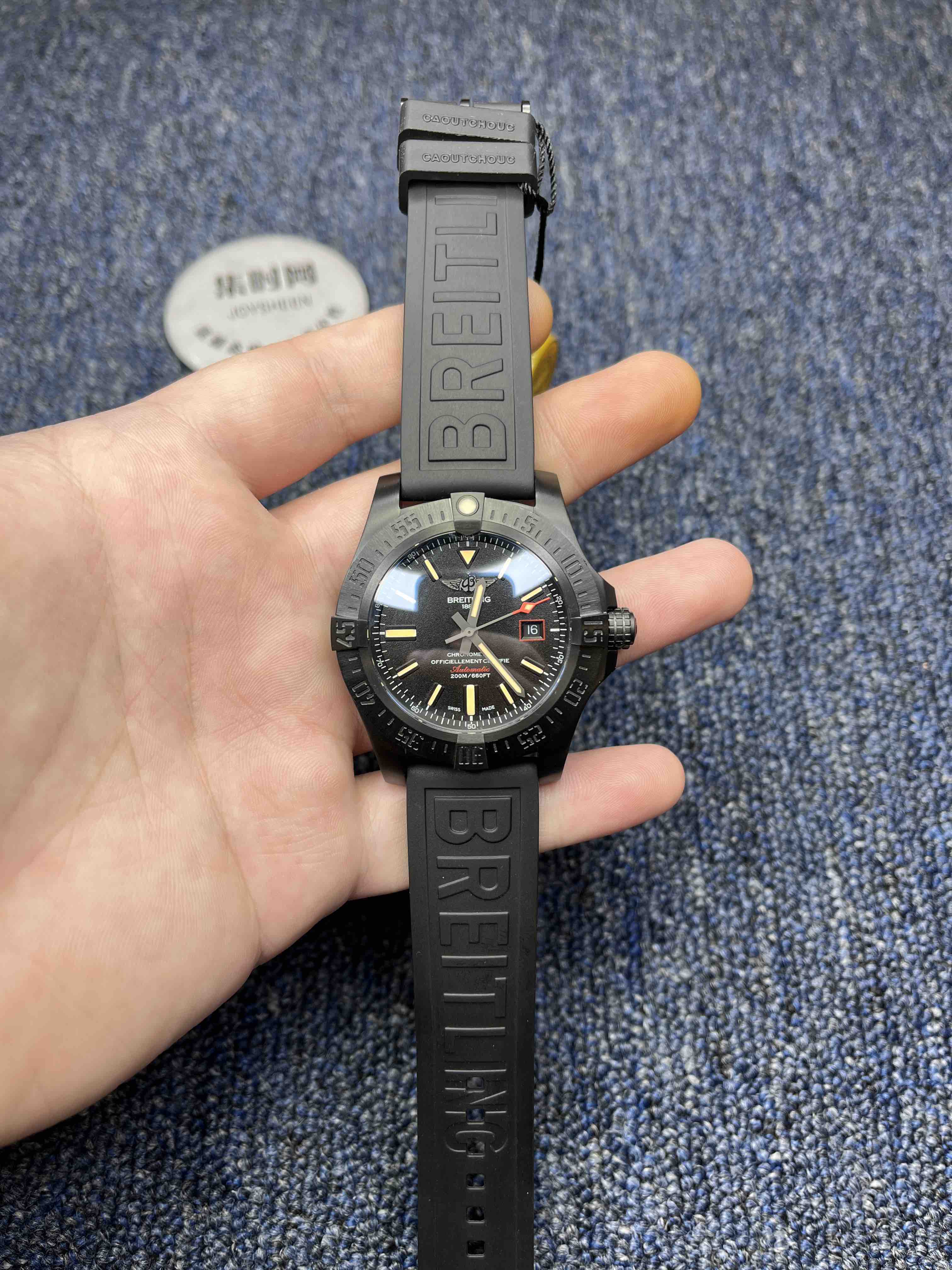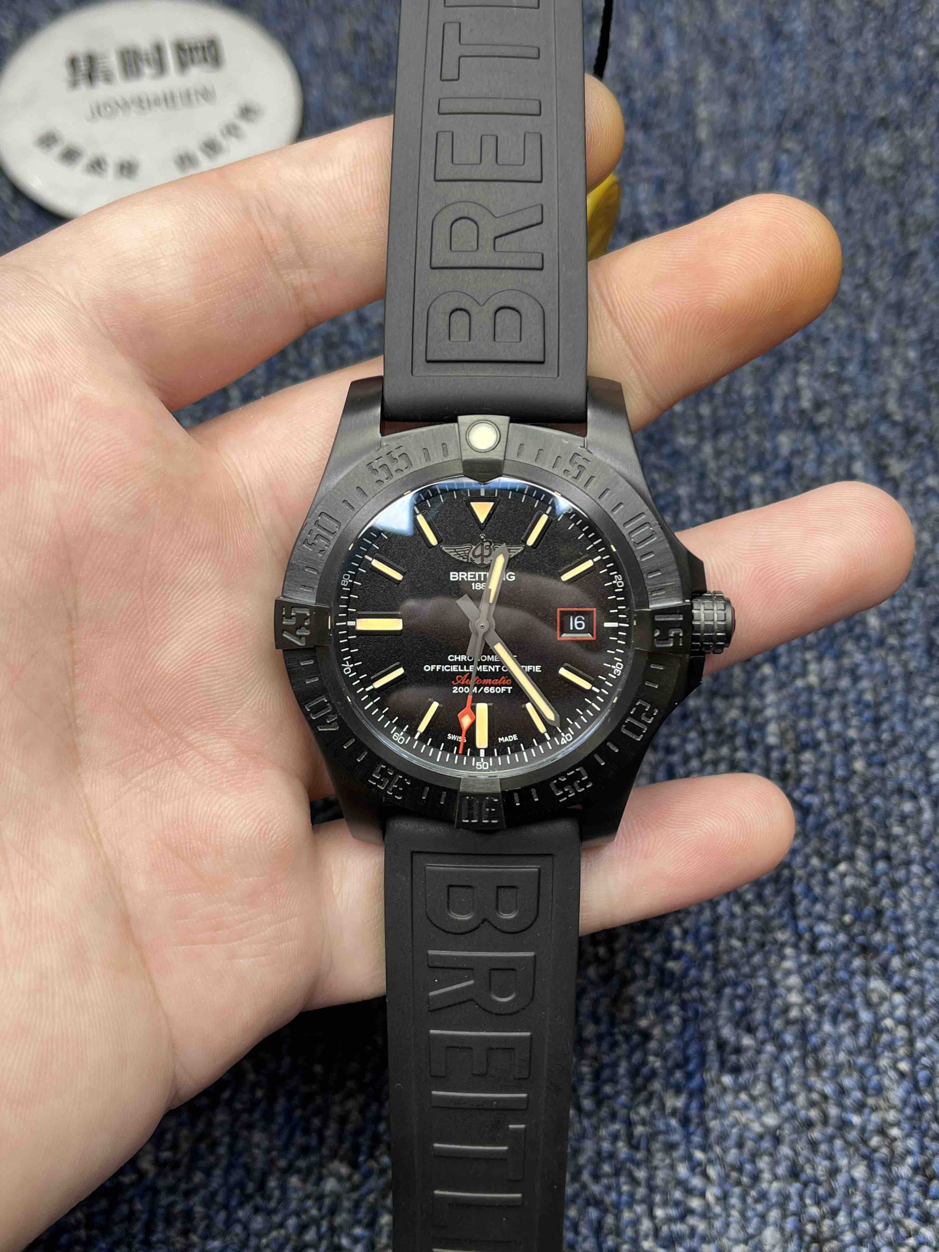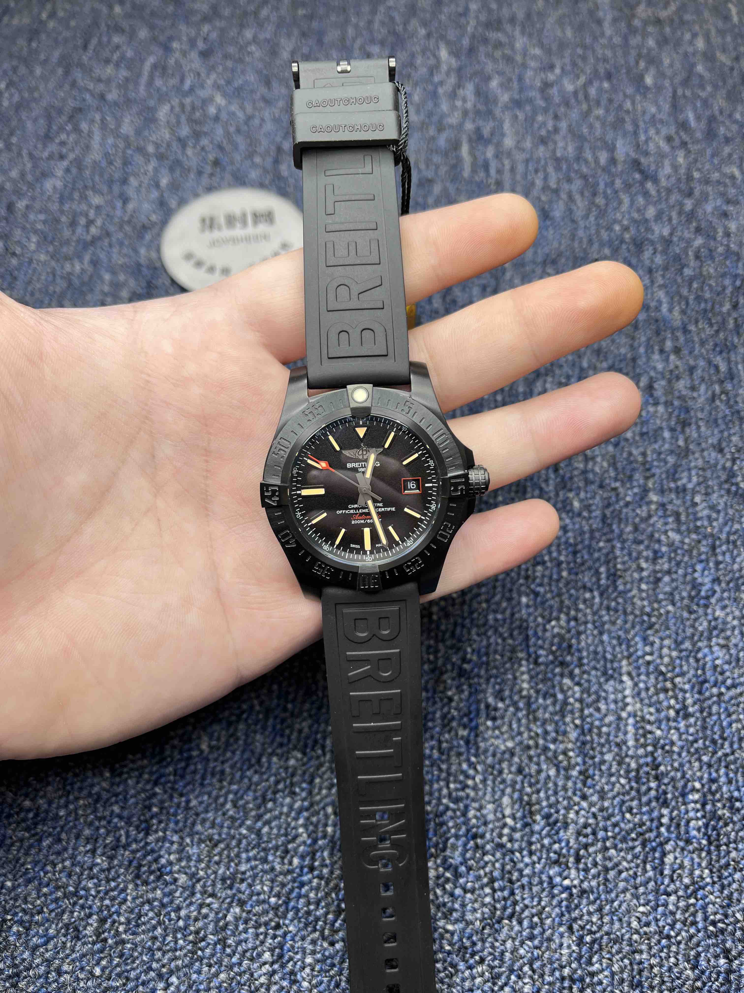 【表壳】44mmX12.7mm吻合原装尺寸,深枪色的壳套镀层采用真空离子电镀技术(用高压把颜色压进钛合金里)增加镀层的密度,硬度,使腕表具备克服一切艰难环境的素质。圈口的夜光珠颜色同步正品,夜光珠外镶贴一片蓝宝石水晶玻璃,工艺和材质同步原装。