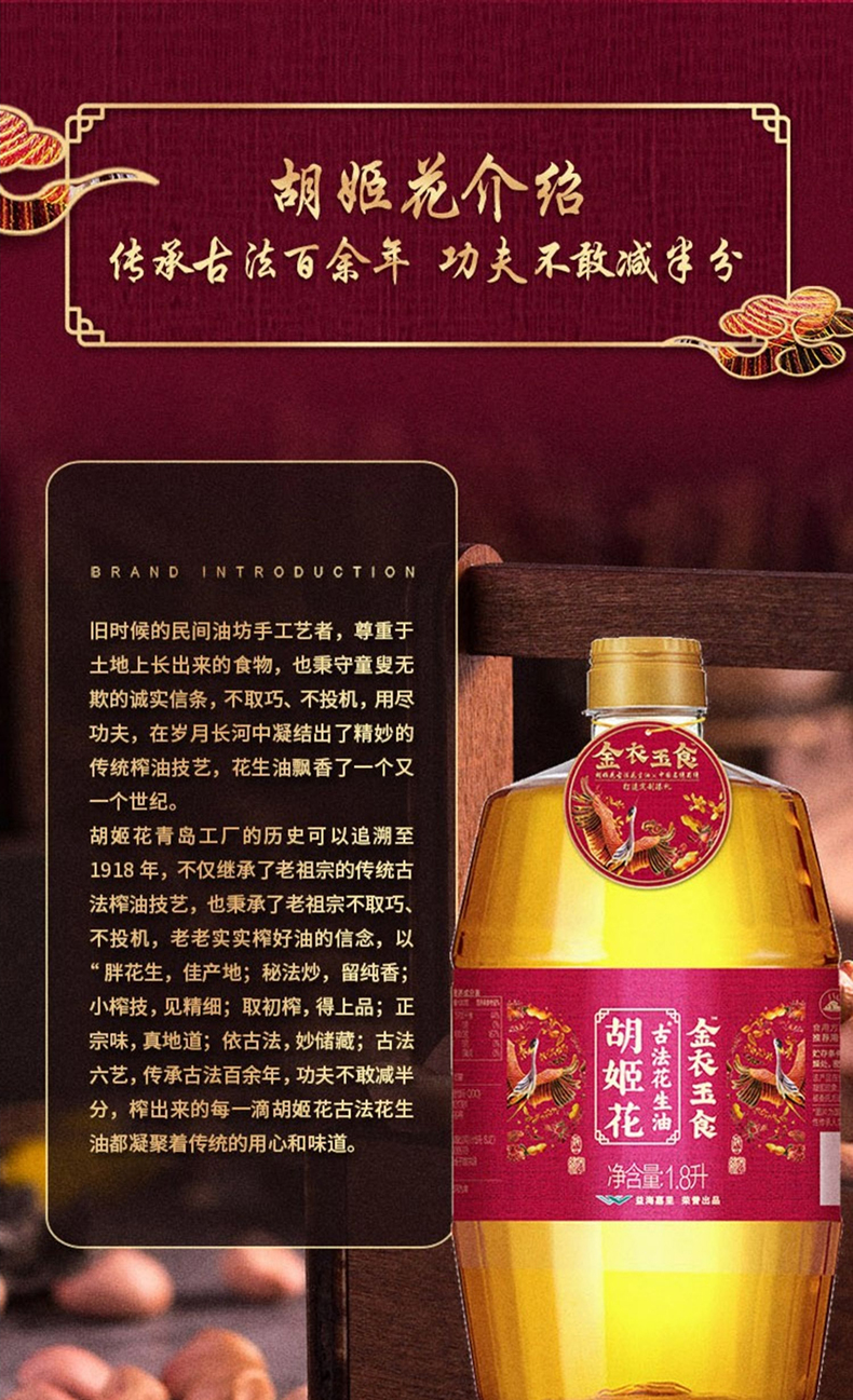 胡姬花金衣玉食古法小榨花生油1.8L*2瓶一级压榨植物油