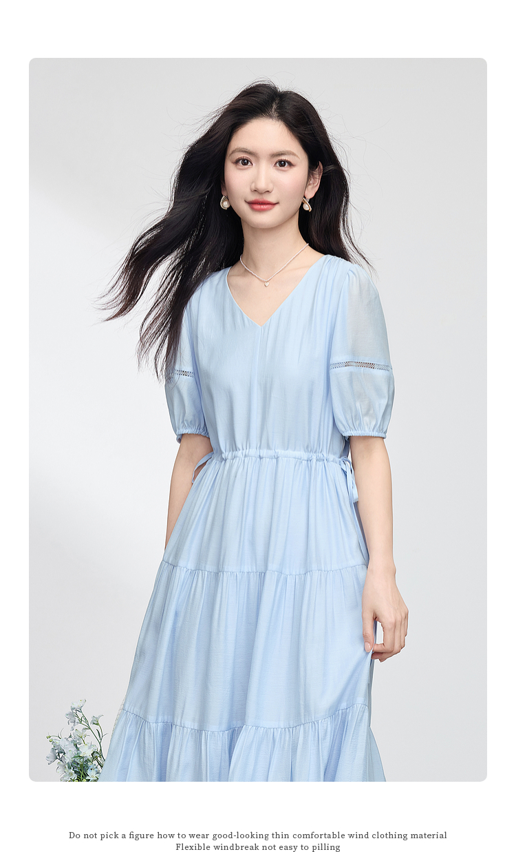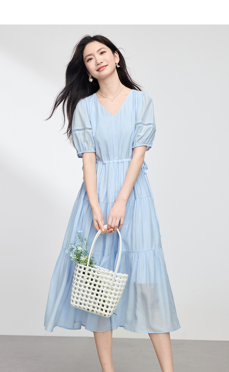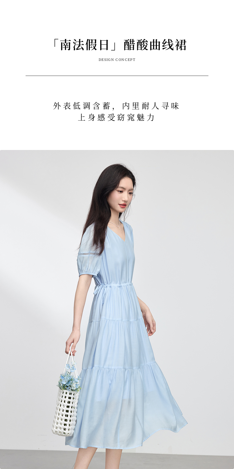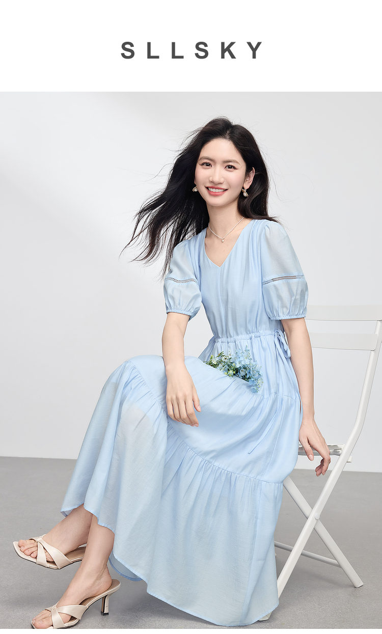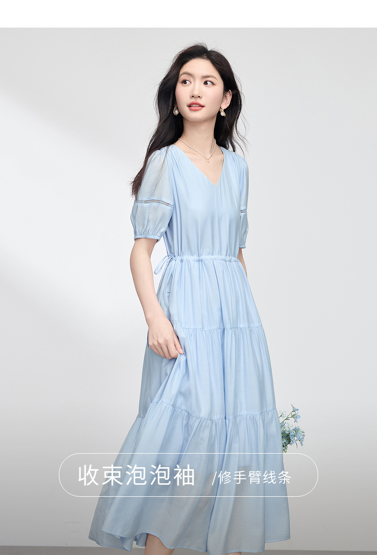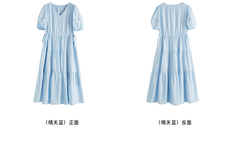 熙世界法式V领蓝色连衣裙女夏季气质收腰泡泡袖醋酸a字蛋糕裙子